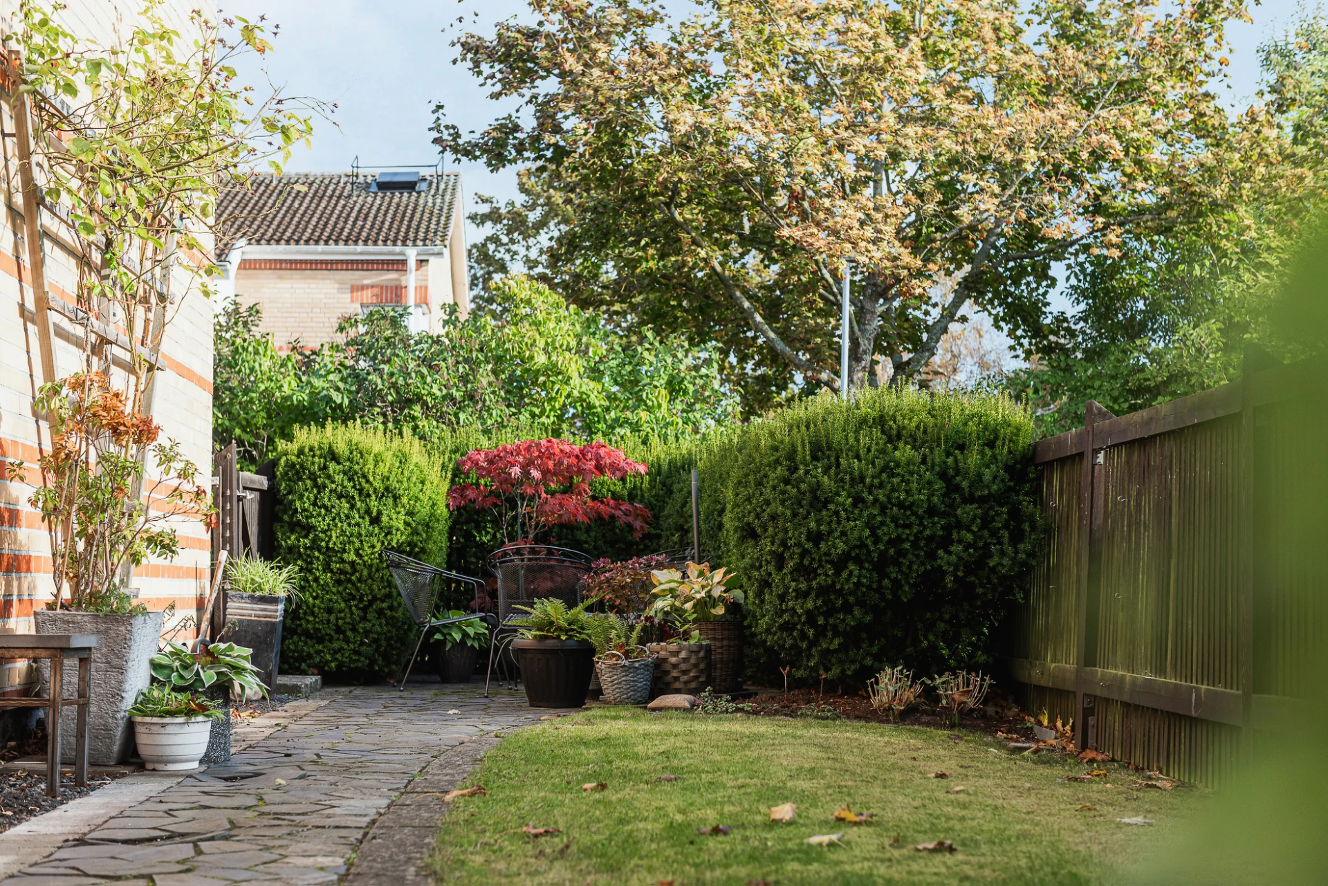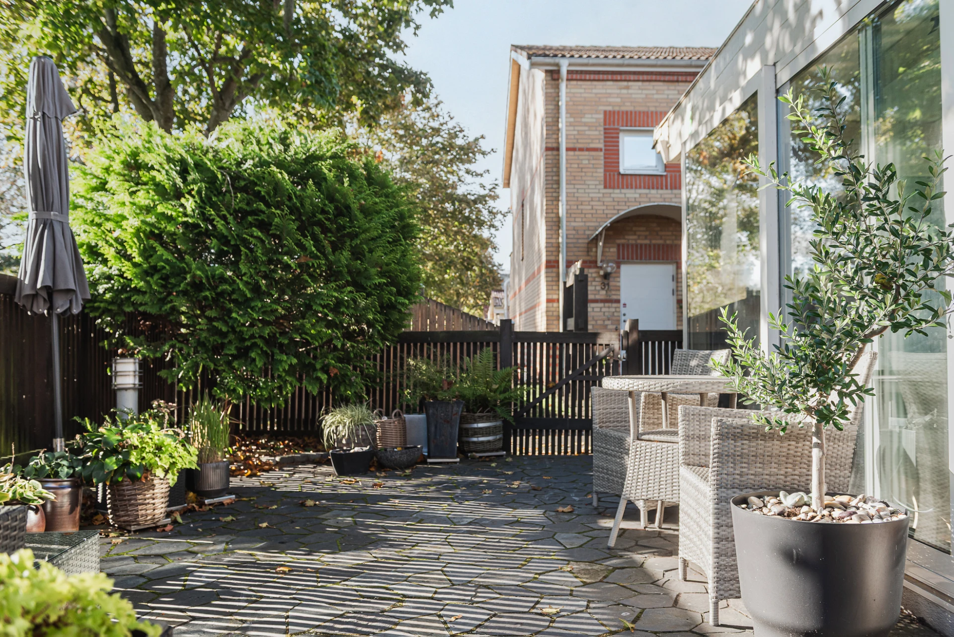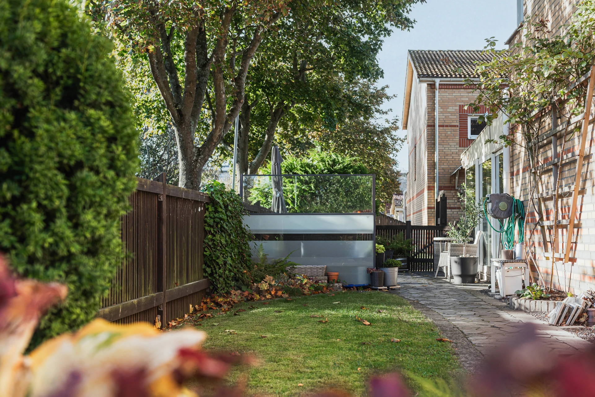 Inhägnad trädgård i sydost med stensatta uteplatser och mycket grönska. Enligt föreningens information brukas trädgården med nyttjanderätt.