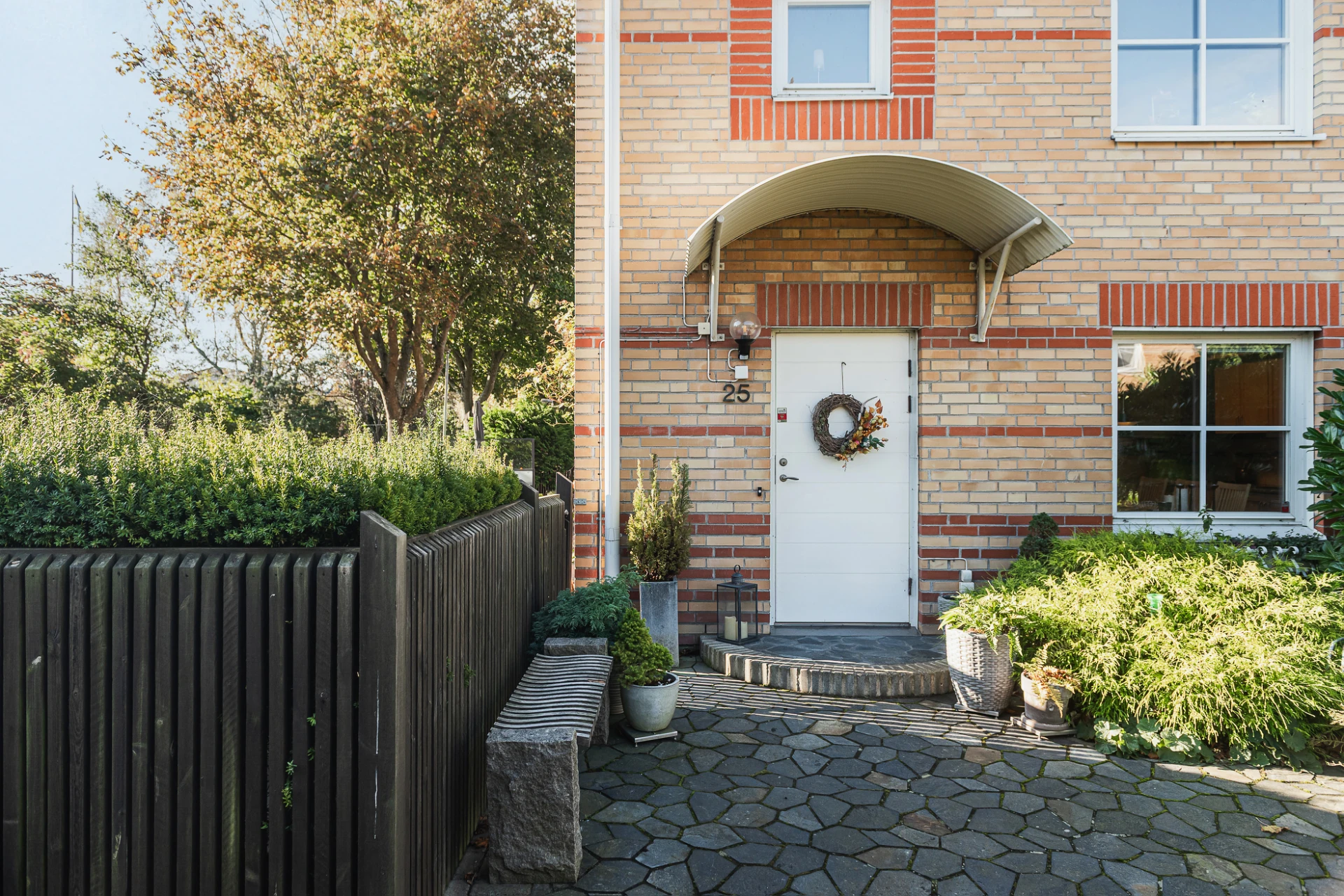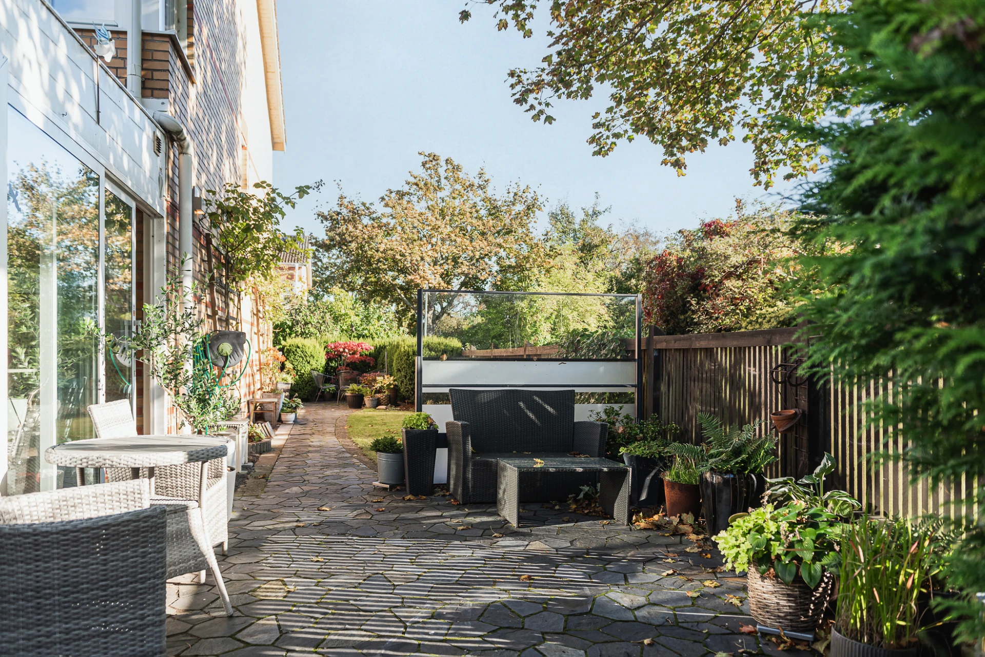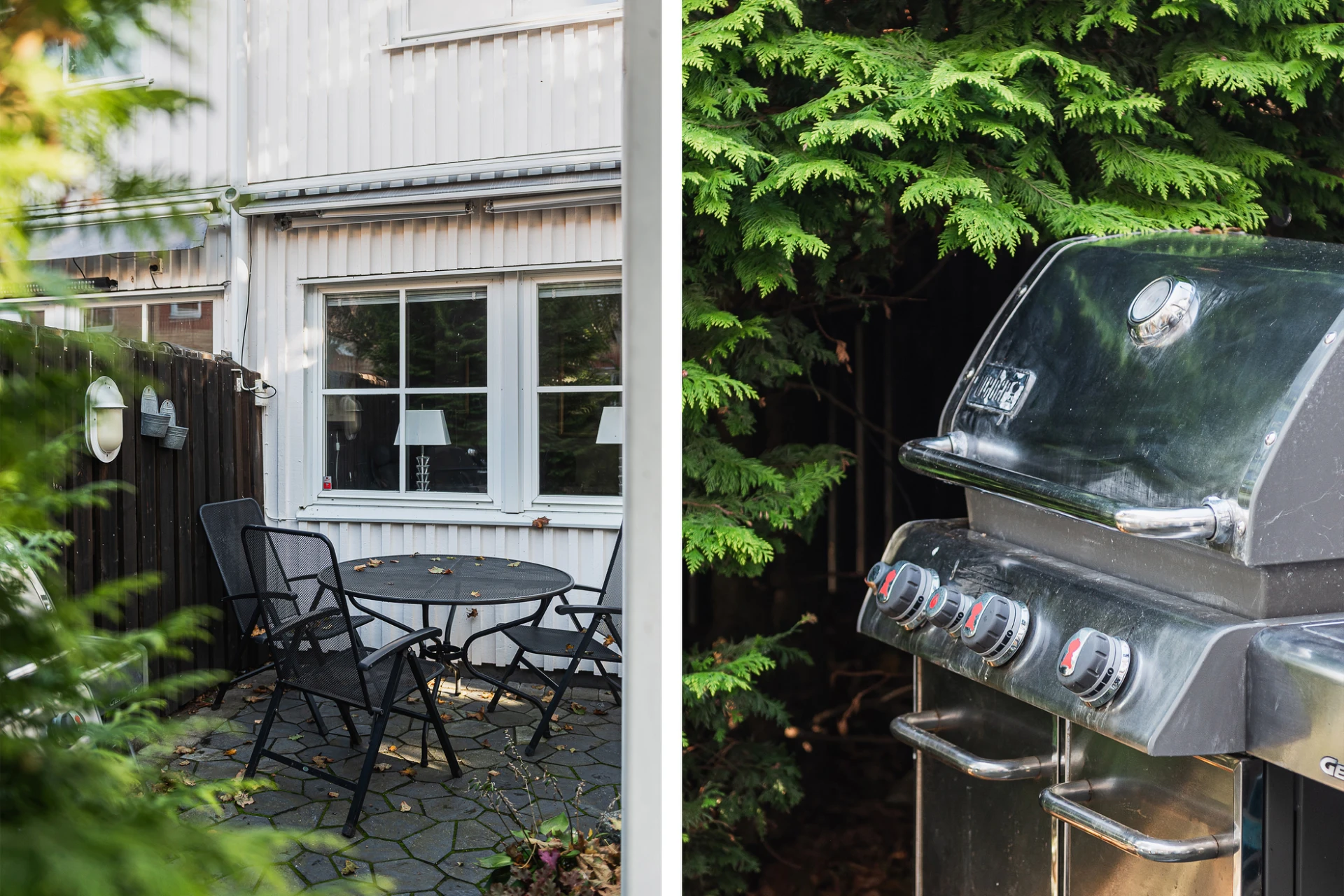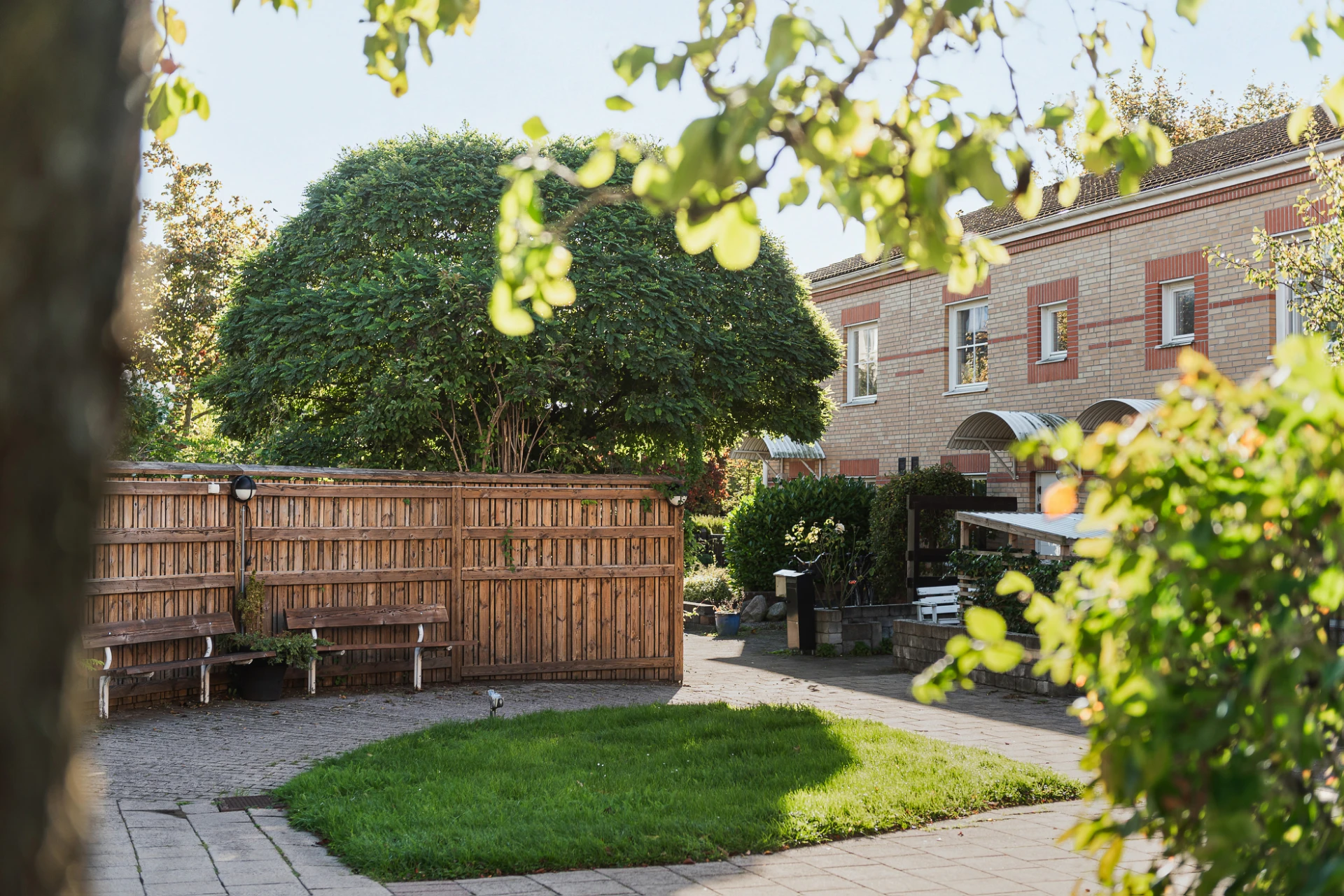 Inhägnad trädgård i sydost med stensatta uteplatser och mycket grönska. Enligt föreningens information brukas trädgården med nyttjanderätt.