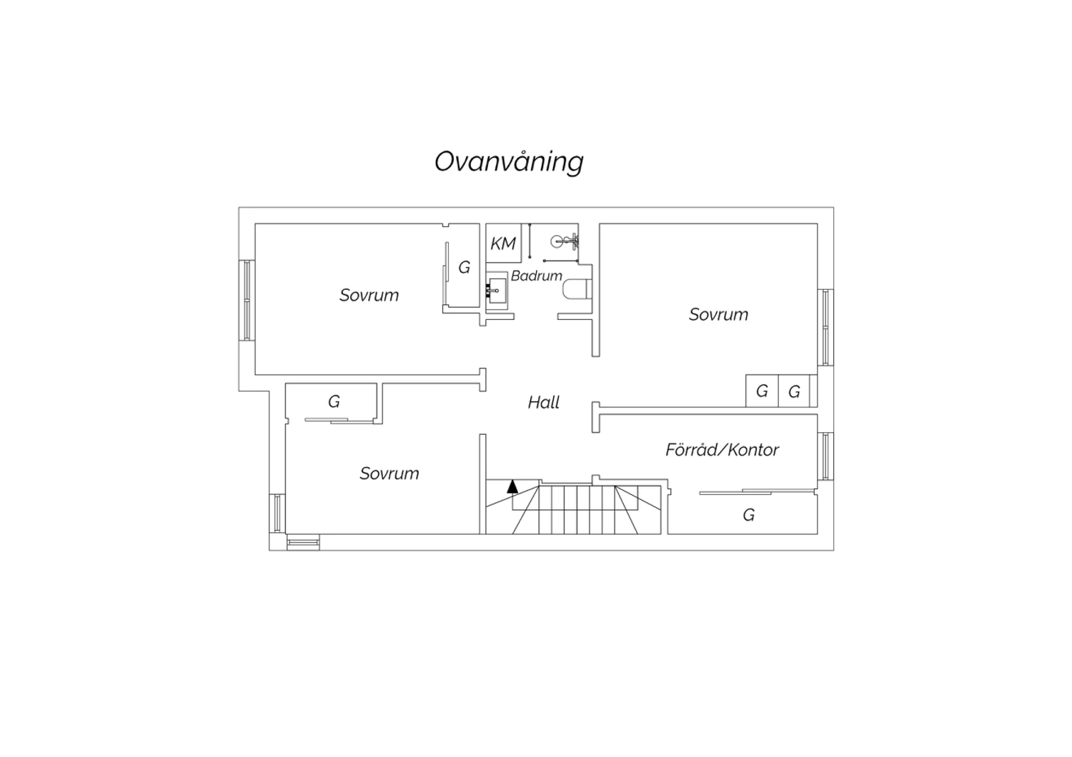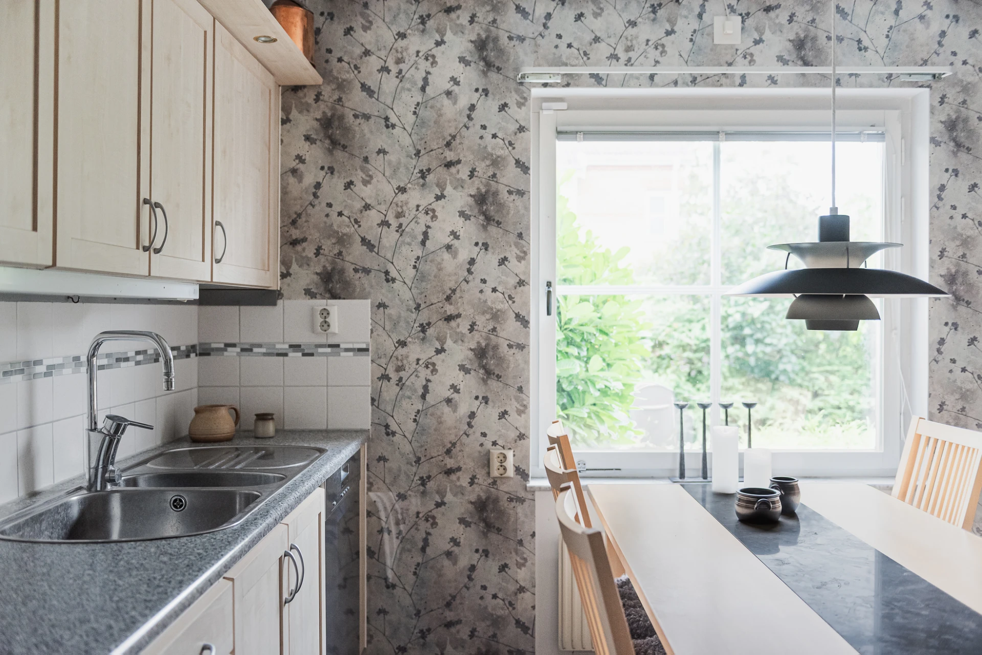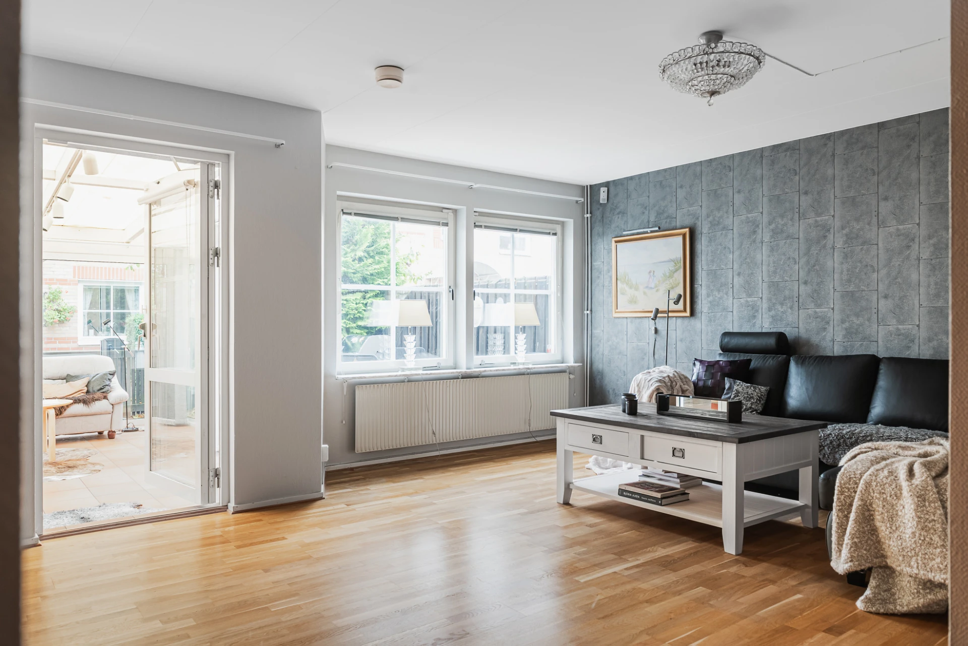 Parkettgolv och ljusa väggar med mönstrad tapet i grått. Utgång till uterum i sydväst.