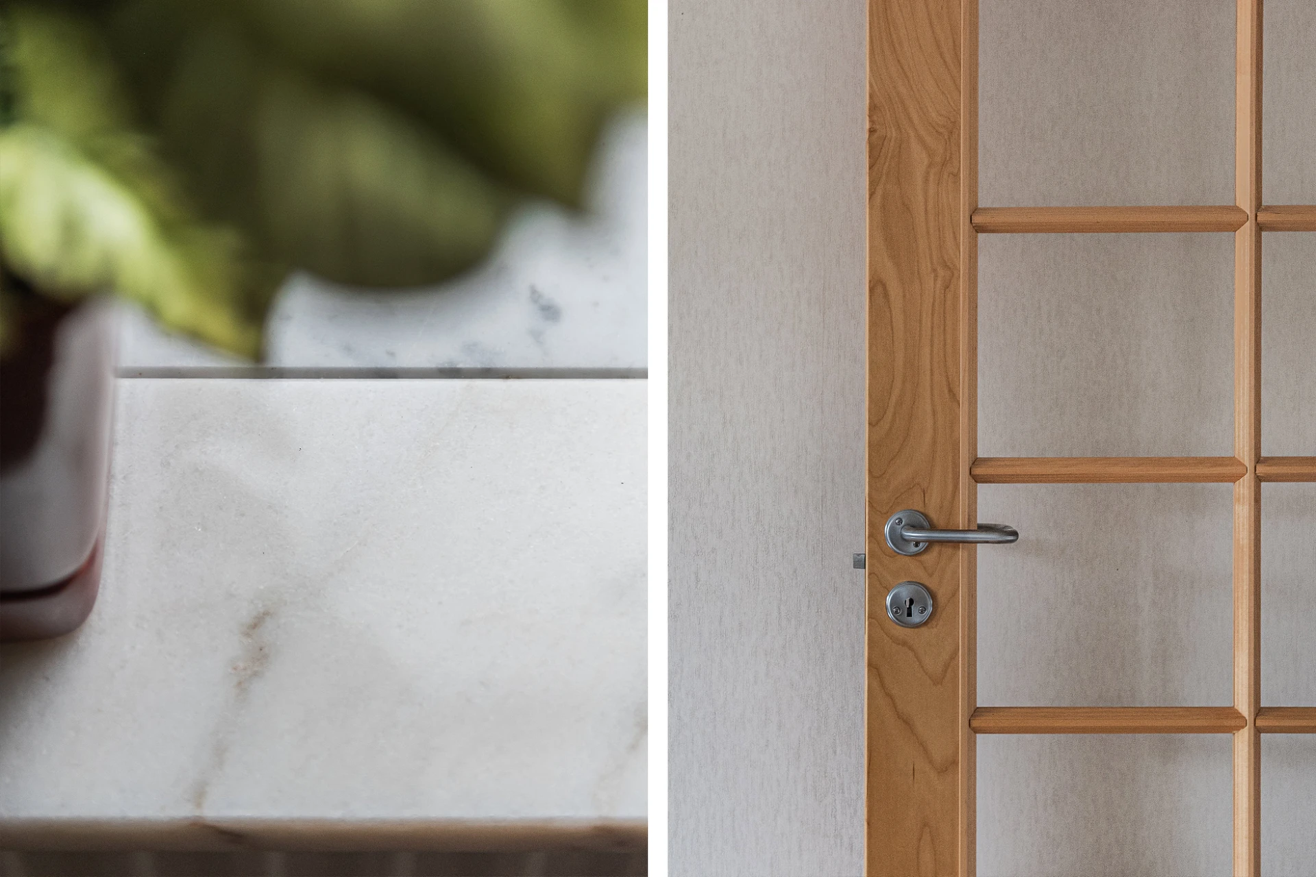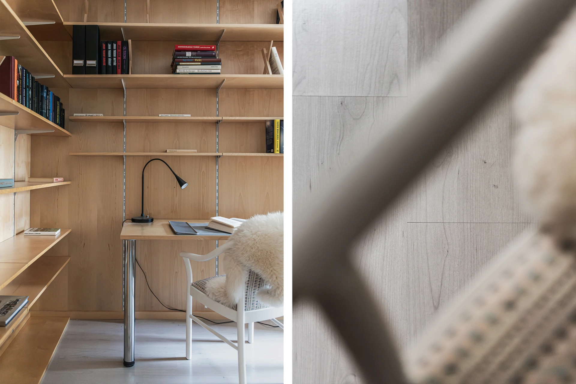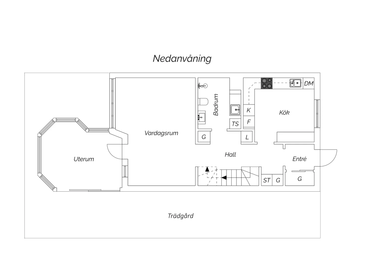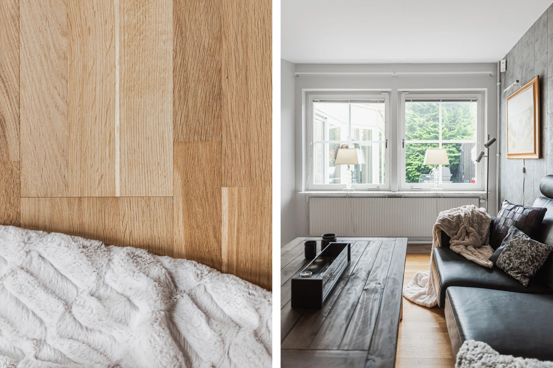 Parkettgolv och ljusa väggar med mönstrad tapet i grått. Utgång till uterum i sydväst.