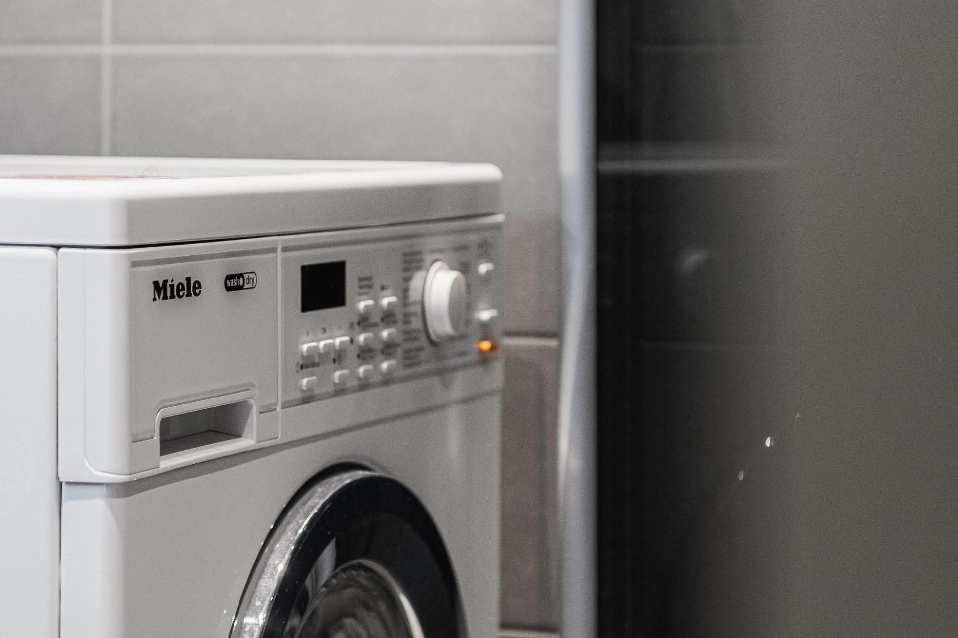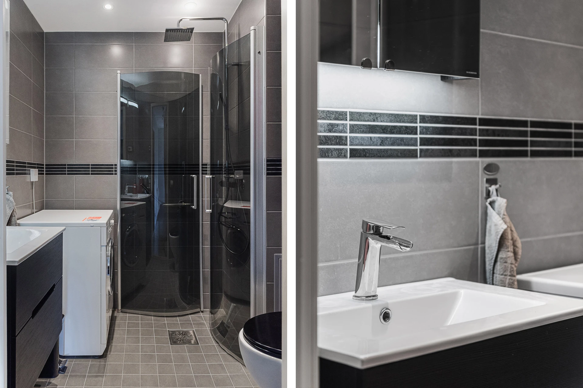 Grå klinker och grått samt svart kakel. Handfat med kommod, WC, kombinerad tvättmaskin/torktumlare, spegelskåp och takdusch med infällbara duschdörrar.