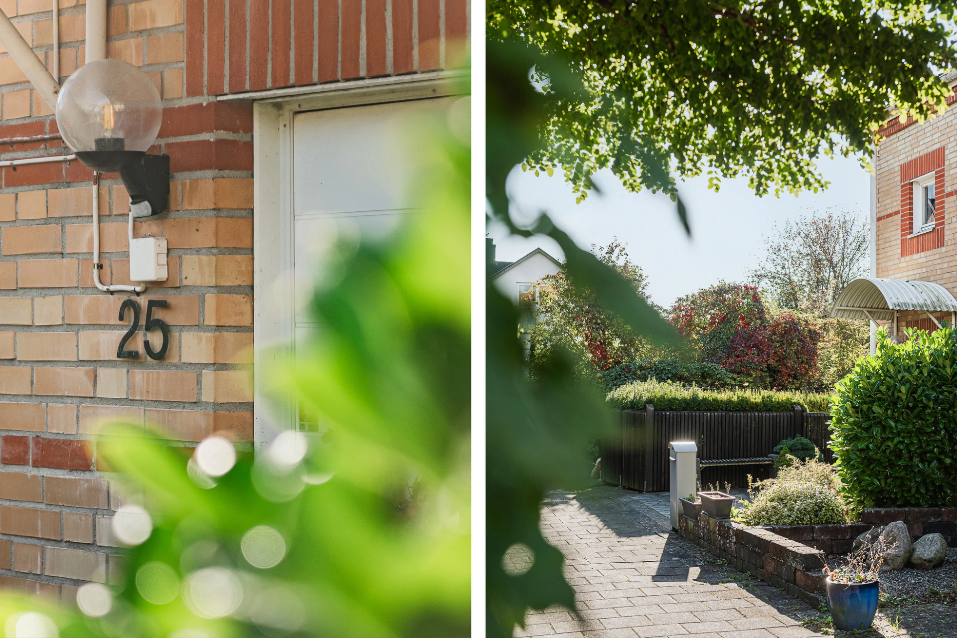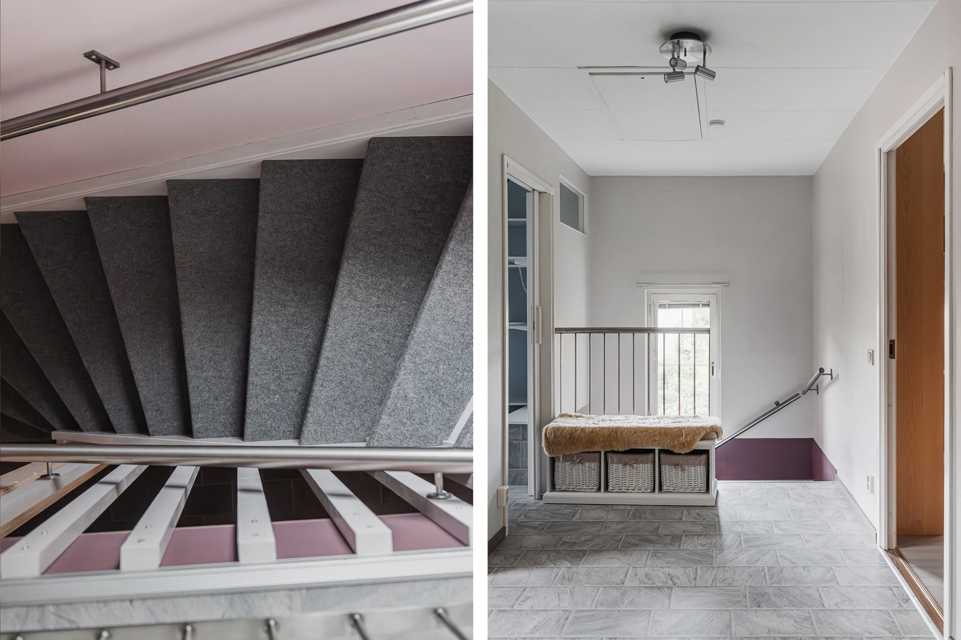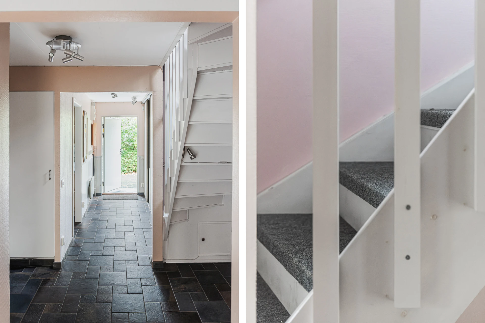 Klinker och ljusa väggar samt trappa till ovanvåningen.