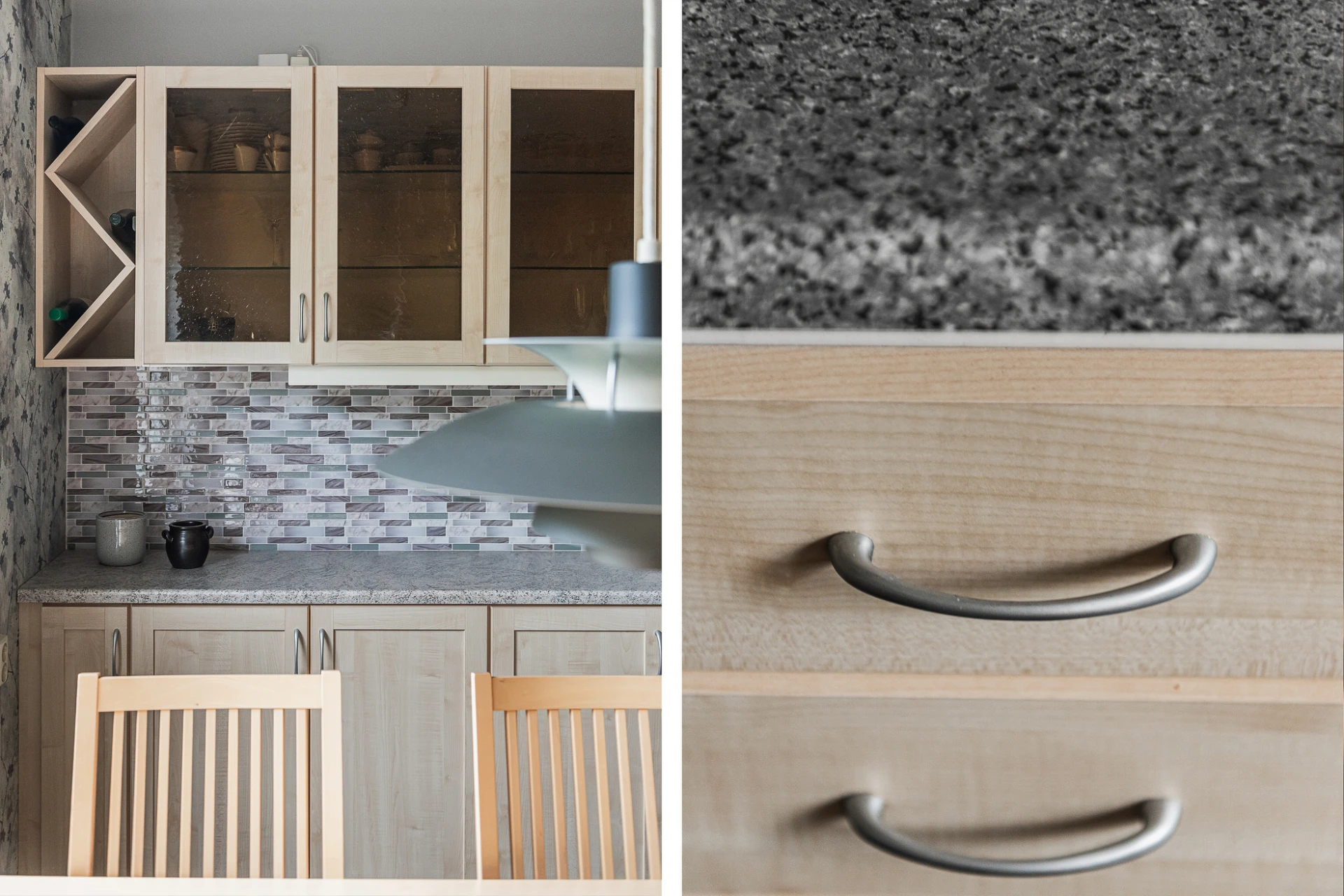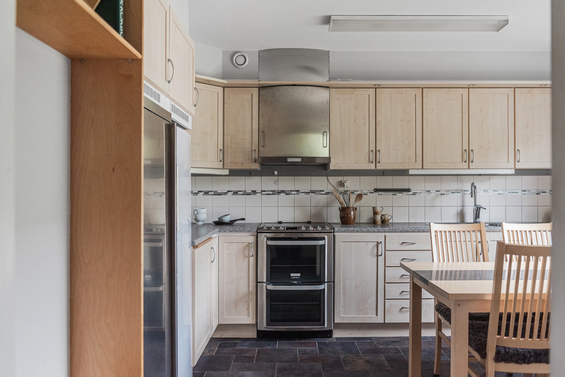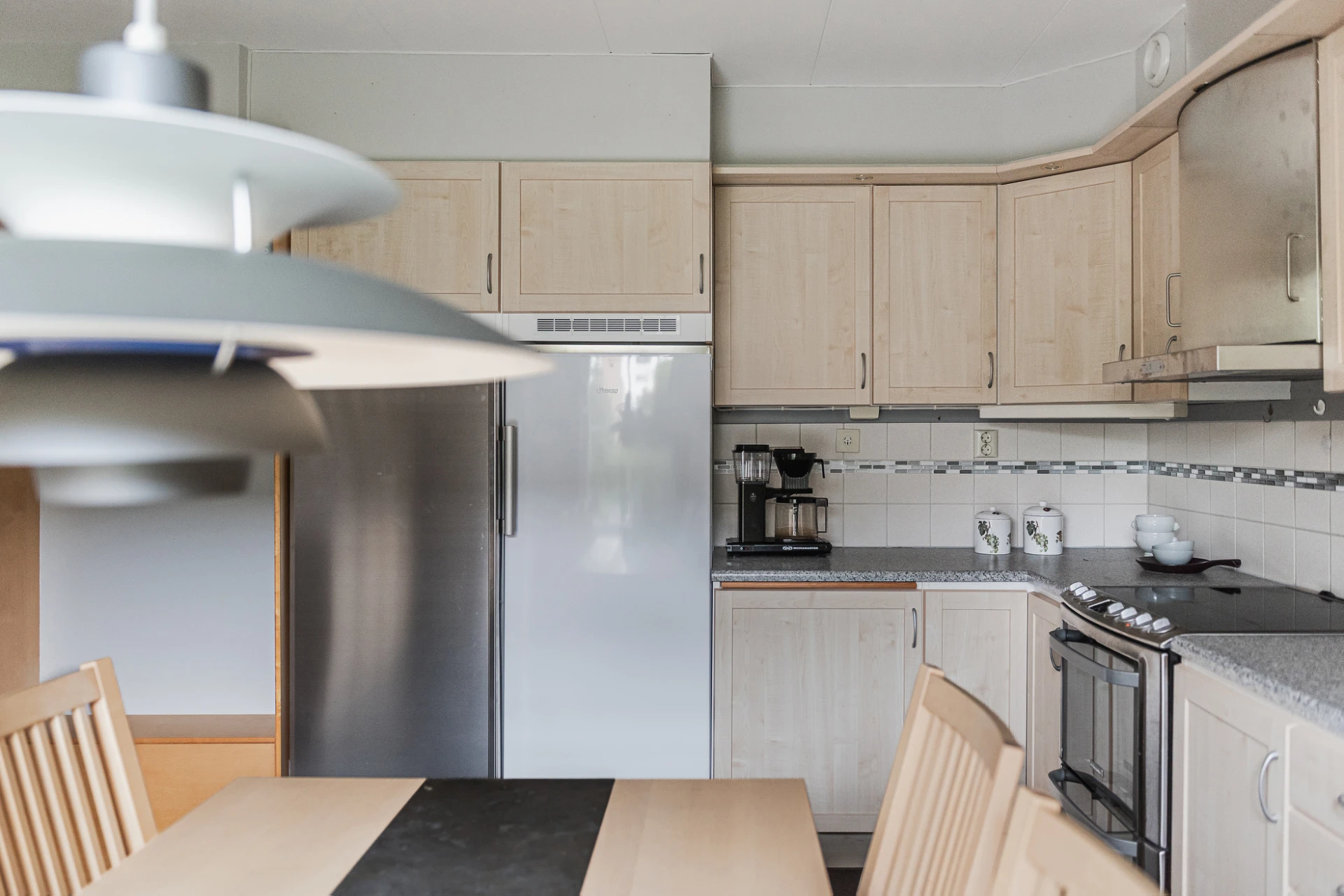 Klinker och ljusa väggar samt mönstrad fondvägg. Ljus köksinredning och beige kakel ovan arbetsbänk i laminat. Gott om skåpsförvaring, delvis med luckor i glas. Kyl, frys, ugn/spis, fläkt och diskmaskin.