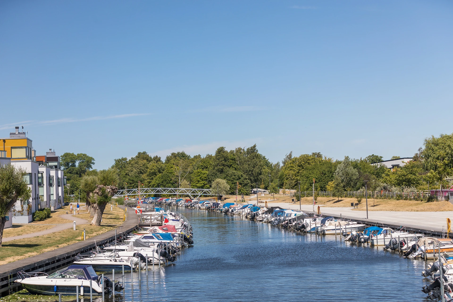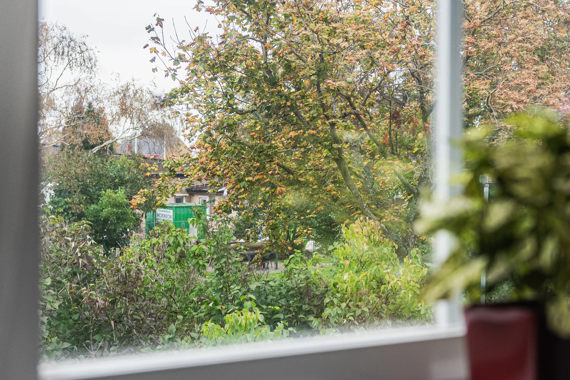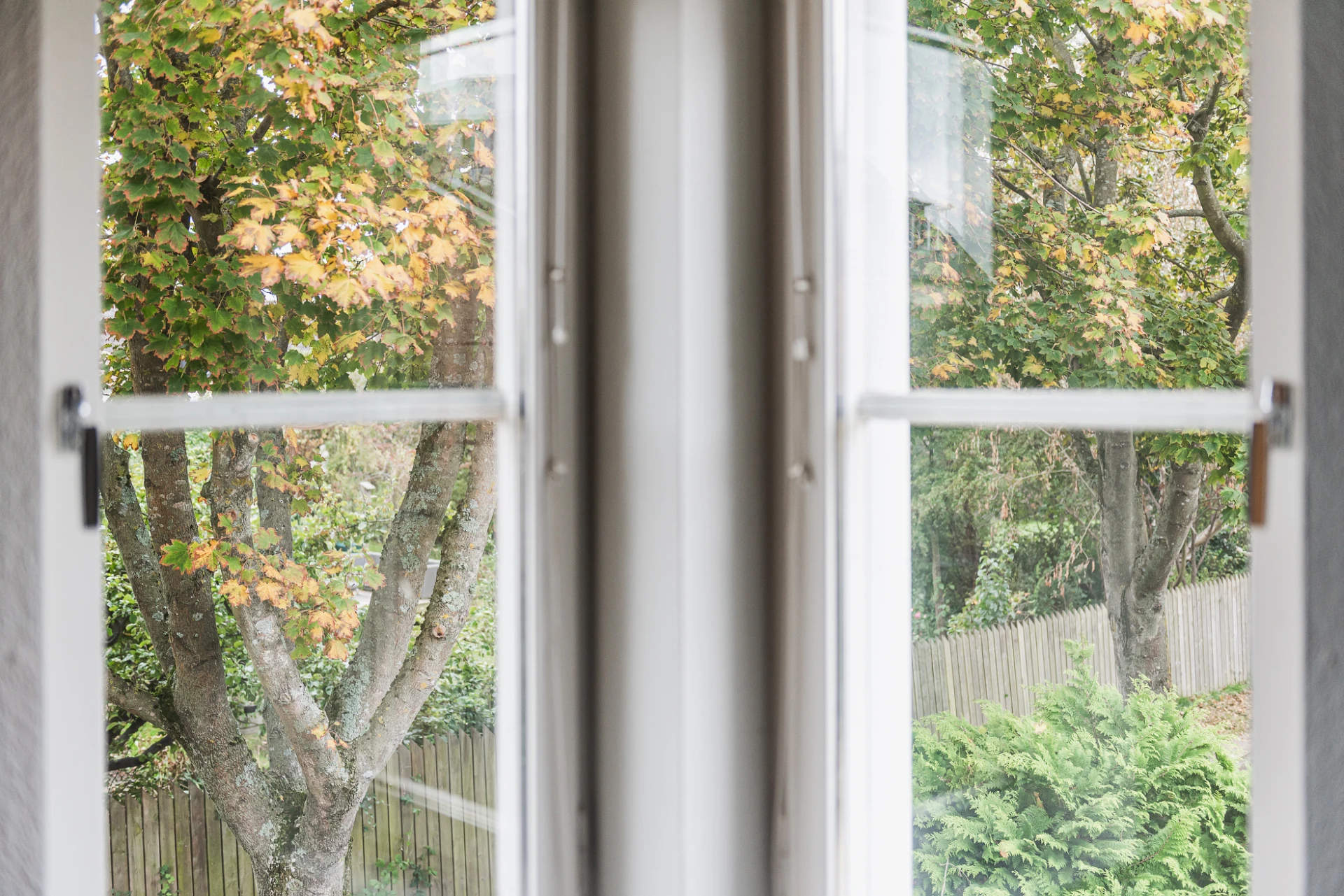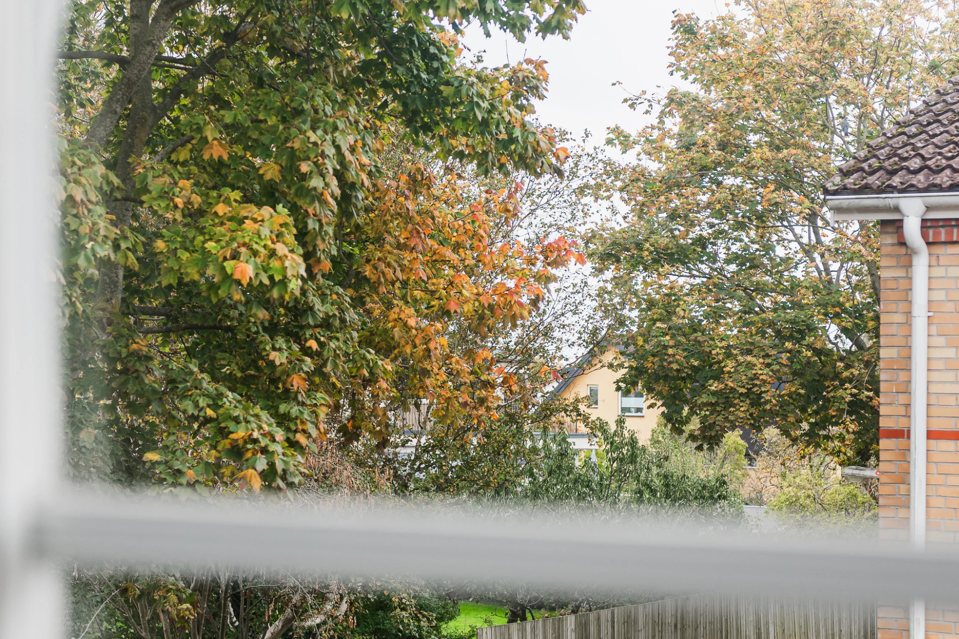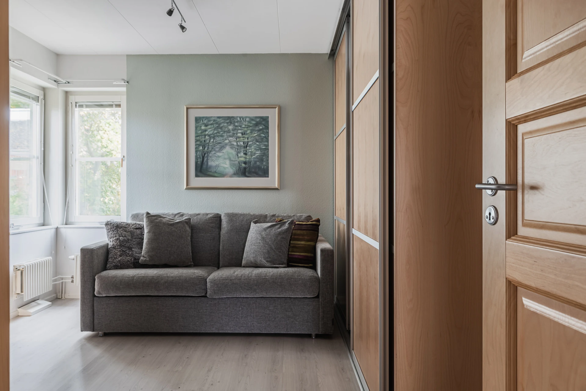 Laminatgolv och ljusa väggar. Fönster på hörna och skjutdörrsgarderob.