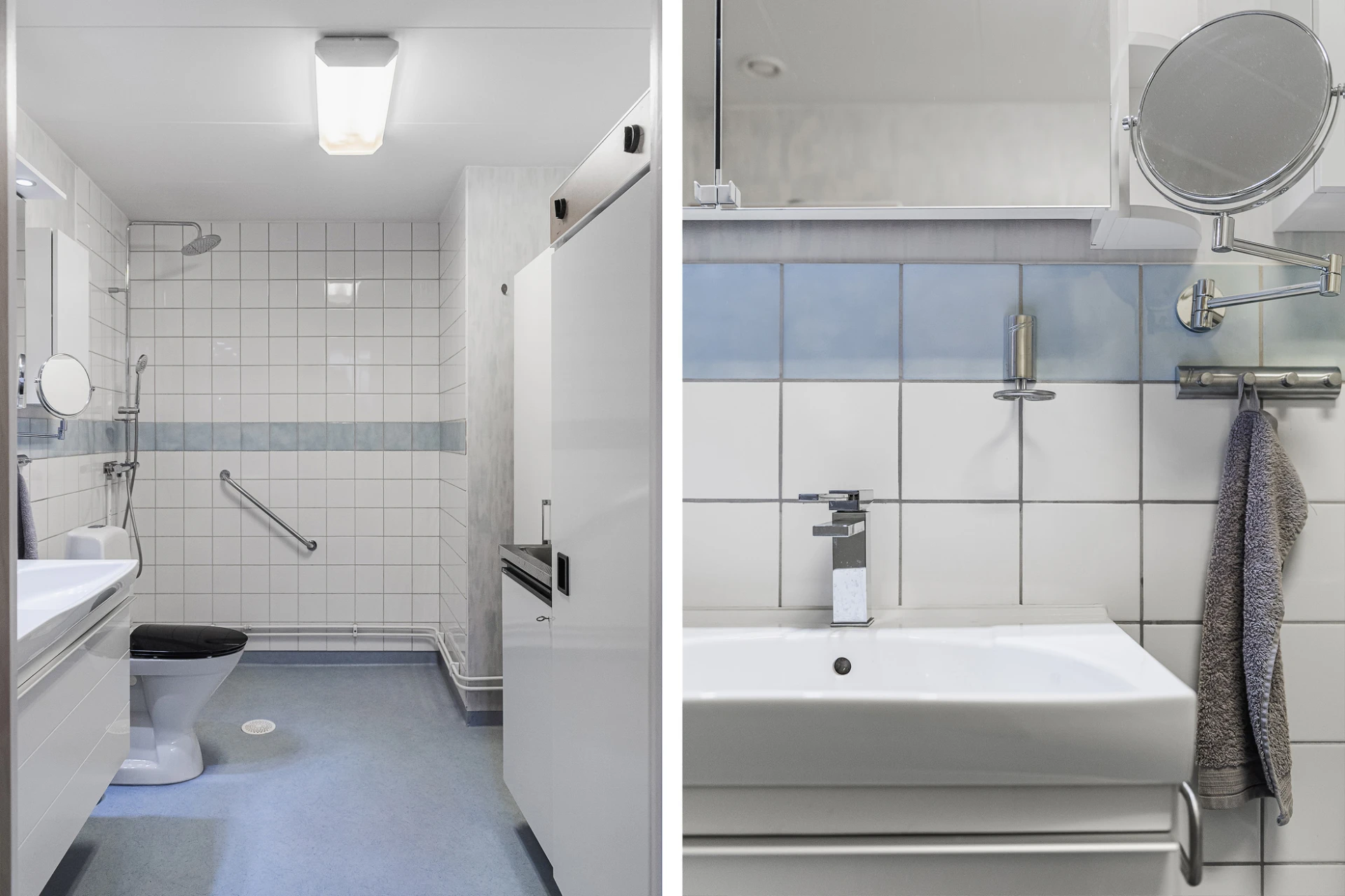 Blå våtrumsmatta och vitt samt blått kakel. Handfat med kommod, spegelskåp, WC, dusch, vask, skåp och torkskåp.
