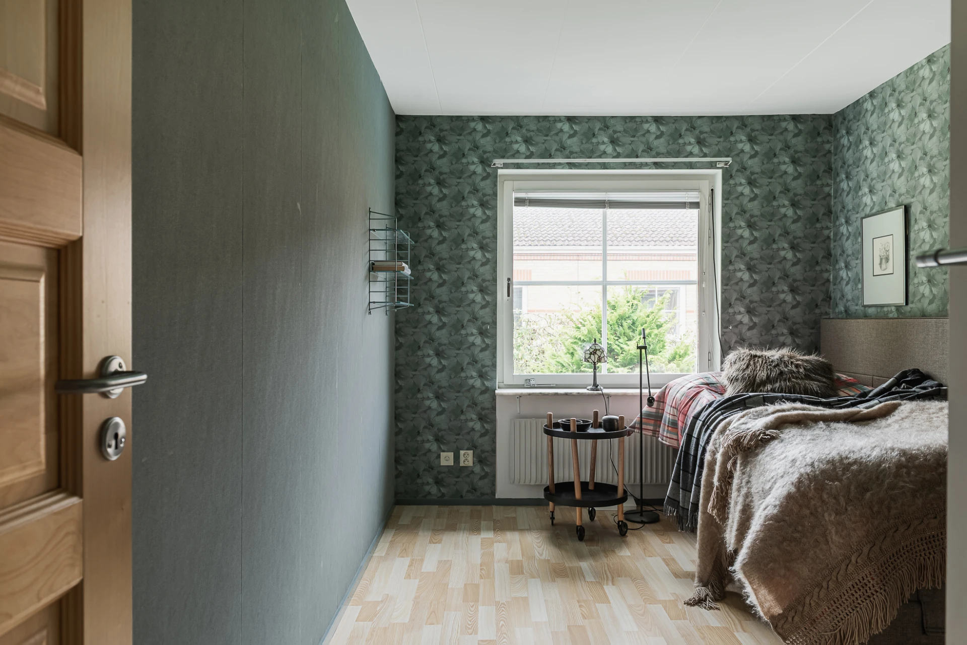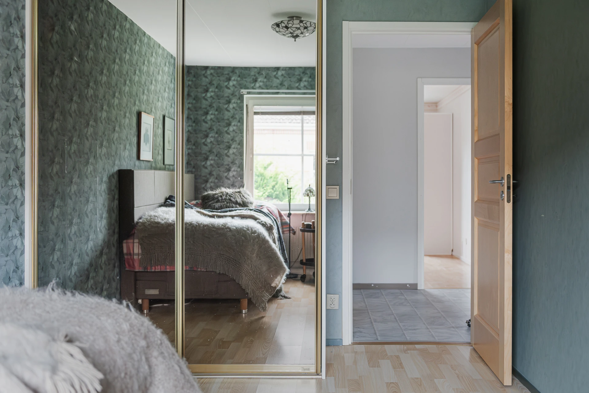 Laminatgolv och gröna väggar samt mönstrad fondvägg. Skjutdörrsgarderob med spegeldörrar.