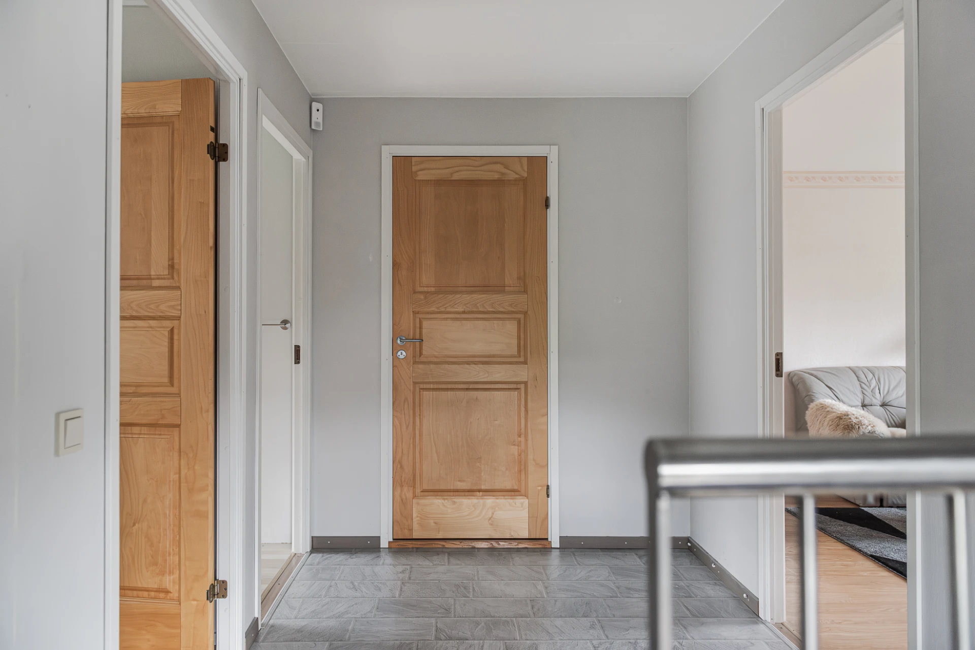 Klinker och ljusa väggar. Garderob, linneskåp, städskåp och skjutdörrsgarderob.