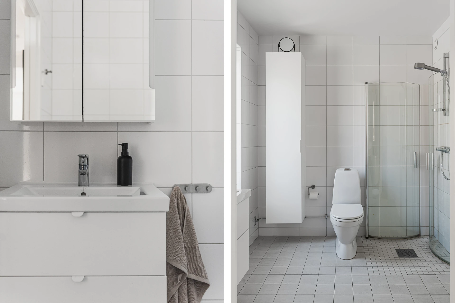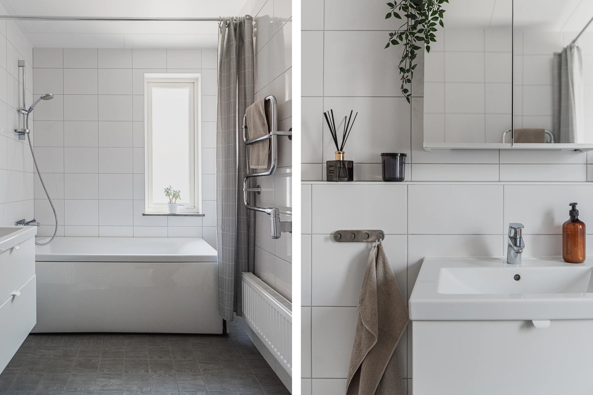 Grå klinker och vitt kakel. Badrummet är utrustat med WC, handfat med kommod, badkar och handdukstork.