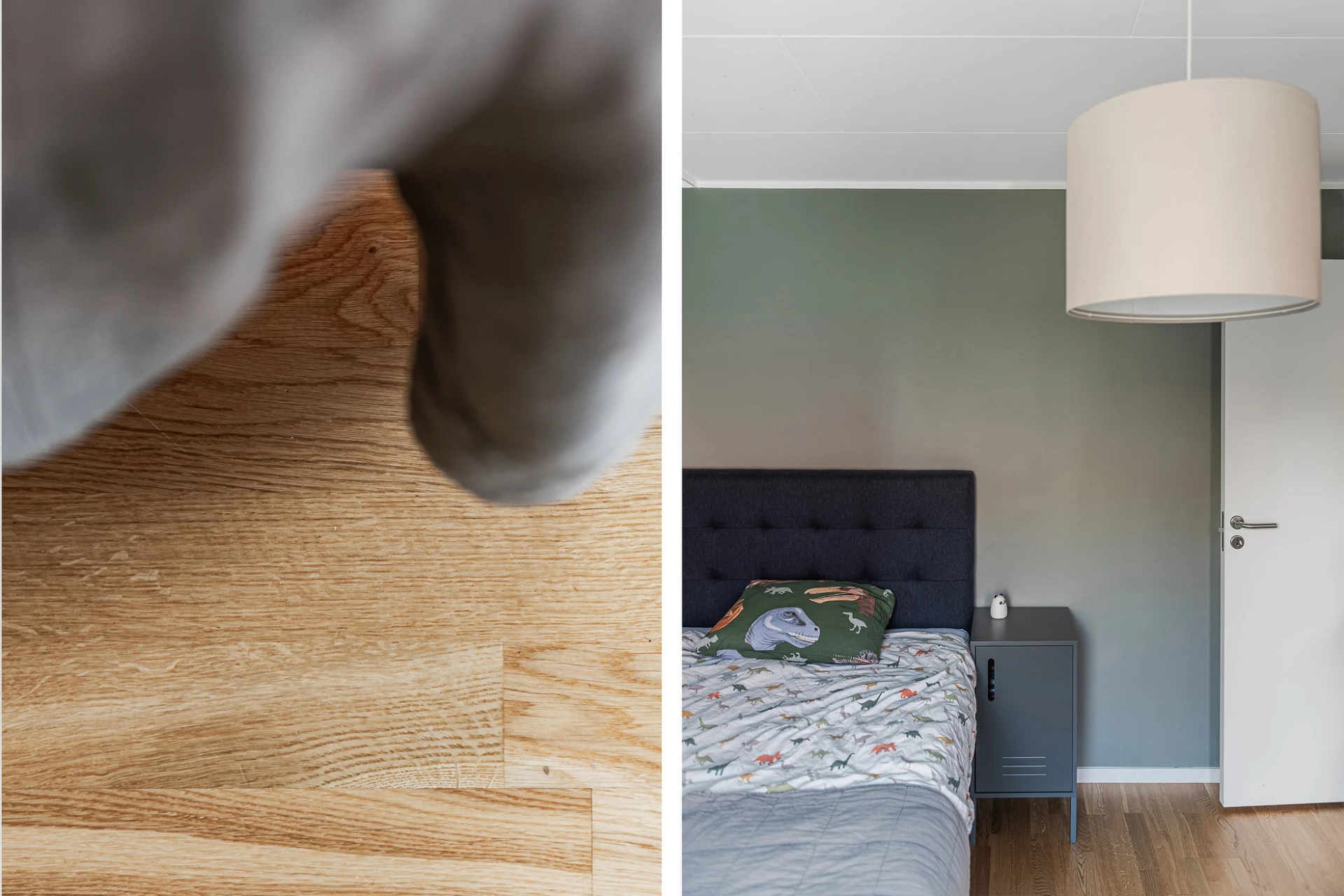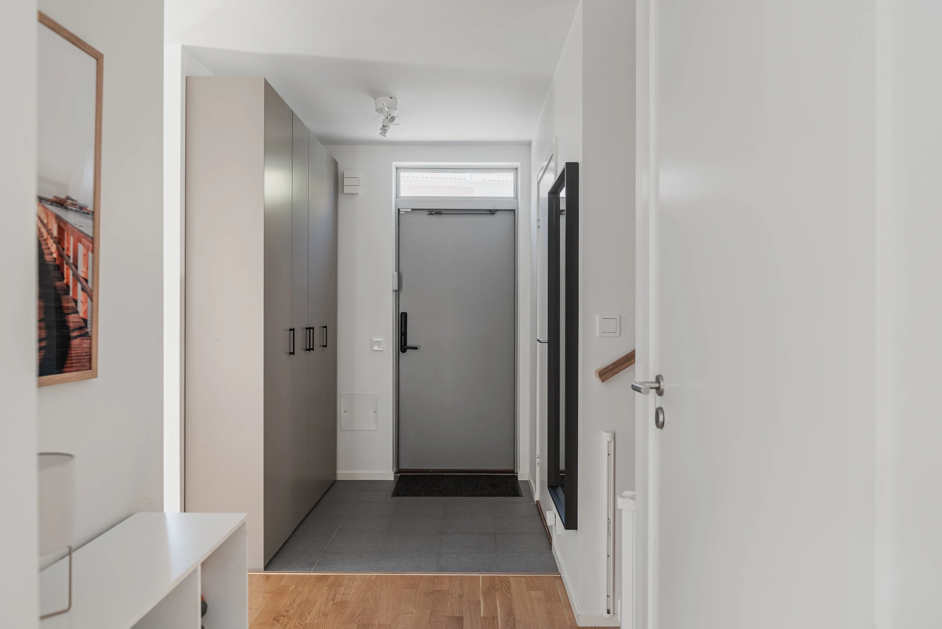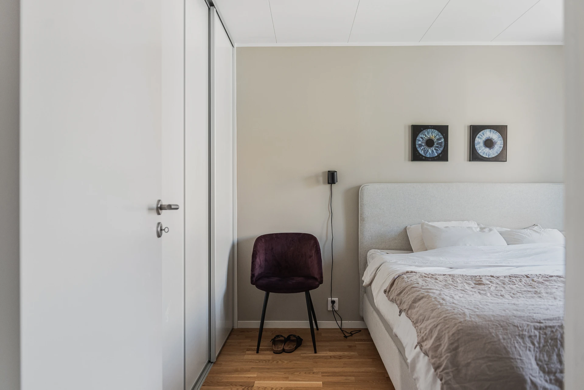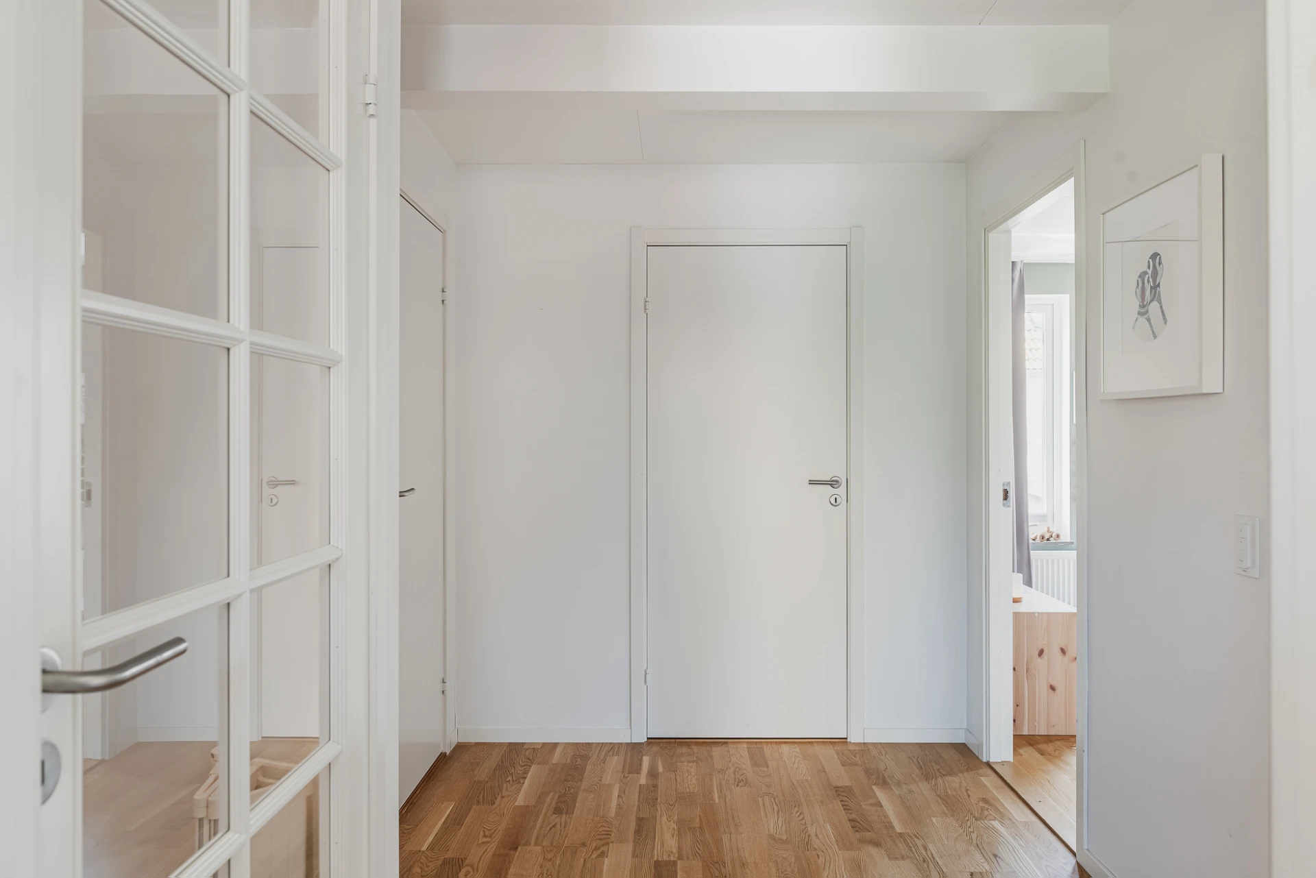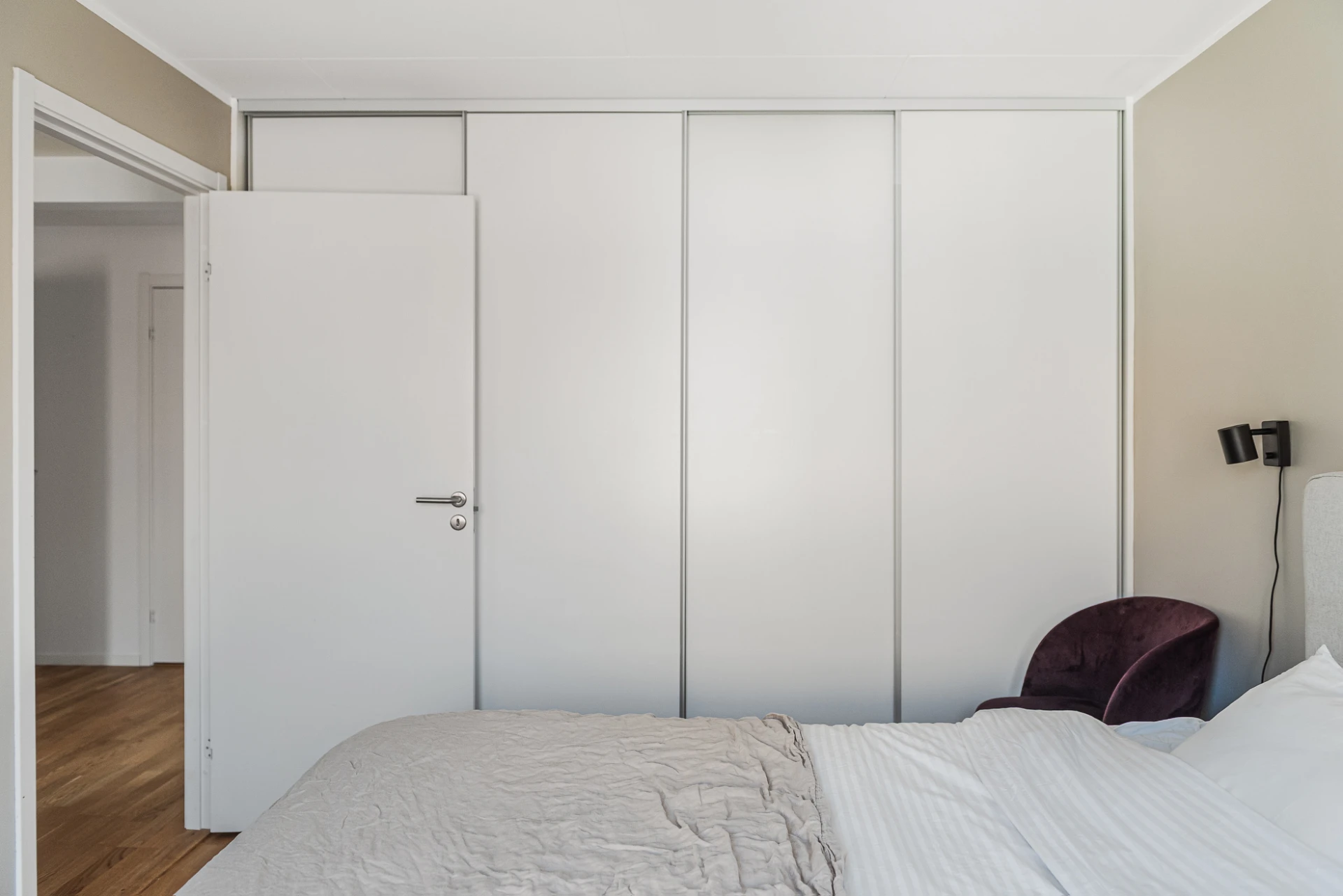 Parkettgolv och beige väggar. Förvaring i skjutdörrsgarderober.