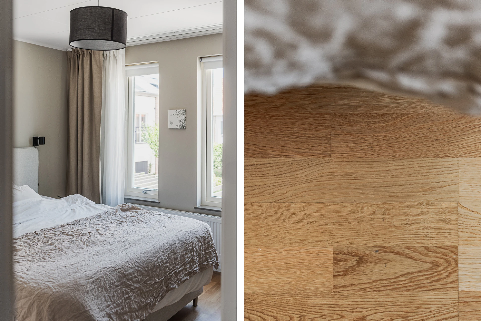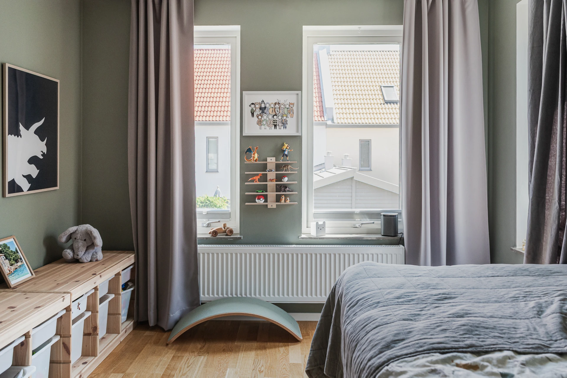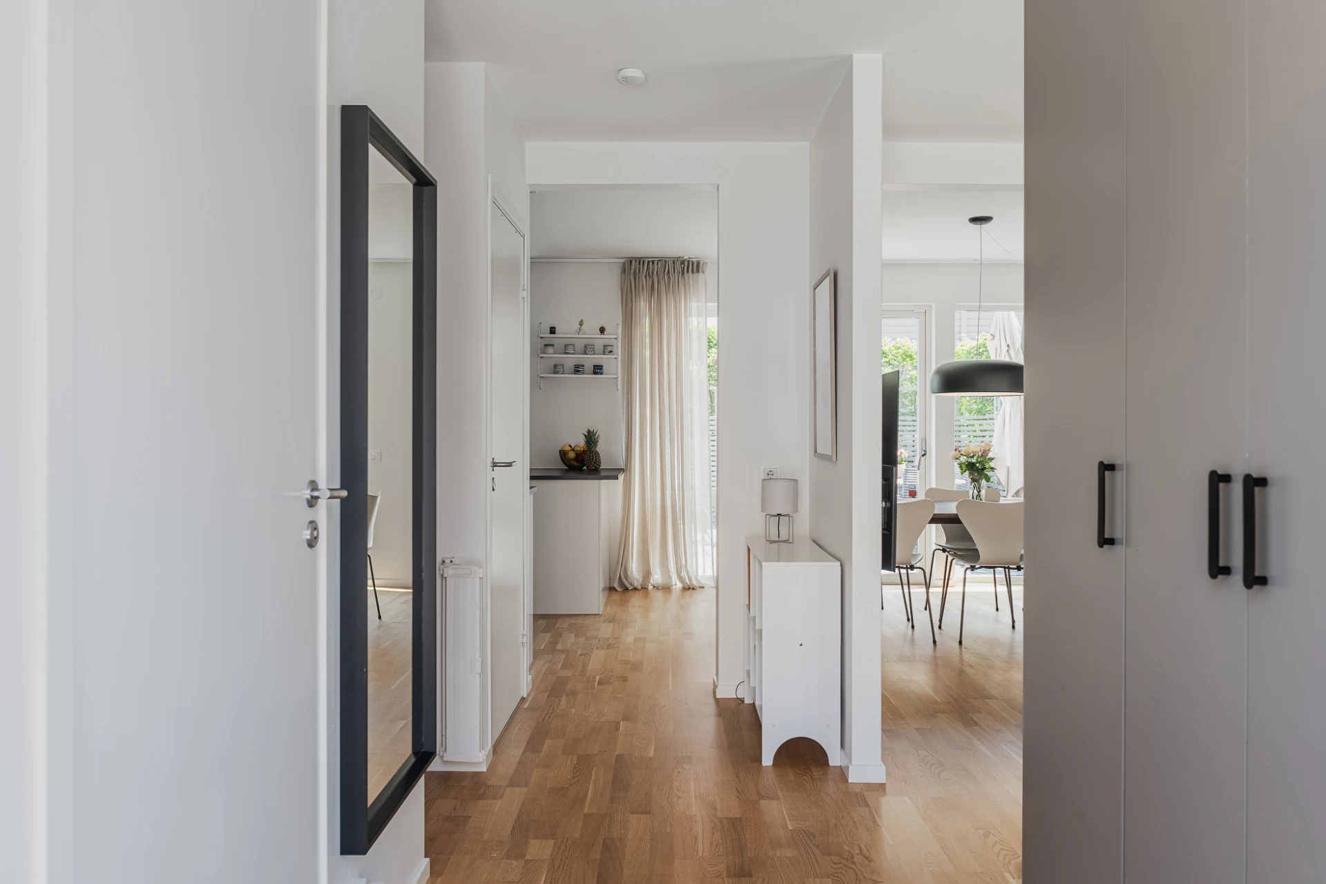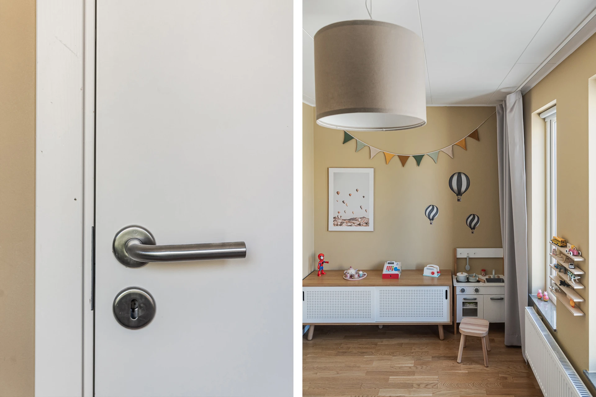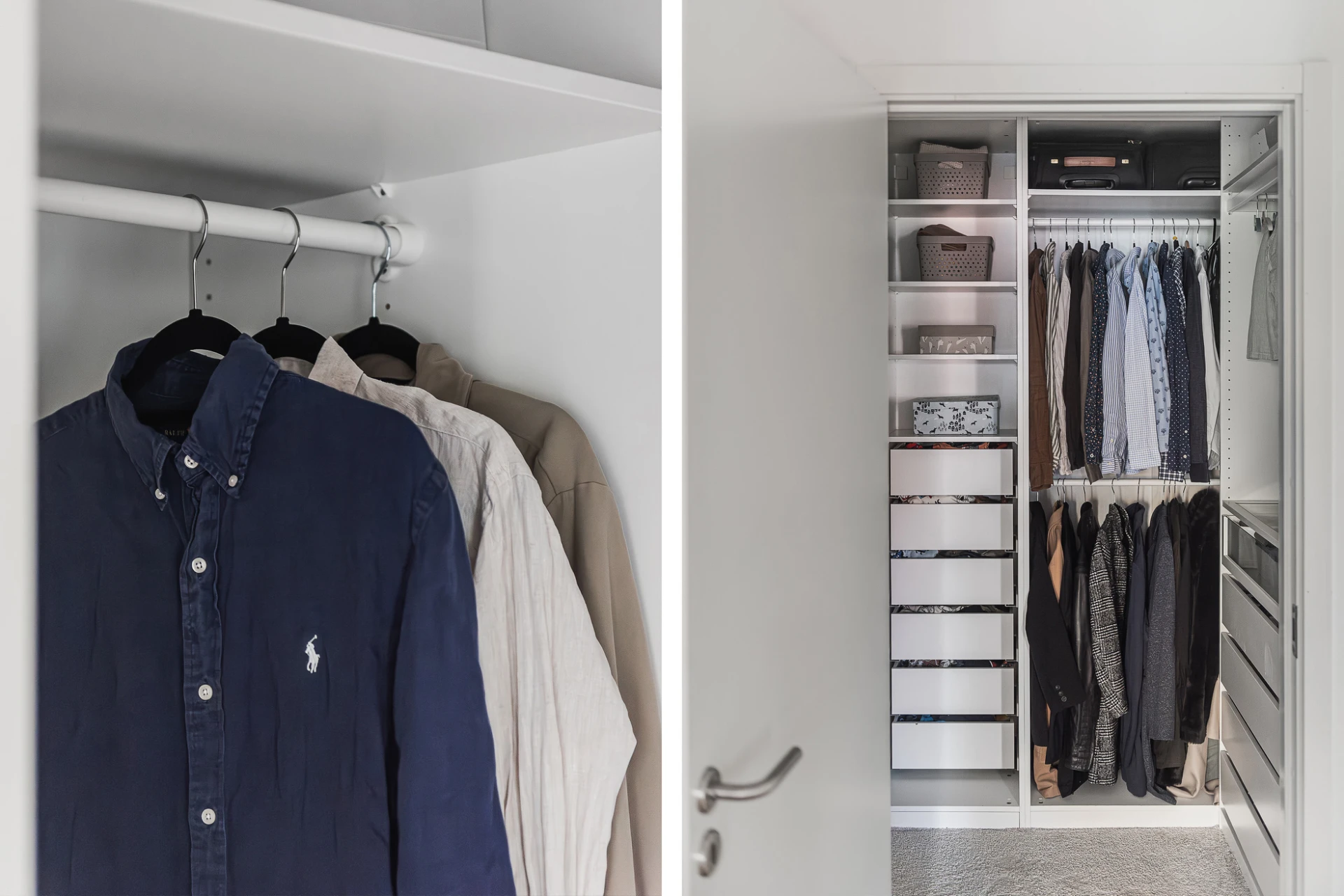 Parkettgolv och beige väggar. Förvaring i skjutdörrsgarderober.