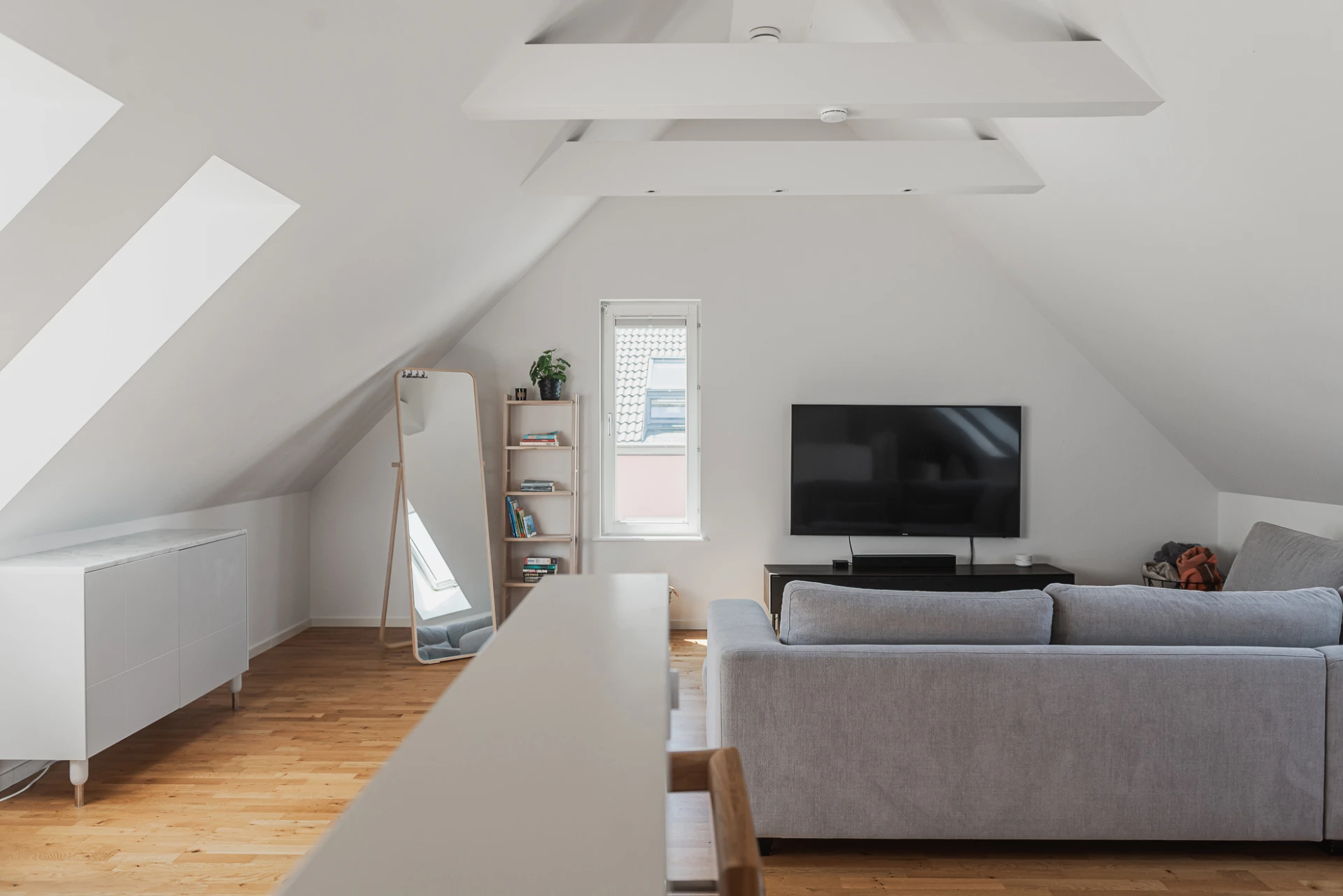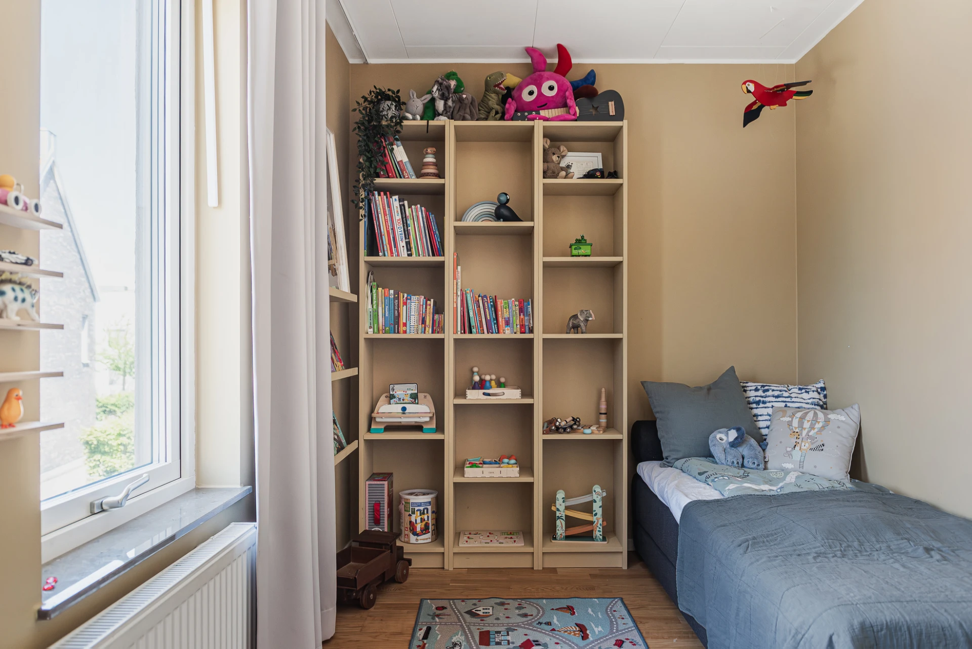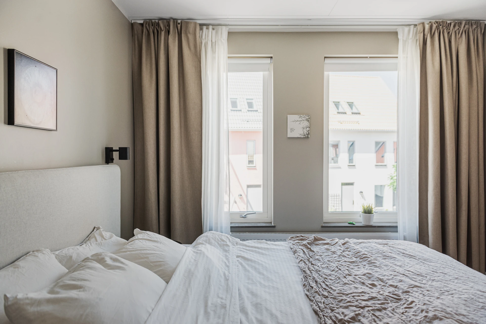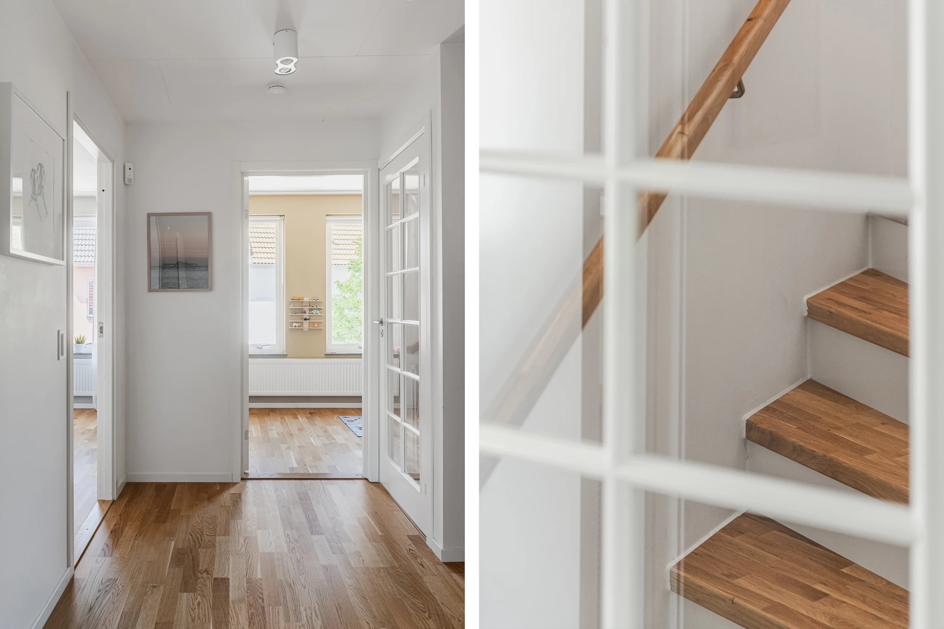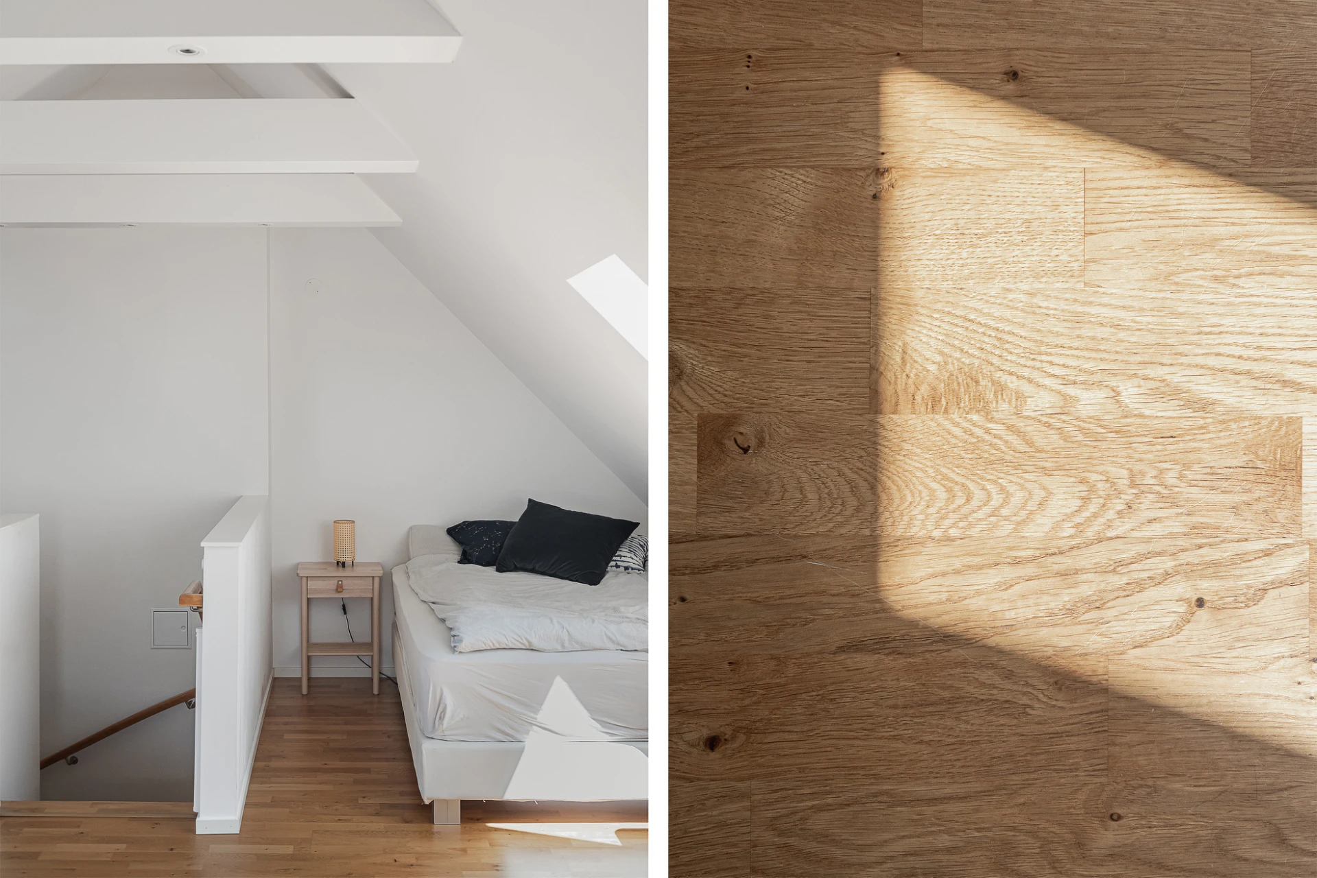 Parkettgolv och beige väggar. Förvaring i skjutdörrsgarderober.