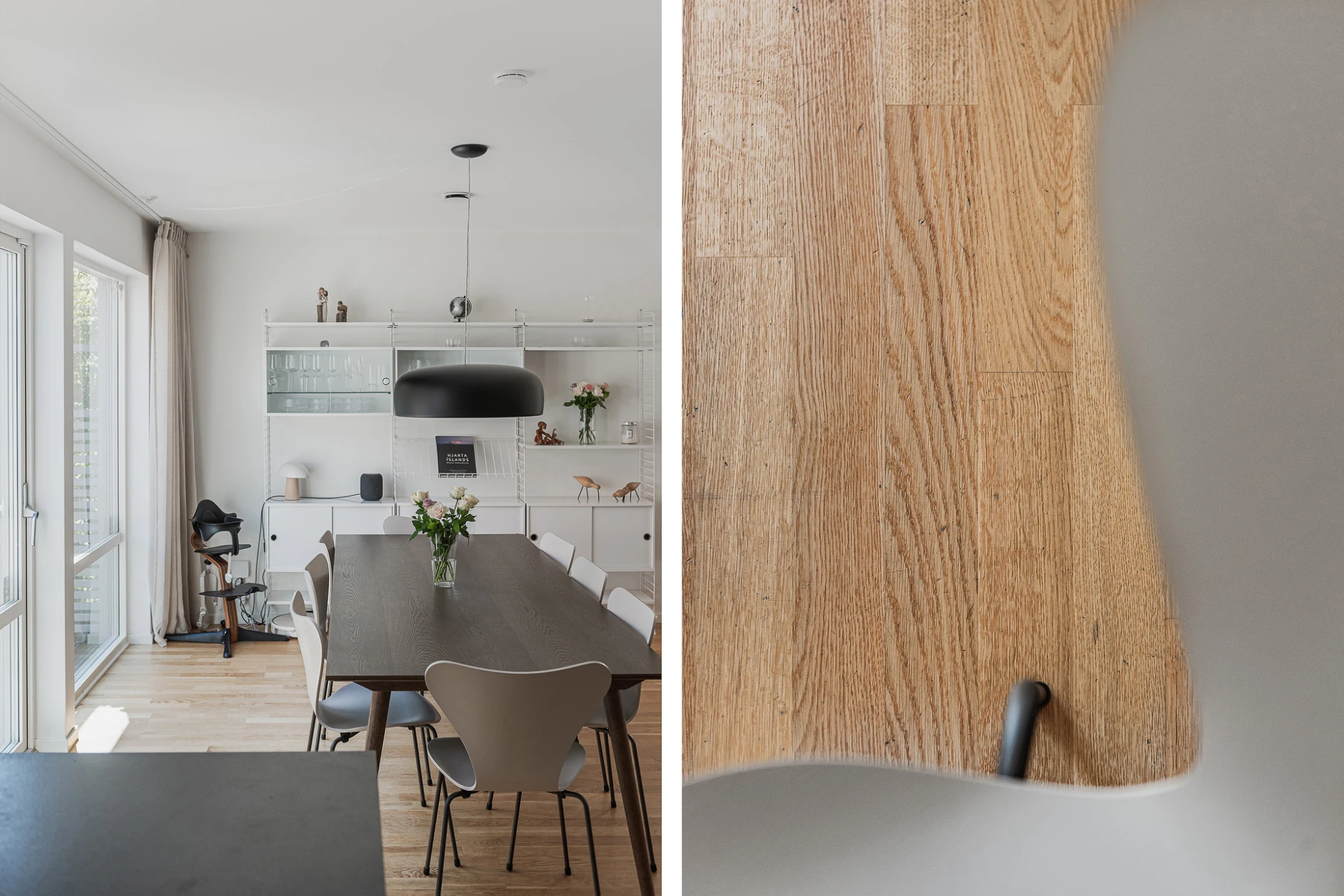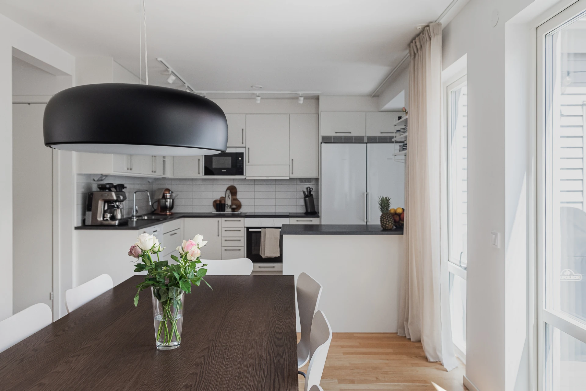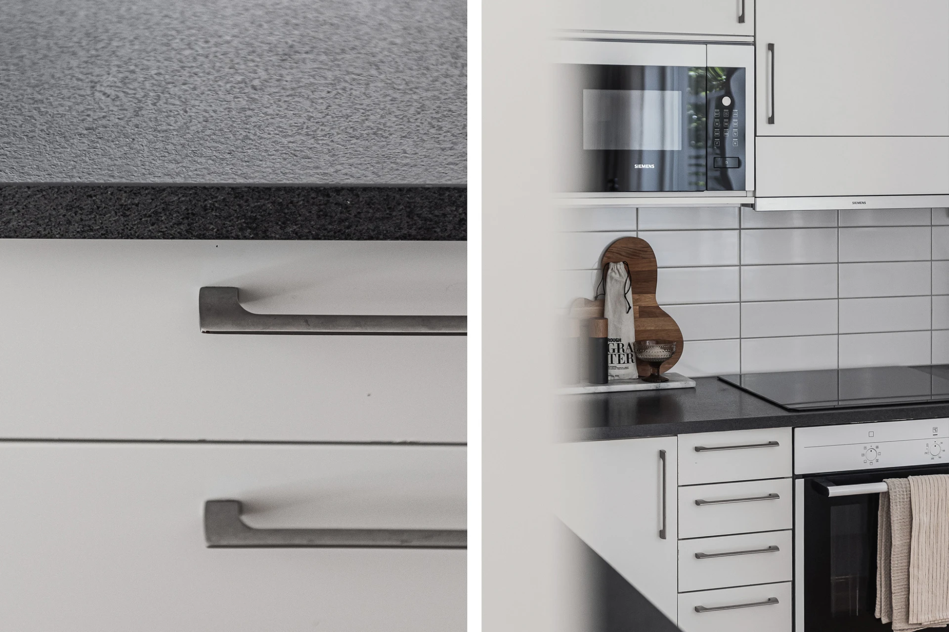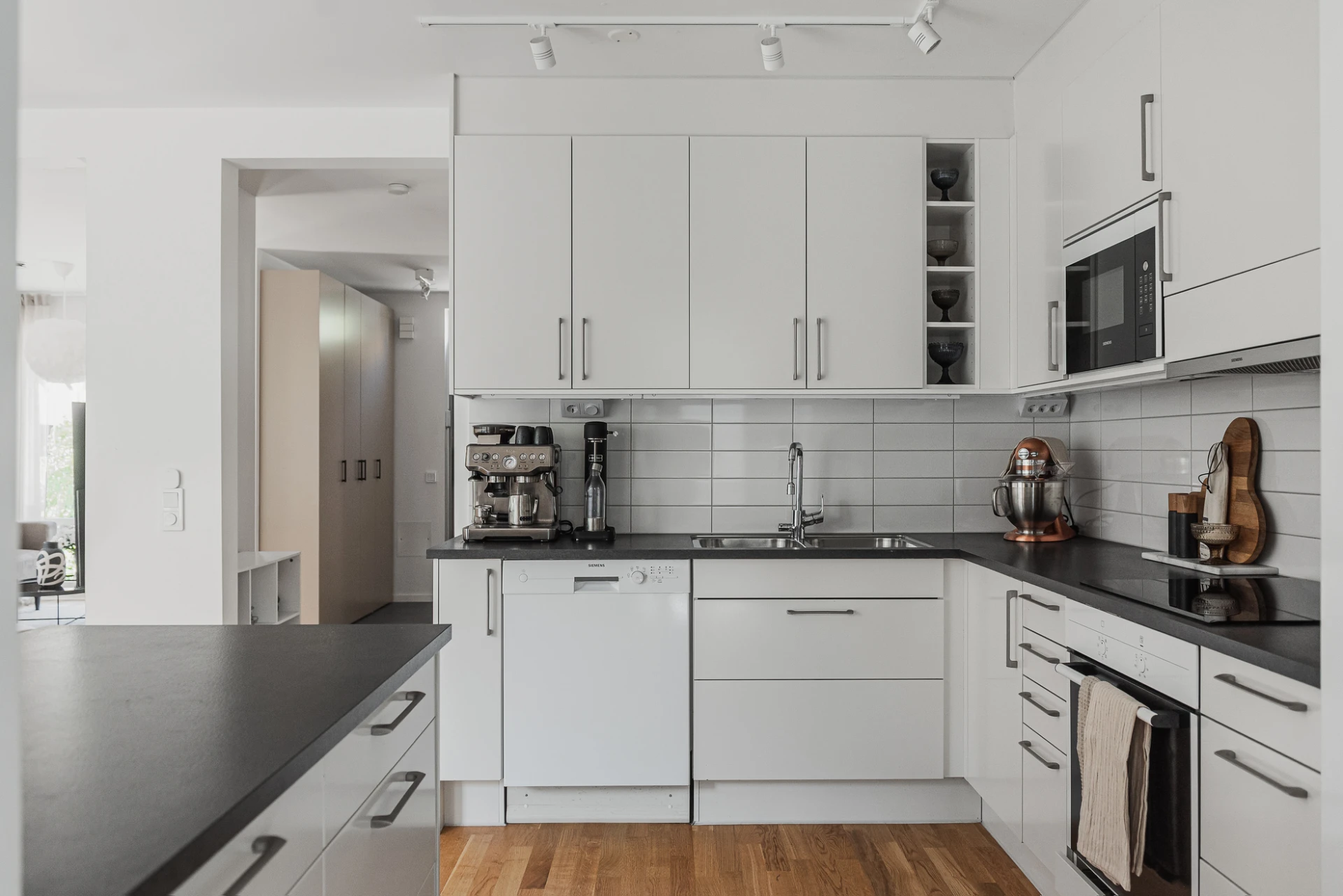 Parkettgolv och vita väggar. Köksinredning från Marbodal i vitt med mörk bänkskiva och stänkskydd i vitt kakel. Köket är utrustat med kyl och frys, diskmaskin, ugn, spishäll och microvågsugn (Siemens).