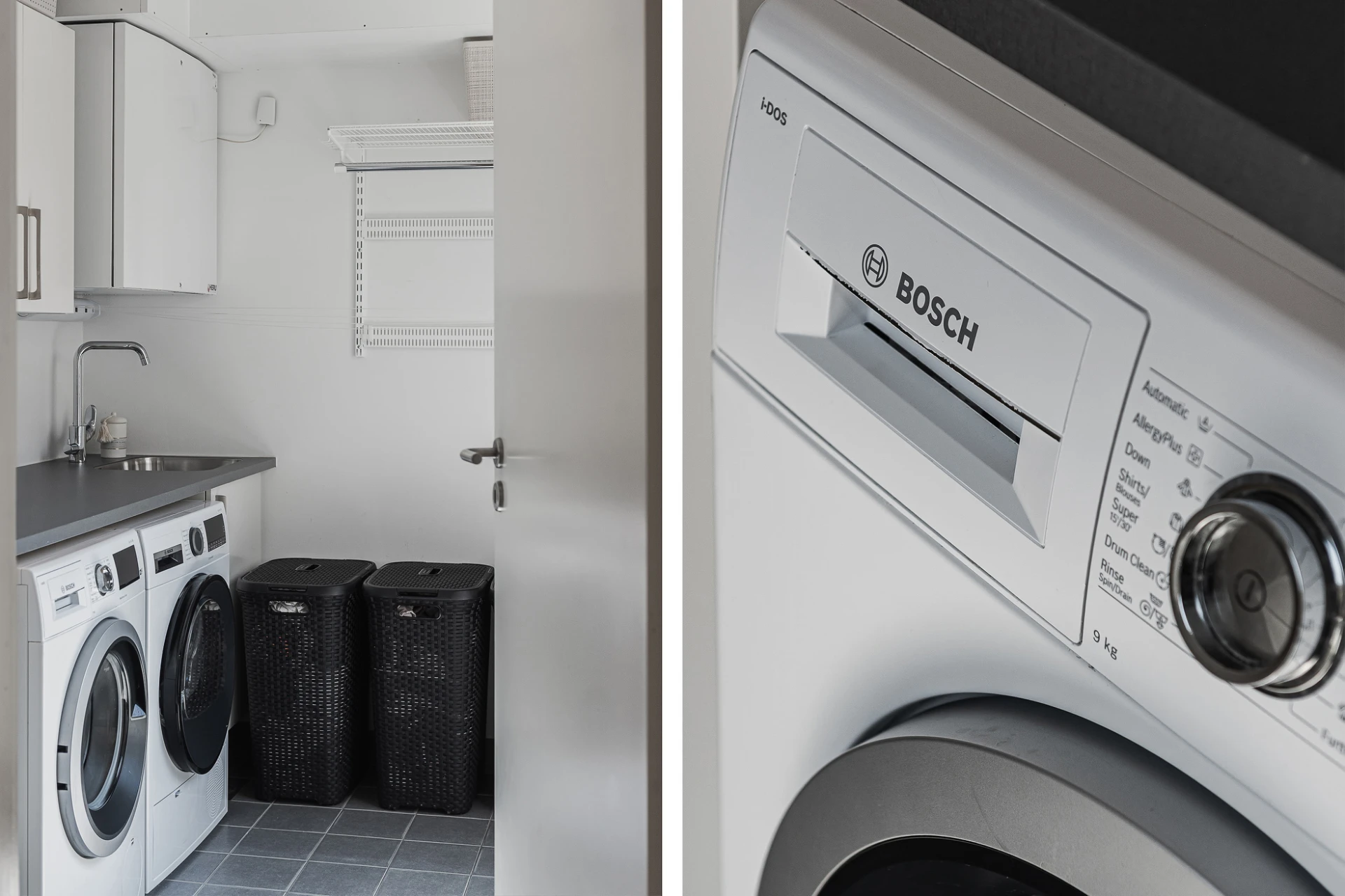 Klinker och vita väggar. Tvättstugan är utrustad med tvättmaskin, torktumlare, arbetsbänk med vask och skåp för förvaring.