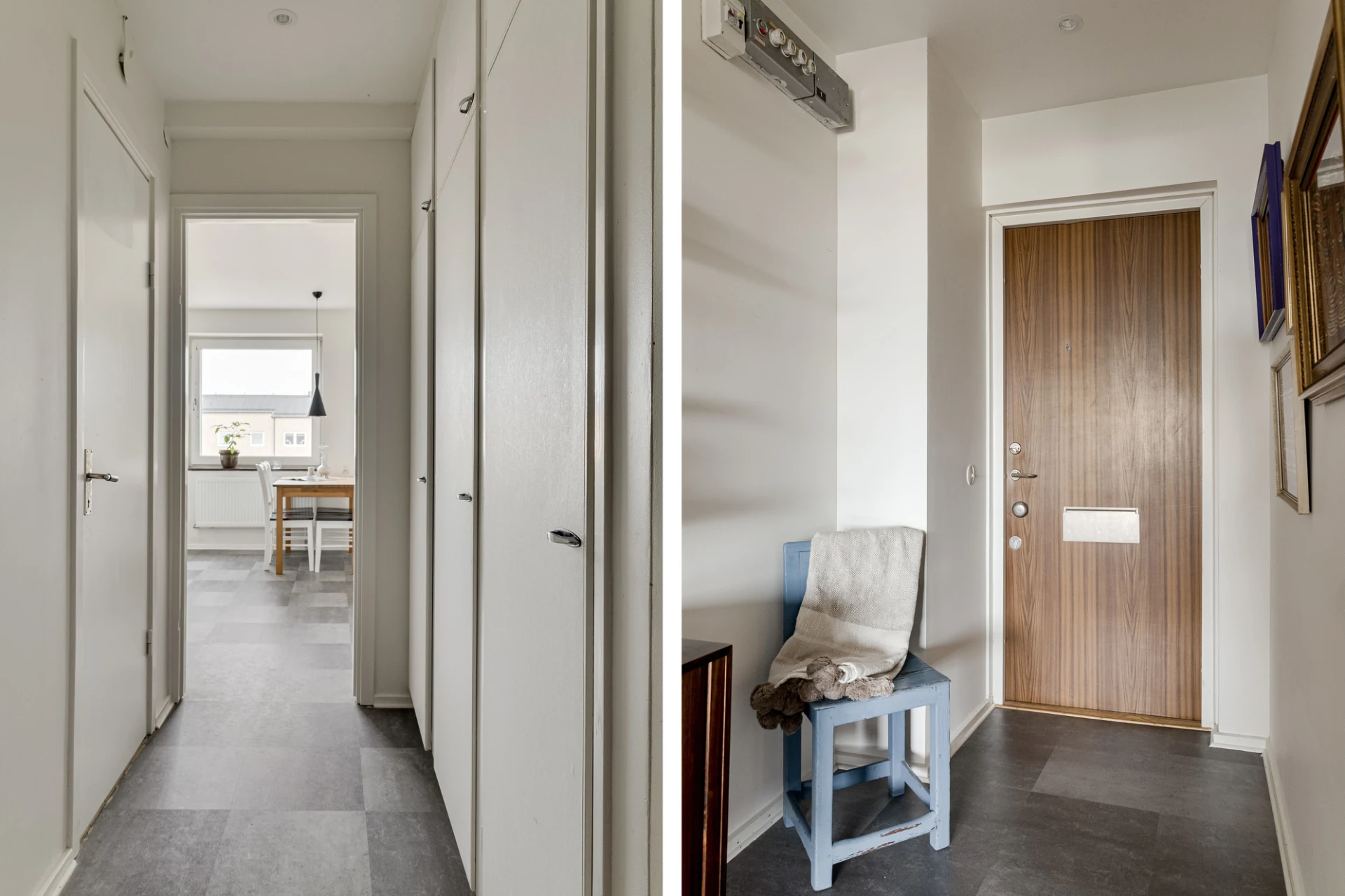 Laminatgolv och vita väggar samt inbyggda garderober.