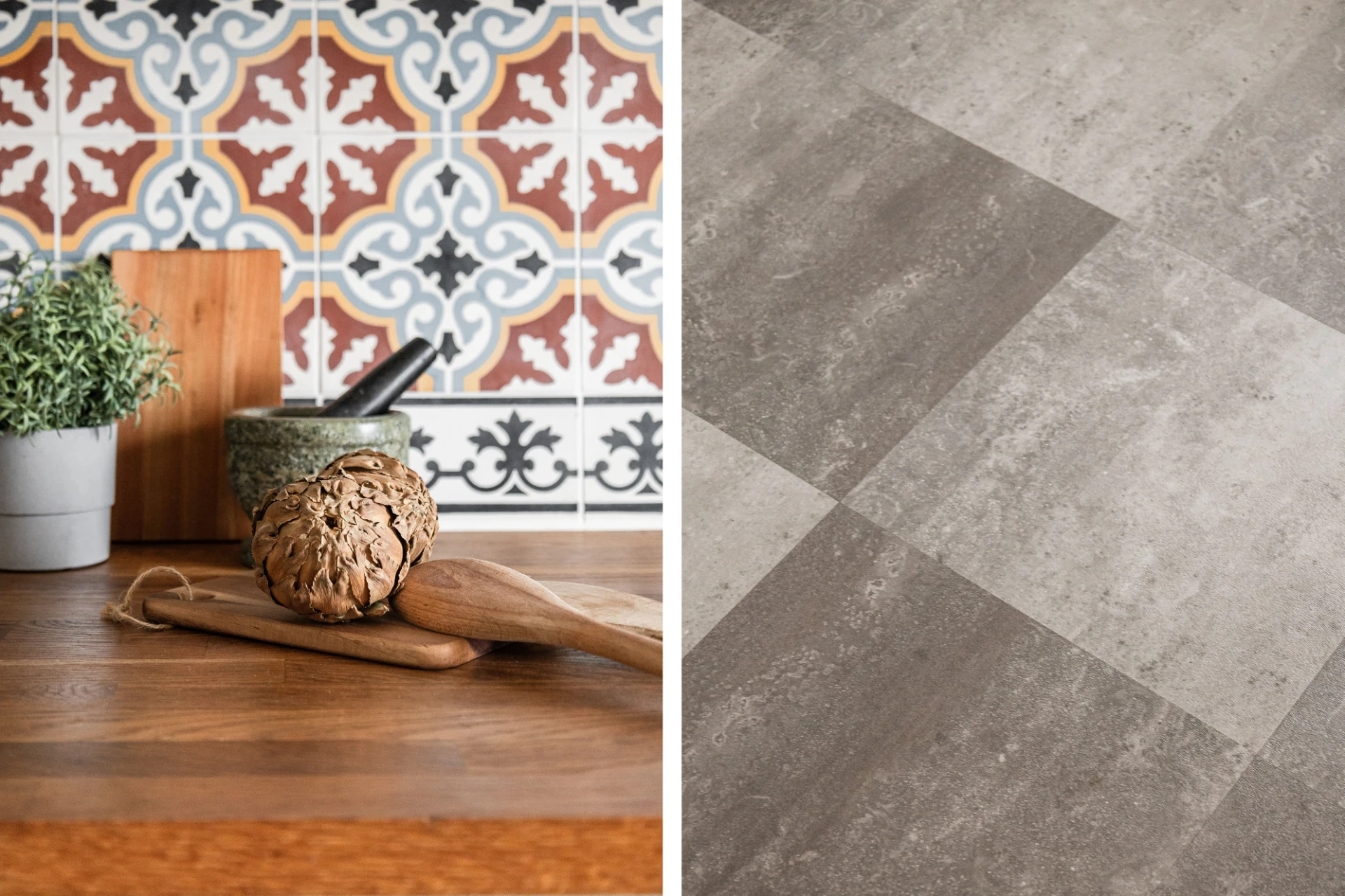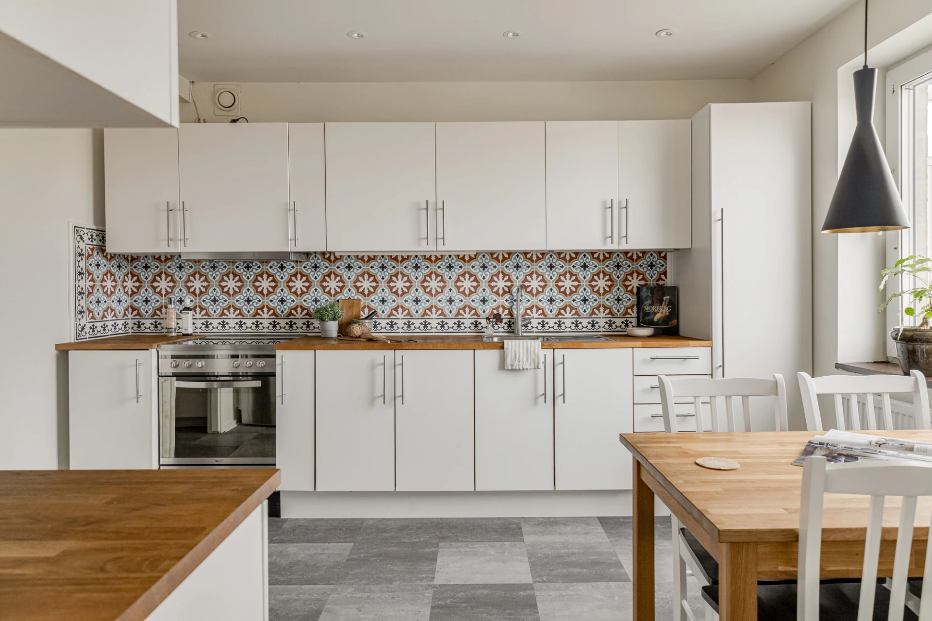 Grått laminatgolv och vita väggar. Vit köksinredning och marockanskt kakel samt spotlights ovan arbetsbänk i trä. Spotlights i tak, kyl/frys, spis/ugn och fläkt.