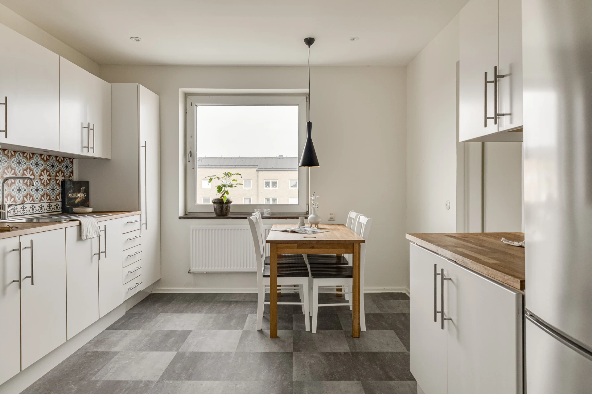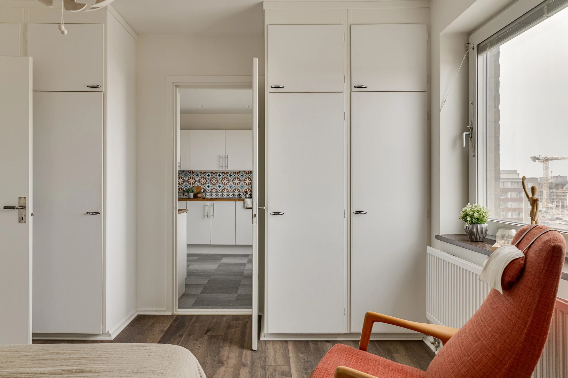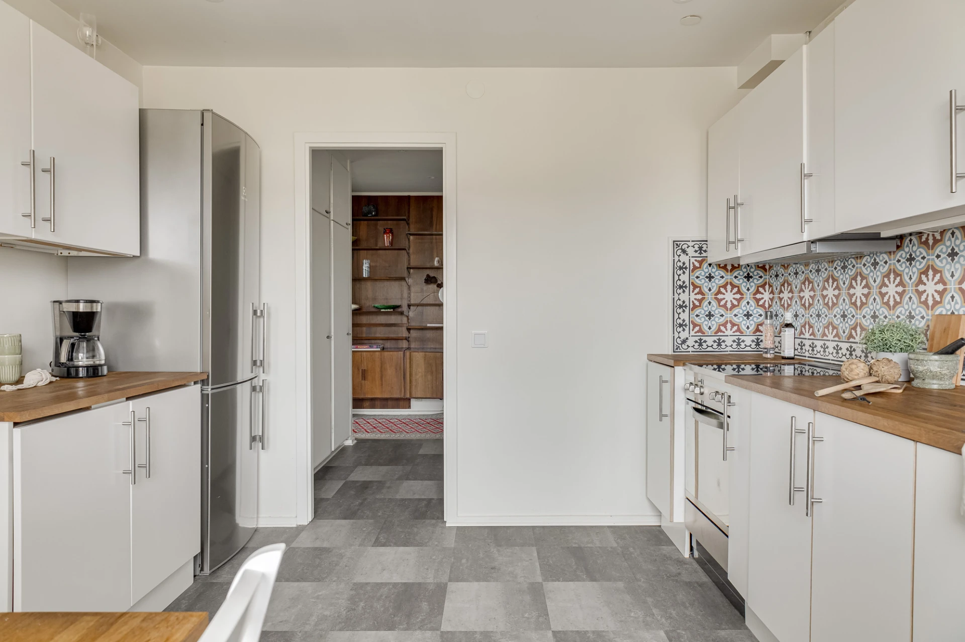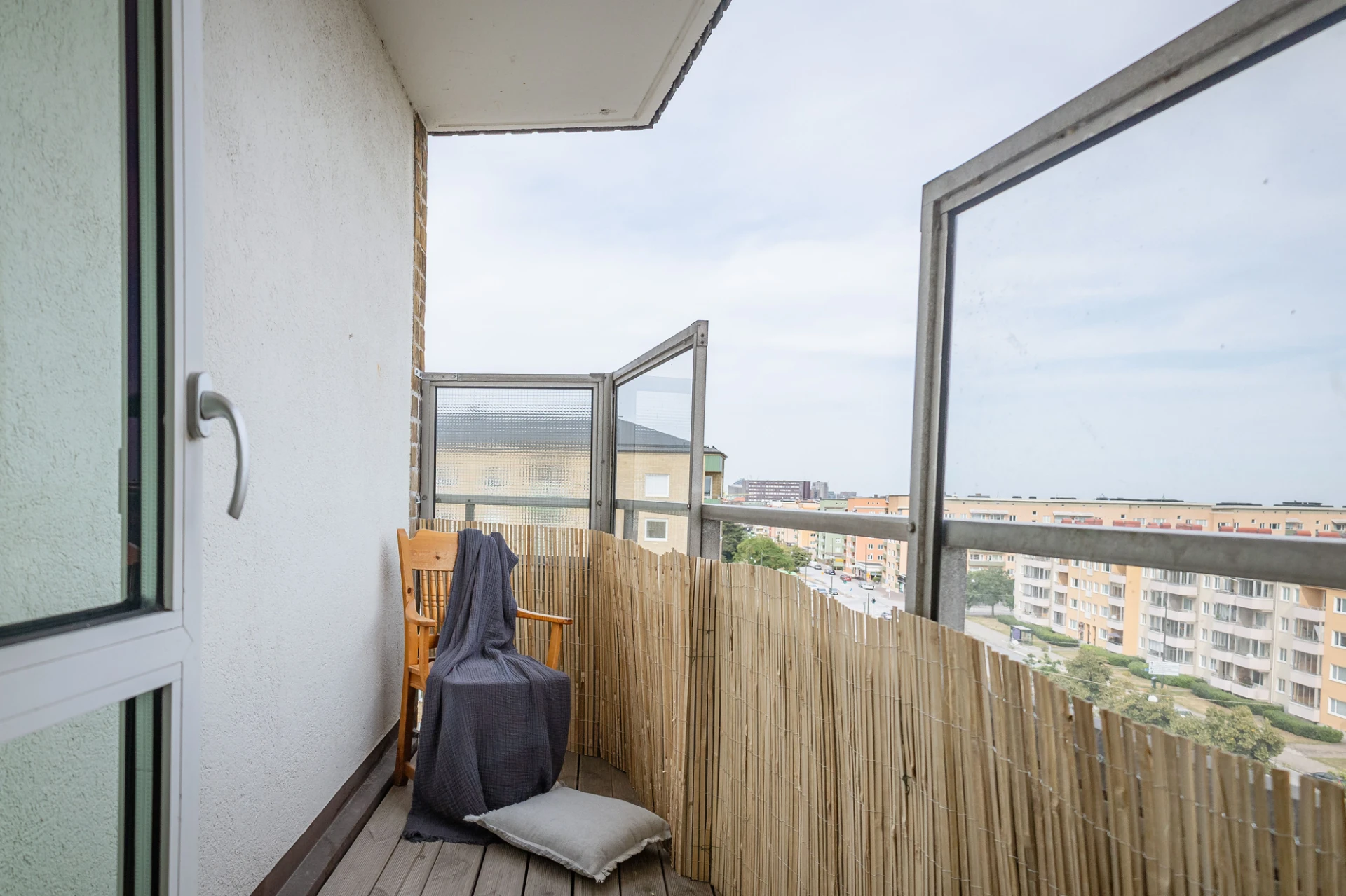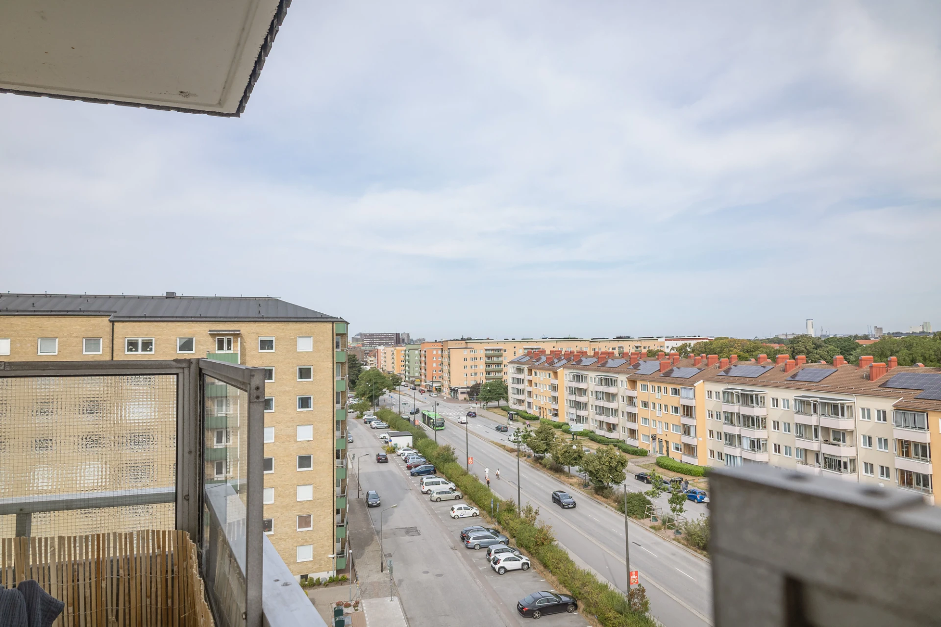 På våning 8 och med ett eftertraktat hörnläge samt en underbar utsikt väntar ett hem som förenar komfort med känsla. Här bjuds du på en ljuvlig vy som sträcker sig långt över omgivningarna och kväll efter kväll kan du njuta av magiska solnedgångar direkt från balkongen. Den rundgående planlösningen gör att bostaden känns både rymlig och välkomnande, här samsas ett generöst vardagsrum med ett stort kök som erbjuder plats för både matlagning och gemensamma middagar. Köket är dessutom renoverat med omsorg och smakfulla detaljer där det marockanska kaklet blir en vacker accent. Utöver det har vi ett rofyllt sovrum, ett helkaklat badrum som är förberett för tvättmaskin och generösa förvaringsmöjligheter som tack vare sina platsbyggda lösningar både är praktiska och snygga.