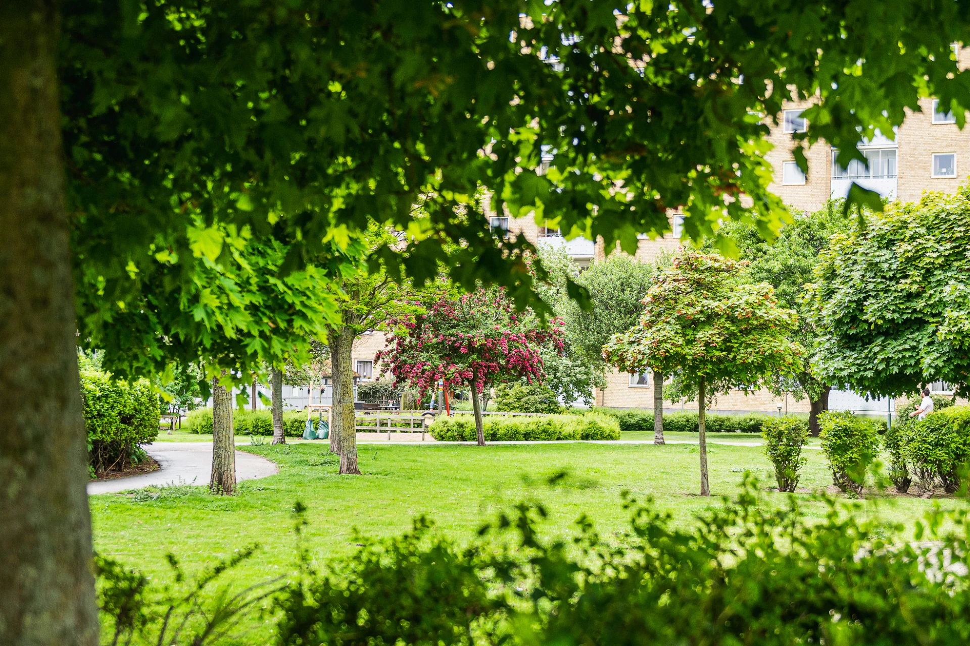 Mellan husen finns trevliga grönytor med lekplatser, fotbollsmål, grill- och sittplatser samt boulebana.