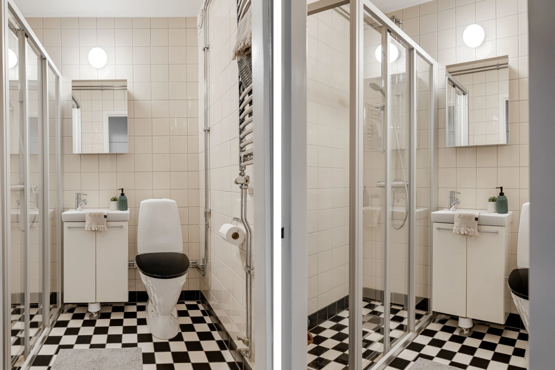 Svart/vit rutig klinker och ljust kakel. WC, handfat med kommod, spegelskåp, handdukstork, dusch med skjutdörrar och förberett för tvättmaskin.