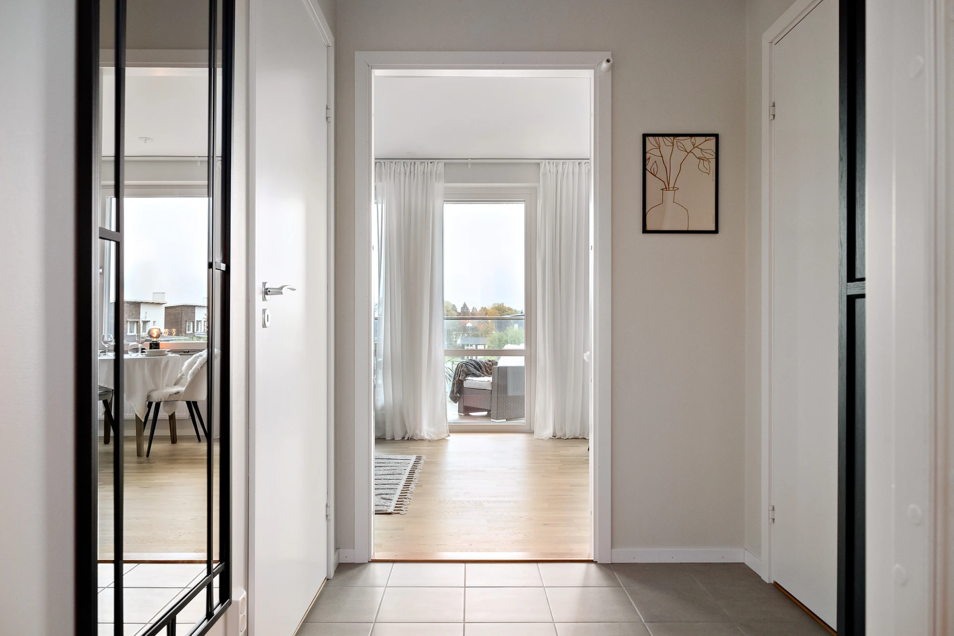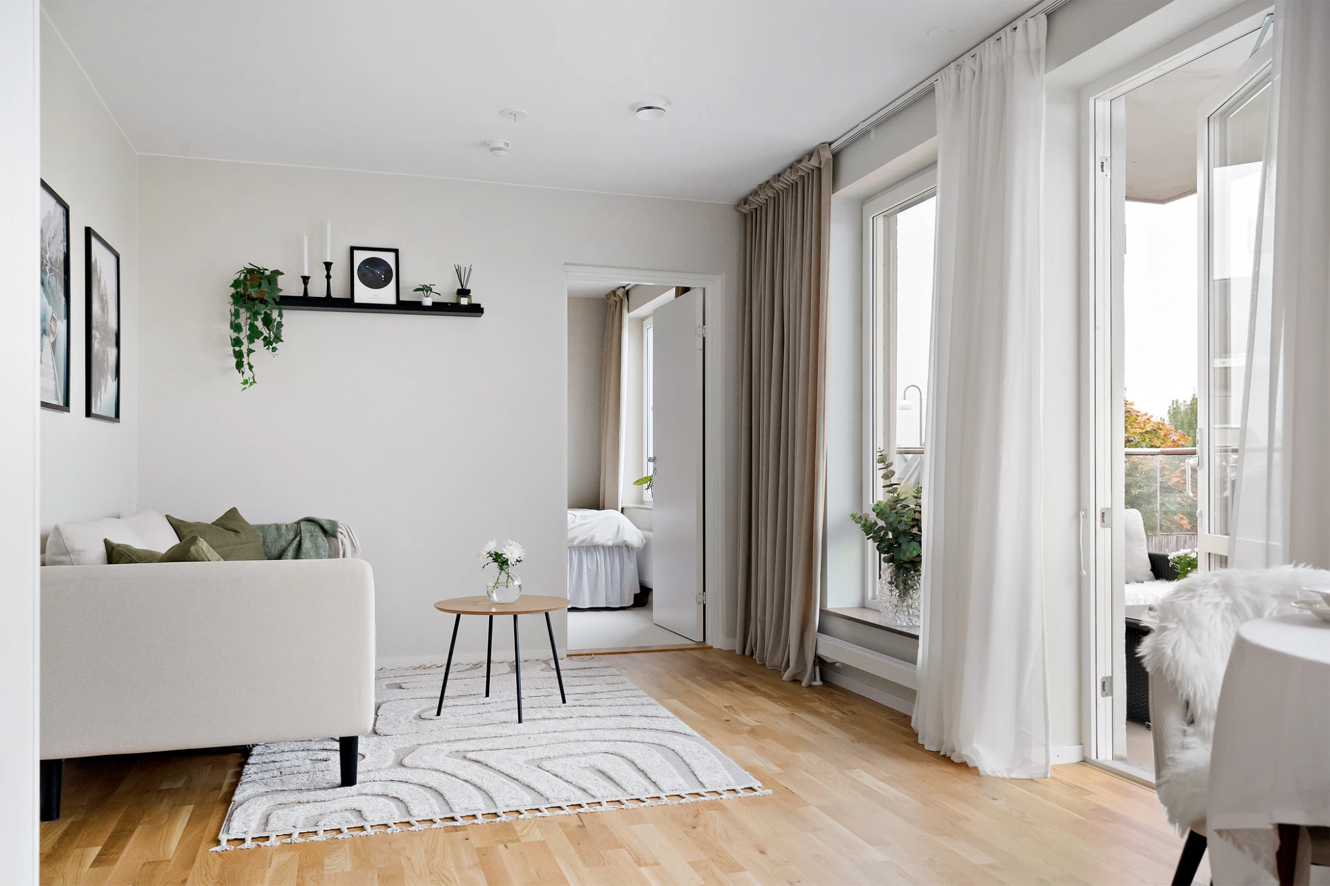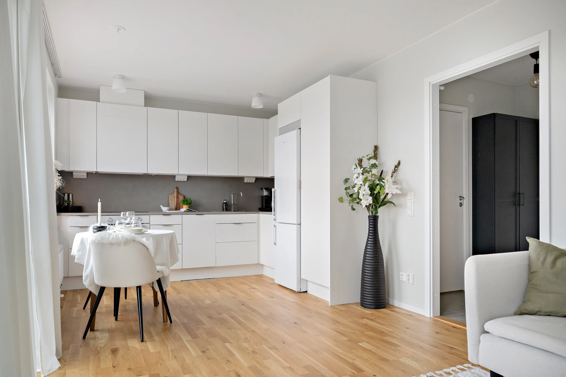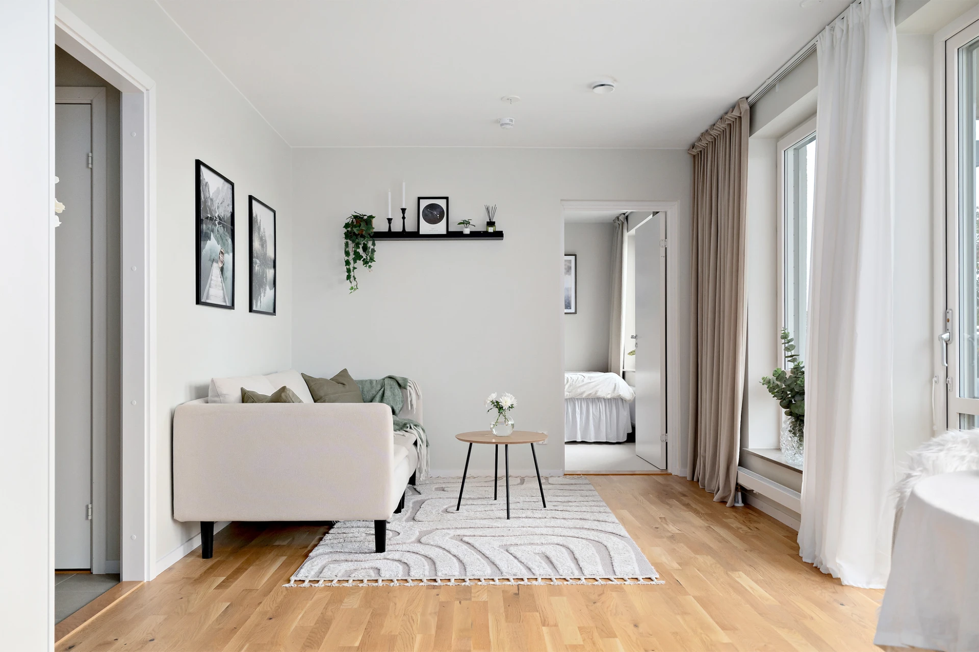 Lägenheten erbjuder en öppen planlösning mellan kök och vardagsrum som skapar en inbjudande och social yta – perfekt för både avkoppling och umgänge. De stora fönsterpartierna släpper in rikligt med ljus och förstärker känslan av rymd. Här ryms både matplats och soffgrupp. Från vardagsrummet nås den rymliga balkongen, som tack vare sin storlek rymmer såväl loungemöbler som grill, en perfekt plats för varma sommarkvällar. Vidare erbjuder bostaden ett rofyllt sovrum med plats för dubbelsäng och förvaring, ett helkaklat badrum med egen tvättutrustning samt en generös walk-in closet.