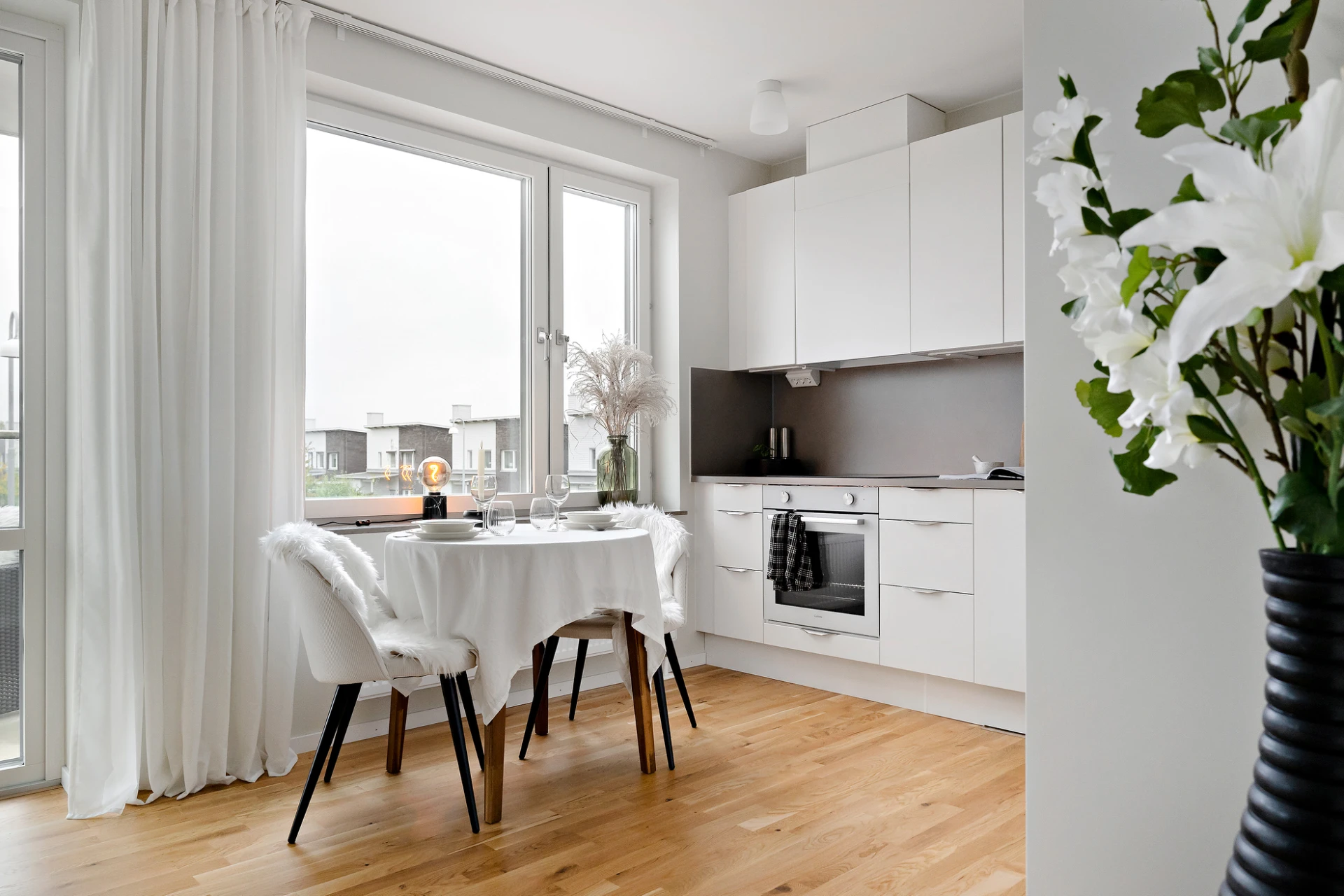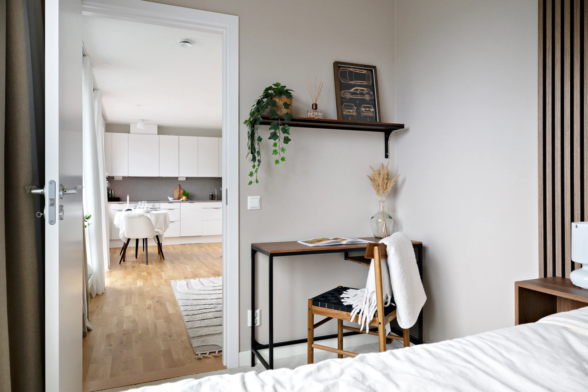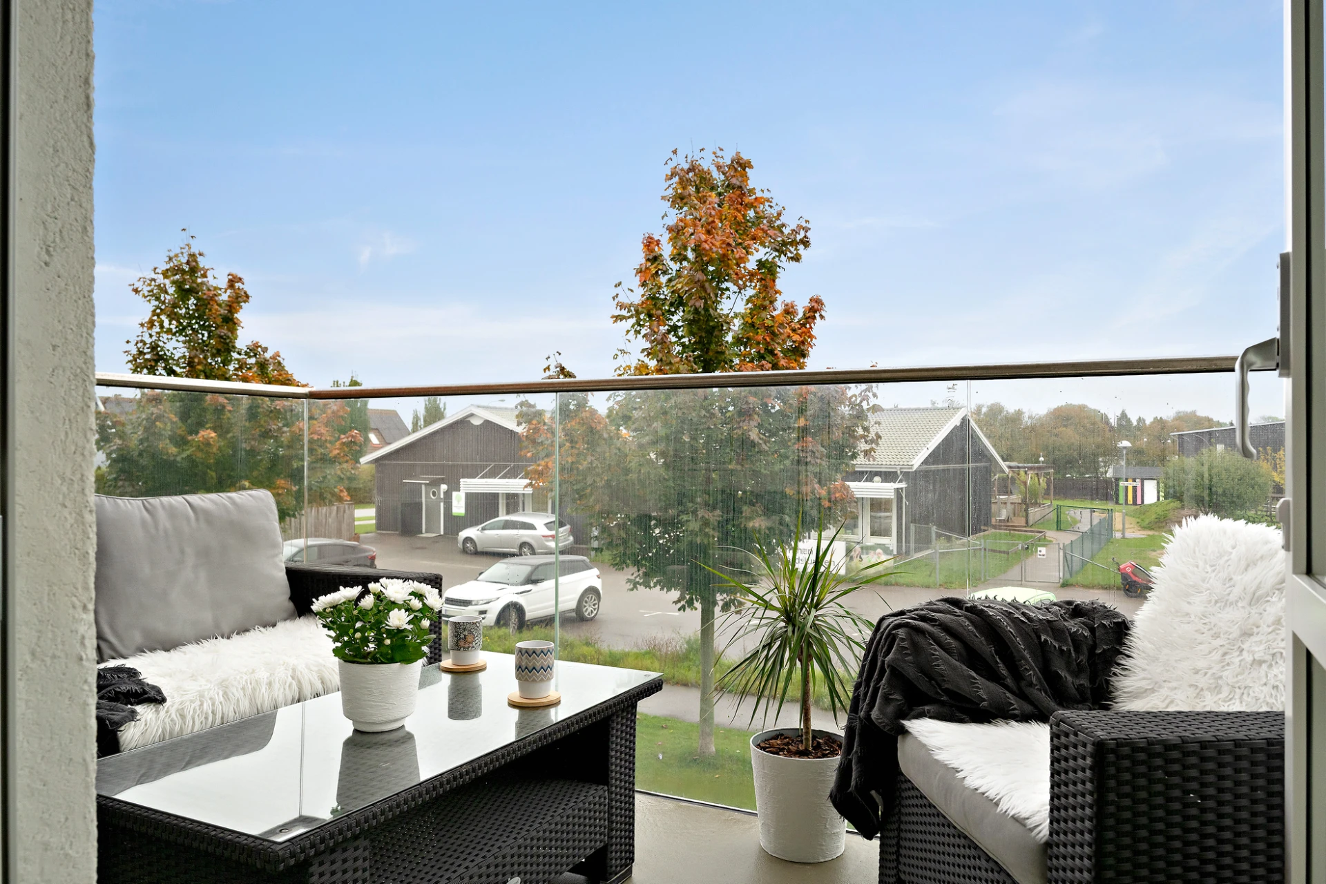 Lägenheten erbjuder en öppen planlösning mellan kök och vardagsrum som skapar en inbjudande och social yta – perfekt för både avkoppling och umgänge. De stora fönsterpartierna släpper in rikligt med ljus och förstärker känslan av rymd. Här ryms både matplats och soffgrupp. Från vardagsrummet nås den rymliga balkongen, som tack vare sin storlek rymmer såväl loungemöbler som grill, en perfekt plats för varma sommarkvällar. Vidare erbjuder bostaden ett rofyllt sovrum med plats för dubbelsäng och förvaring, ett helkaklat badrum med egen tvättutrustning samt en generös walk-in closet.