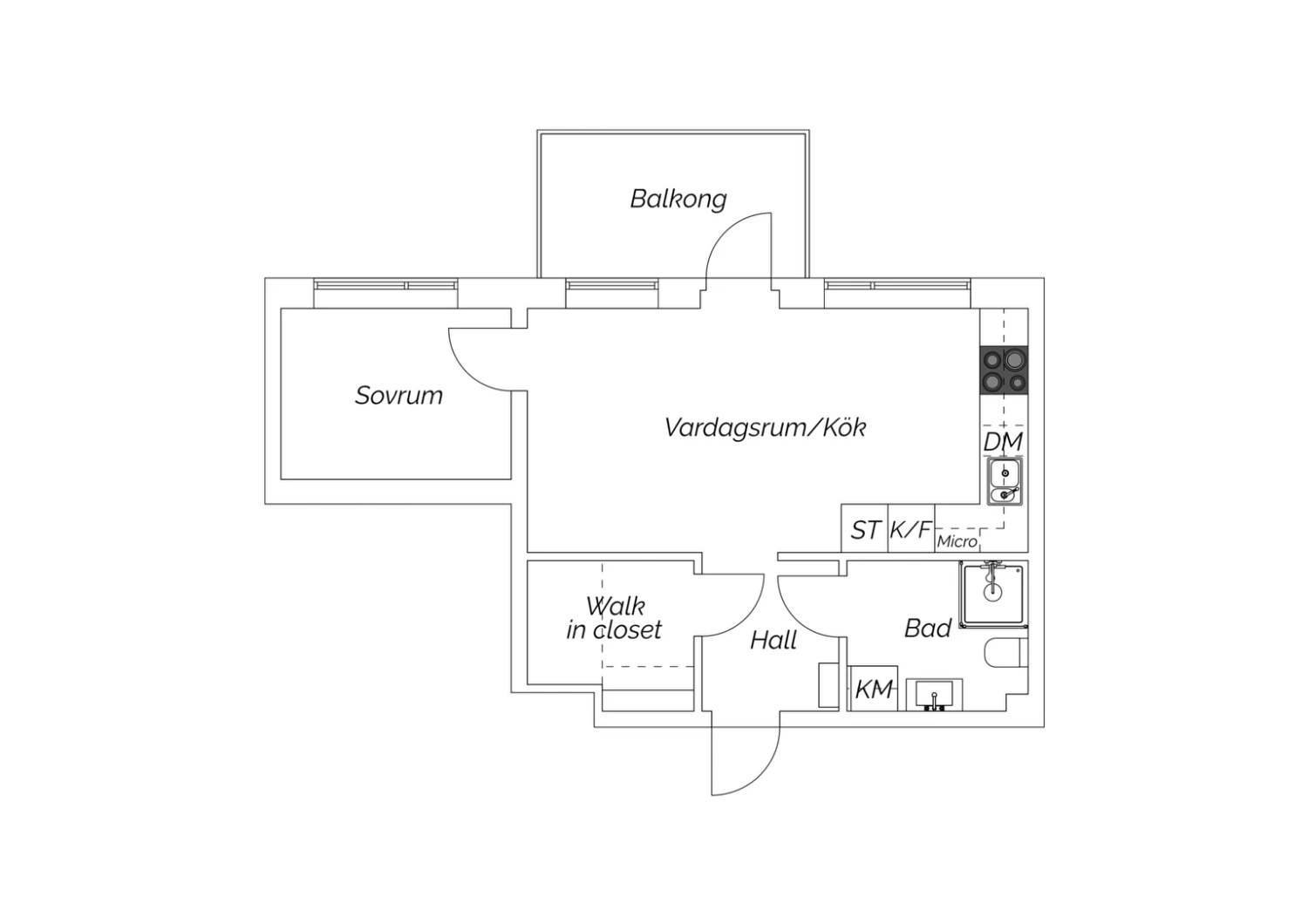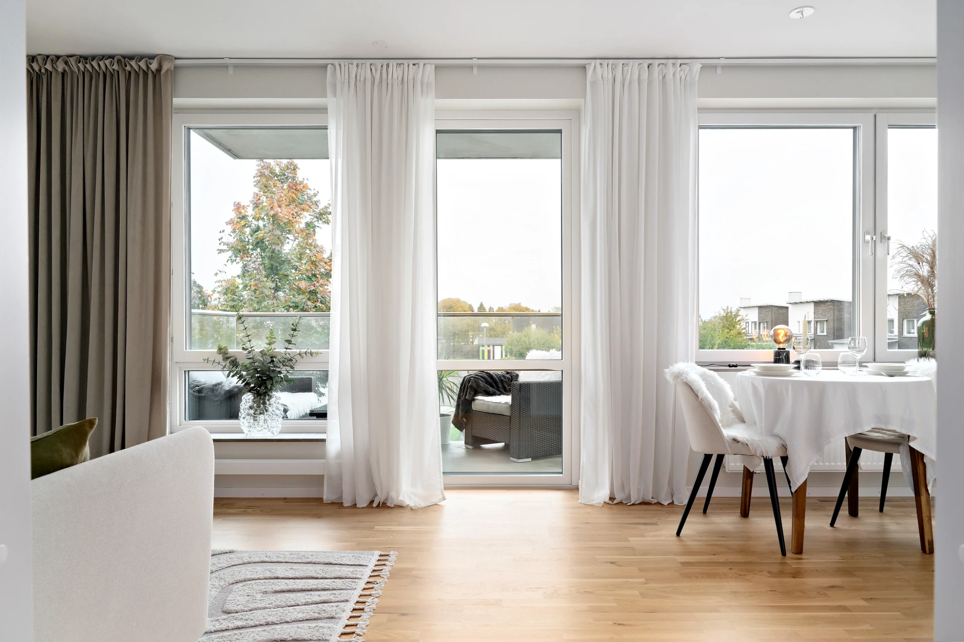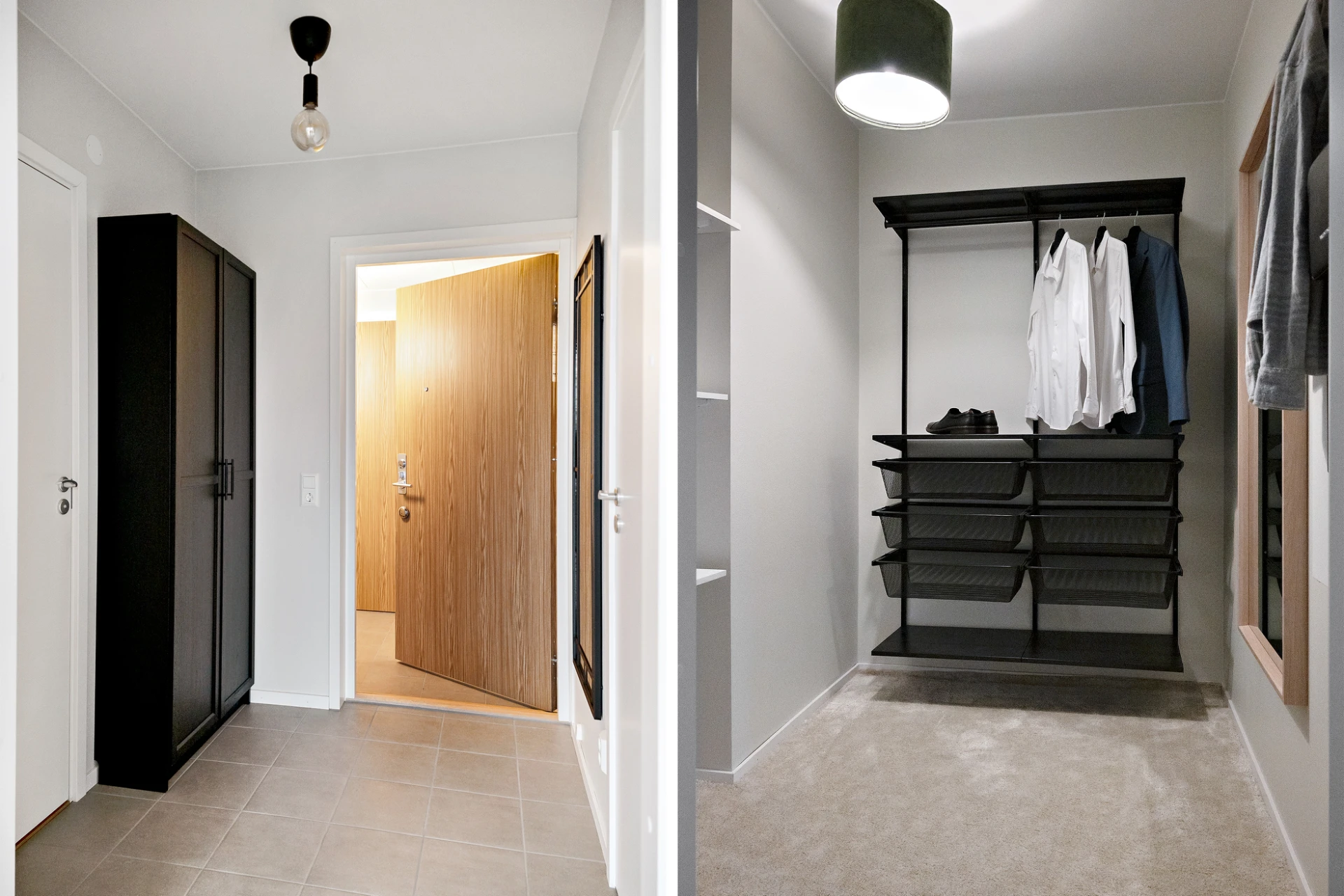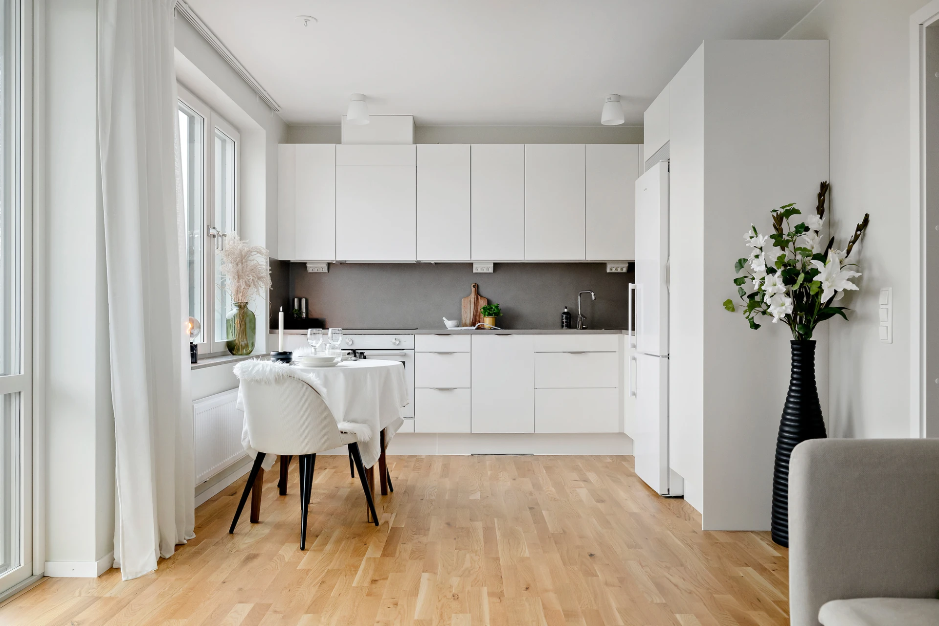 Lägenheten erbjuder en öppen planlösning mellan kök och vardagsrum som skapar en inbjudande och social yta – perfekt för både avkoppling och umgänge. De stora fönsterpartierna släpper in rikligt med ljus och förstärker känslan av rymd. Här ryms både matplats och soffgrupp. Från vardagsrummet nås den rymliga balkongen, som tack vare sin storlek rymmer såväl loungemöbler som grill, en perfekt plats för varma sommarkvällar. Vidare erbjuder bostaden ett rofyllt sovrum med plats för dubbelsäng och förvaring, ett helkaklat badrum med egen tvättutrustning samt en generös walk-in closet.