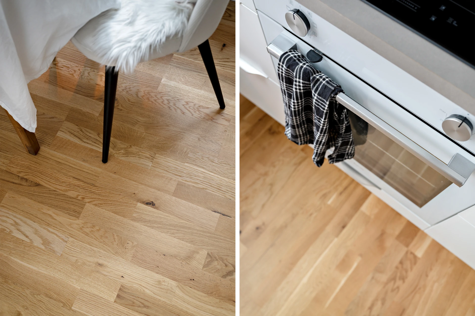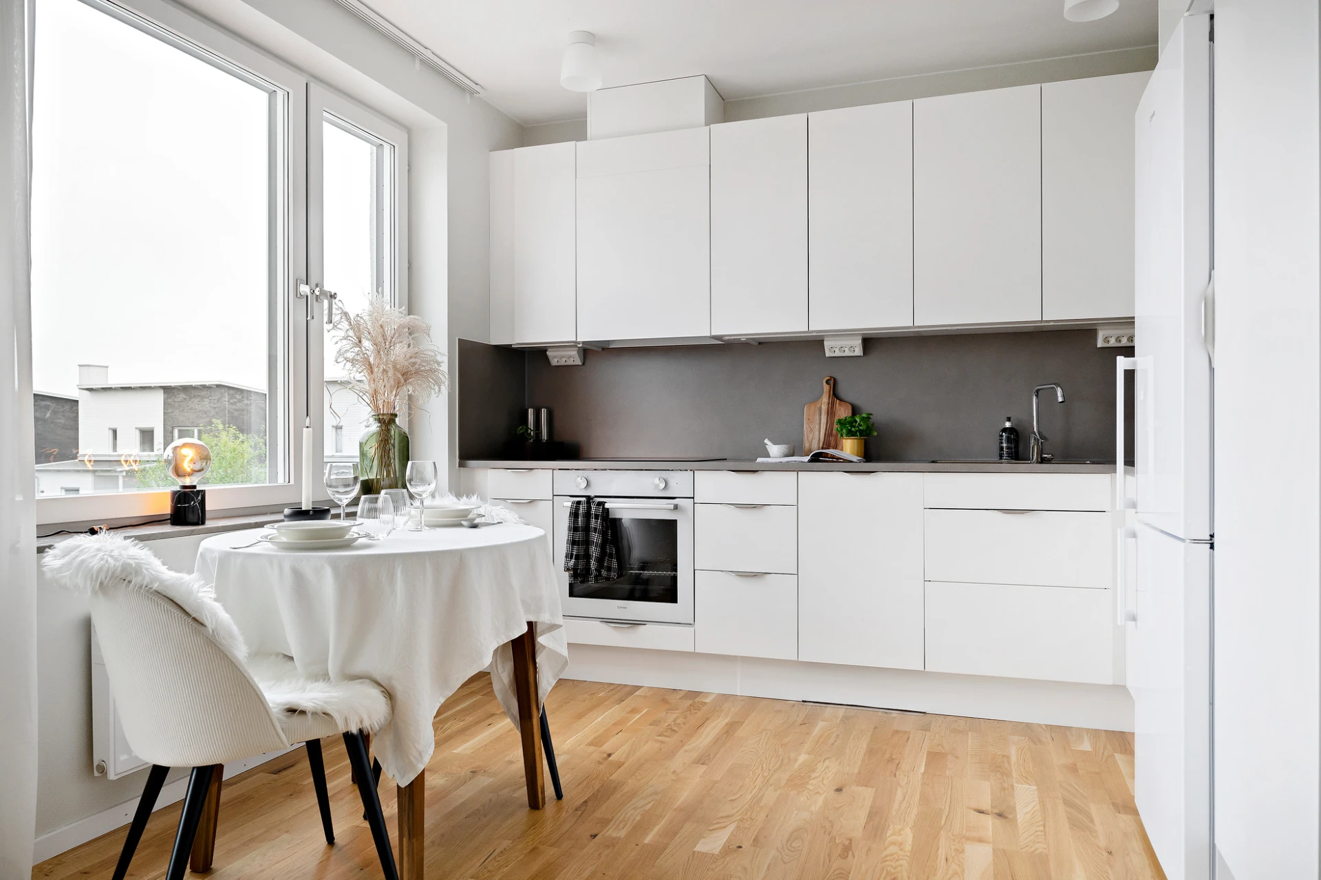 Ekparkett och vita väggar. Vita köksluckor, stänkskydd och bänkskiva i grå laminat. Köket är utrustat med kyl/frys, spis, ugn, diskmaskin och micro.