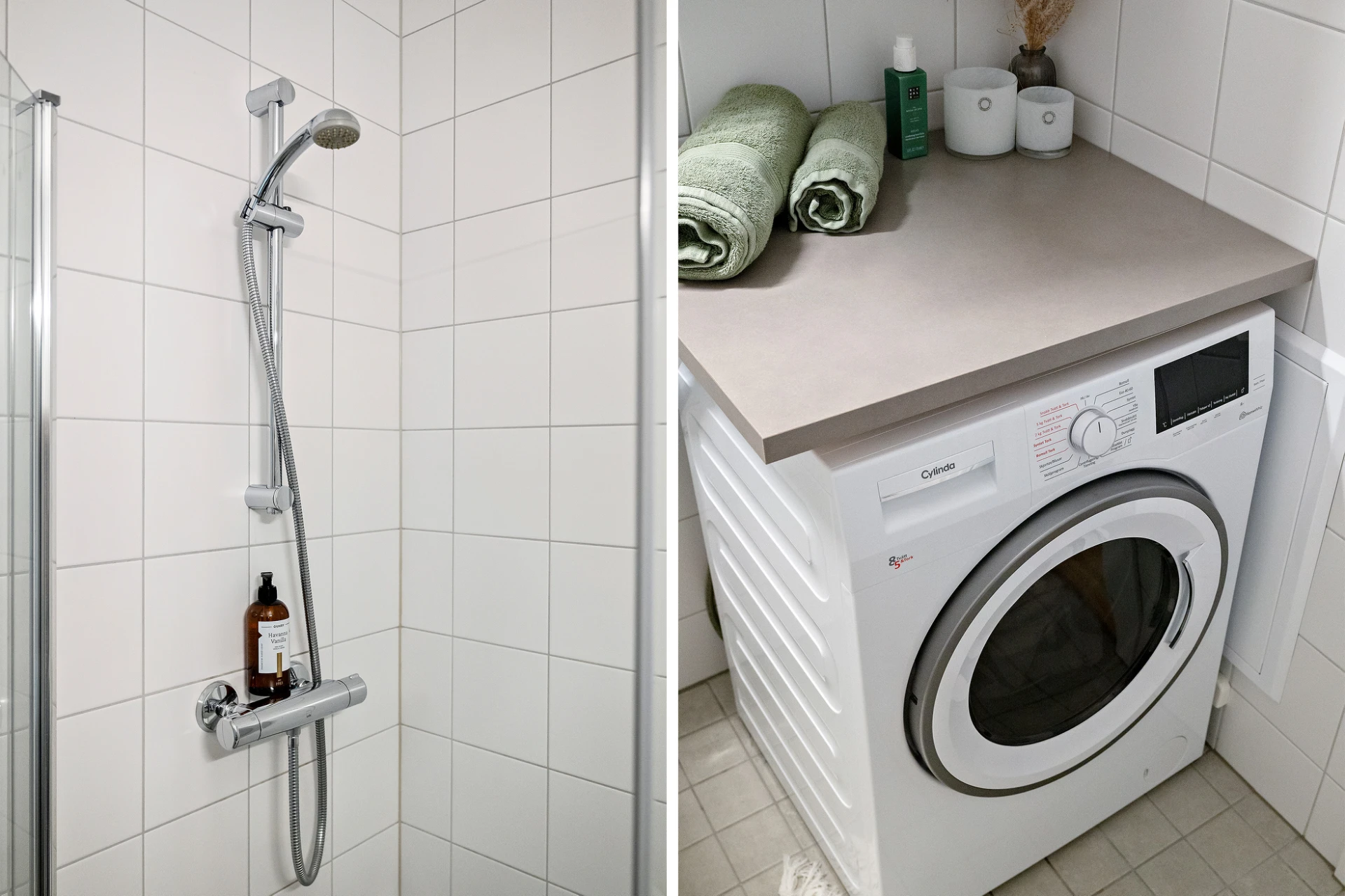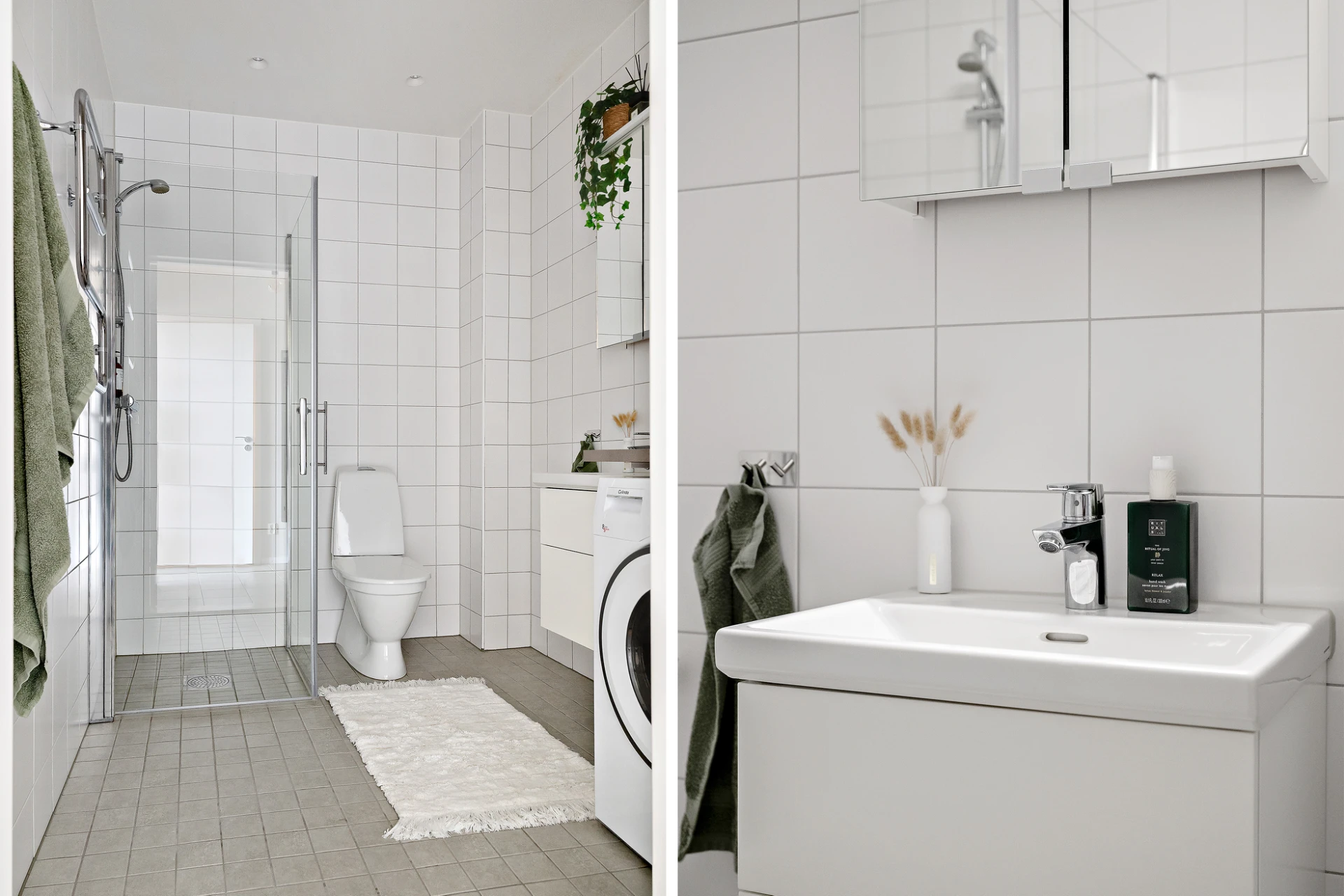 Grå klinker och vitt kakel. Badrummet är utrustat med WC, handfat med kommod, spegelskåp, dusch, handdukstork och kombinerad tvättmaskin/torktumlare.