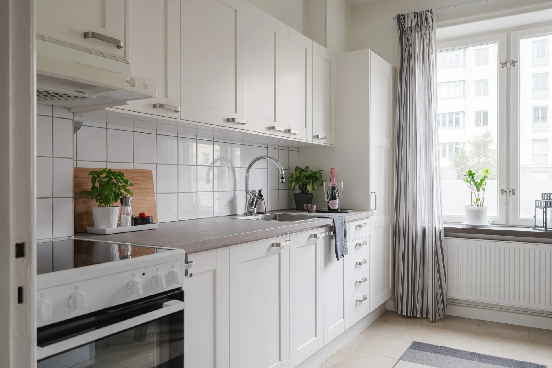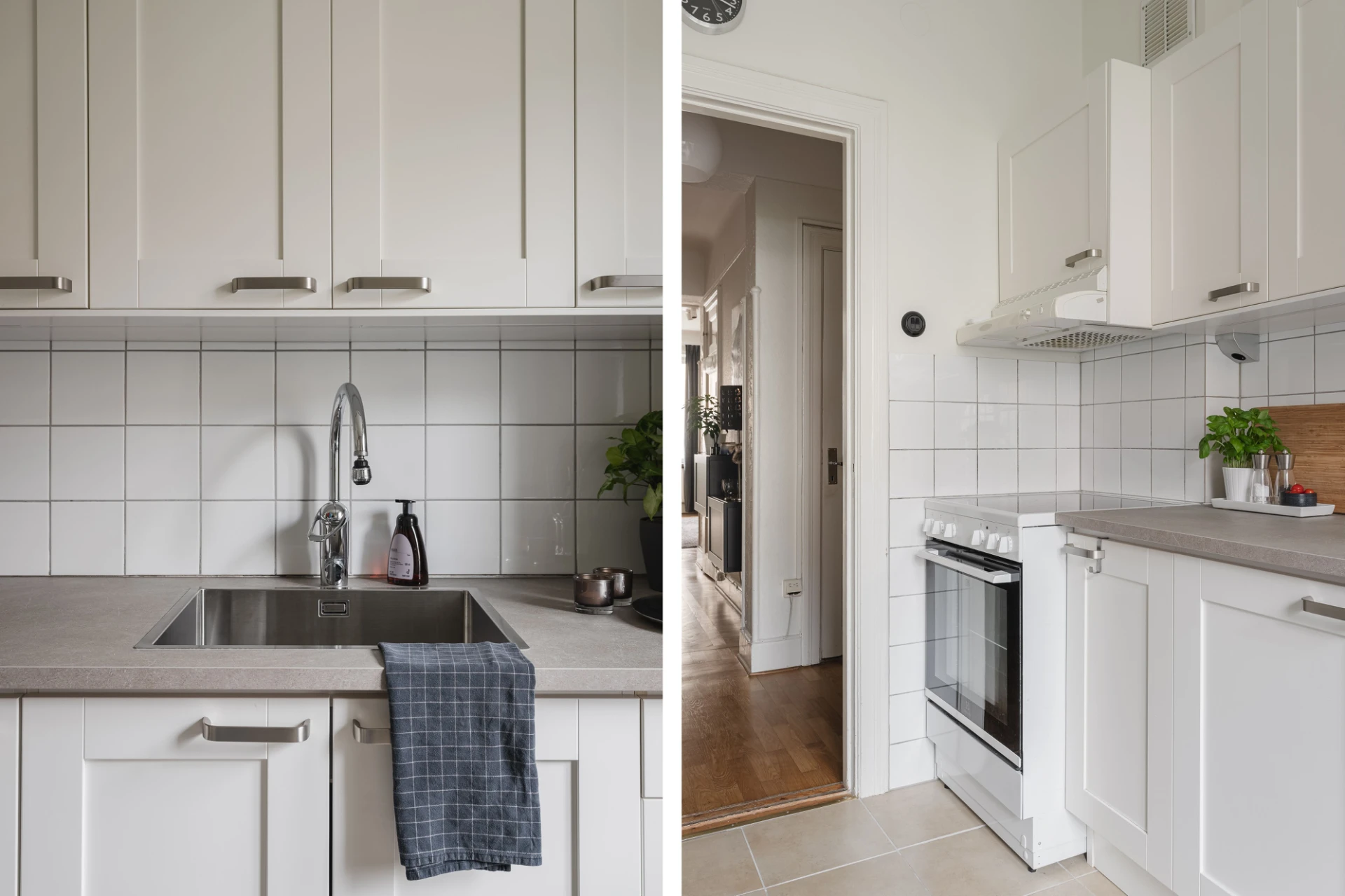 Beige klinkergolv, vita väggar samt ljusgrå fondvägg. Vit köksinredning med vitt kakel ovanför arbetsbänk av laminat i gråbeige kulör. Köket är utrustat med kyl/frys Cylinda 2022, spis med keramisk häll Electrolux 2024 samt fläkt. Gott om förvaringsskåp. Matplats för 2-4 personer.