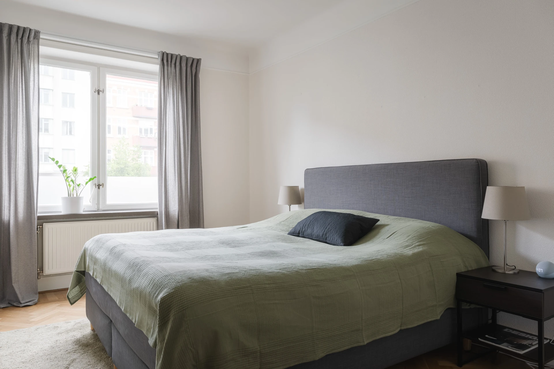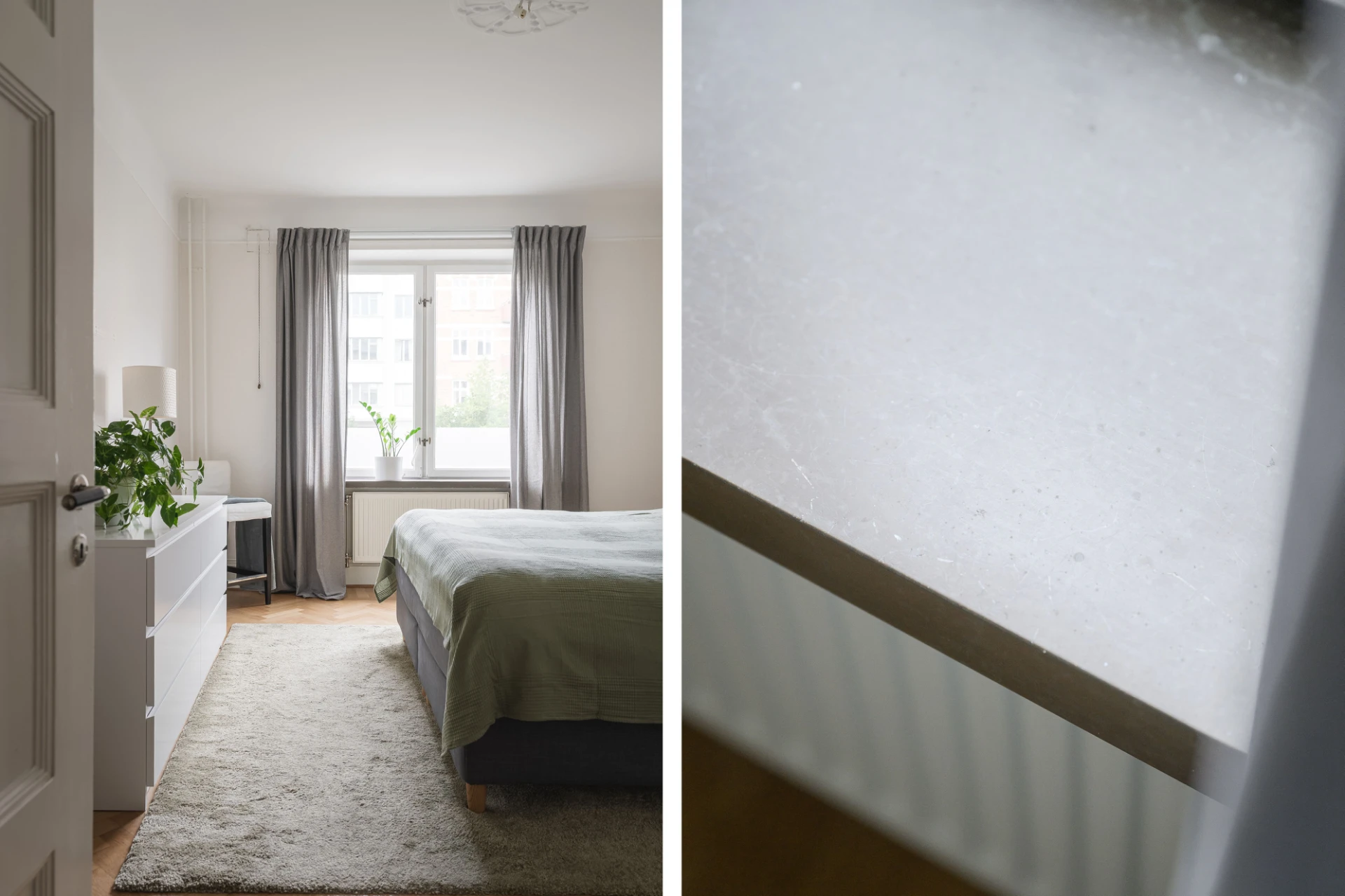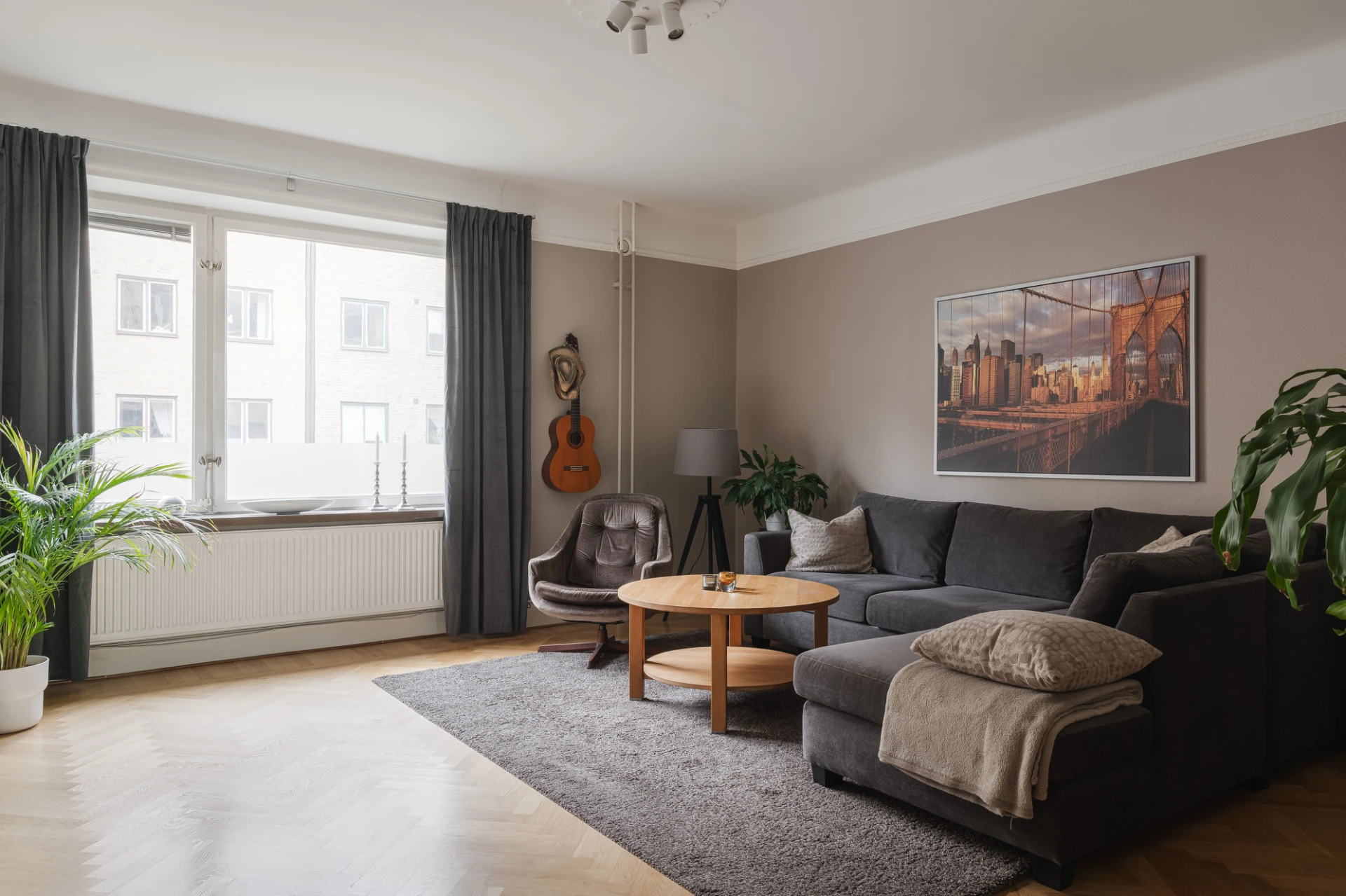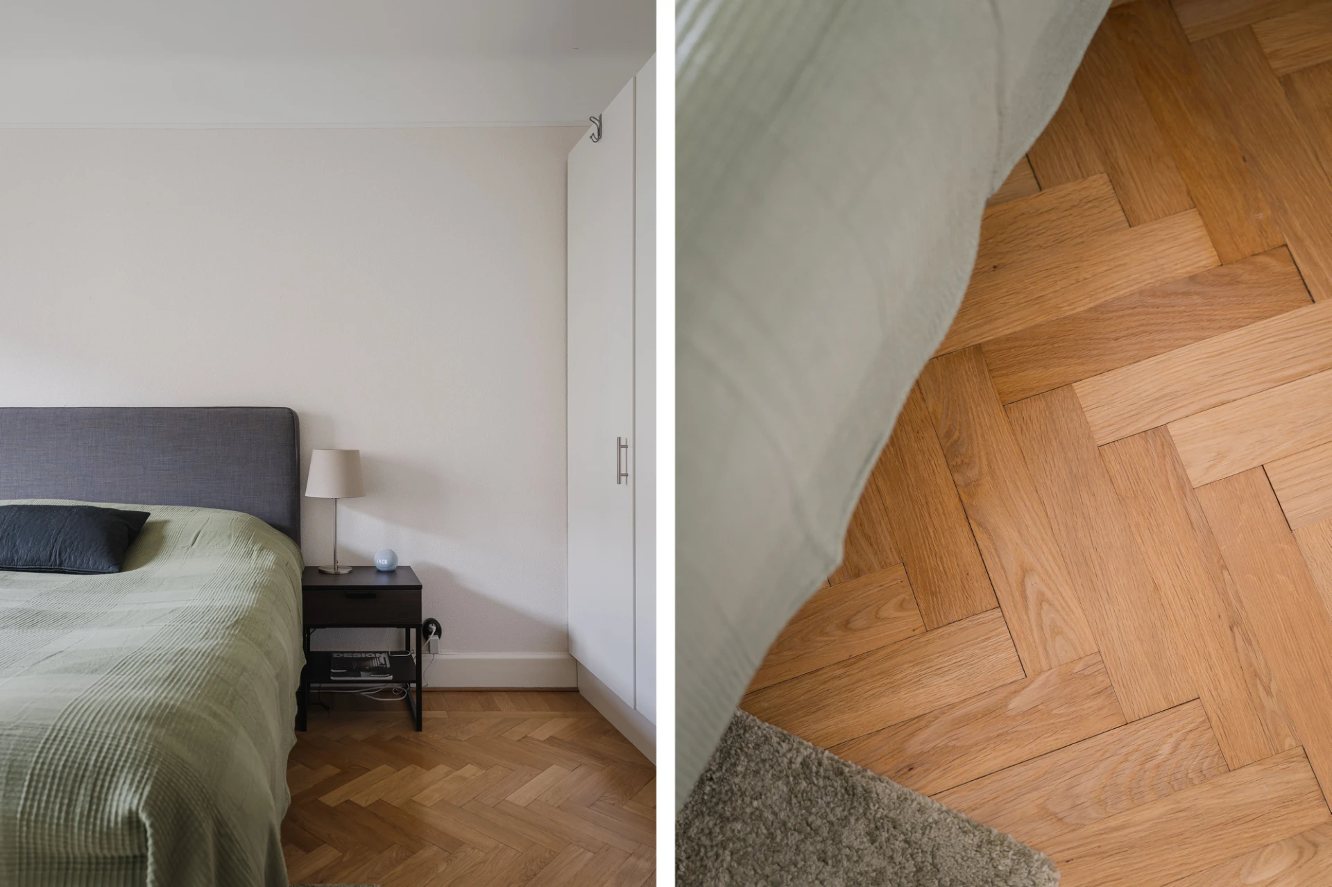 Fiskbensmönstrad ekparkett och ljusgråa väggar. Tidstypisk takrosett. Klädkammare.
