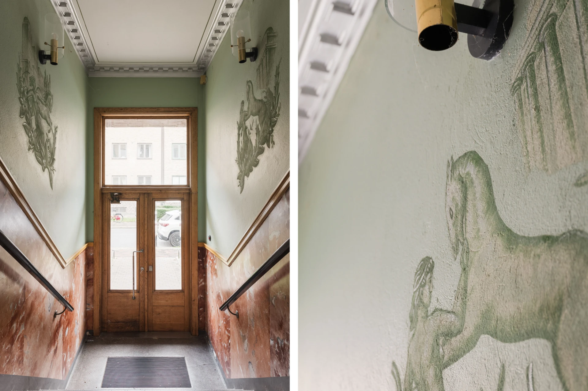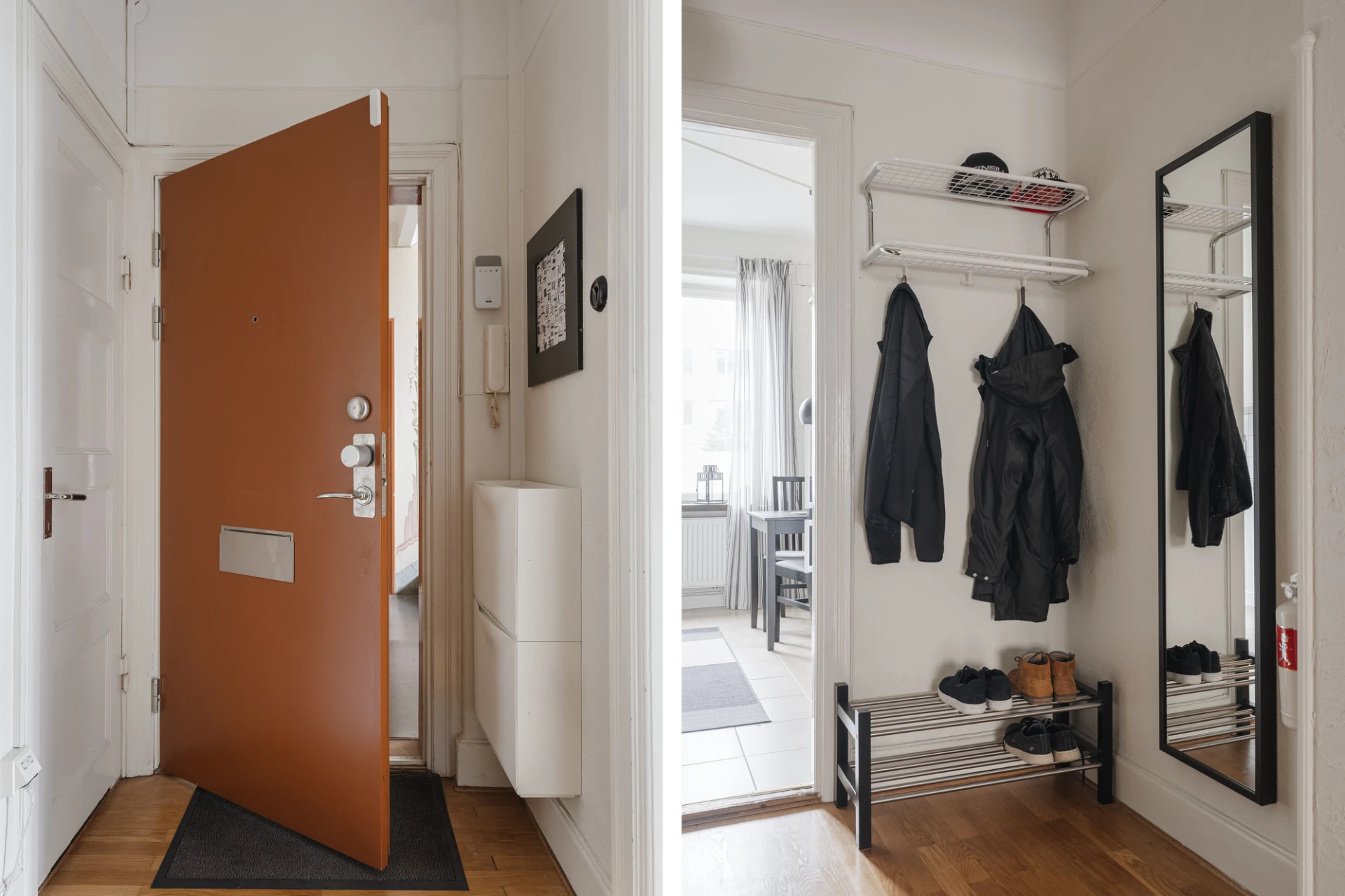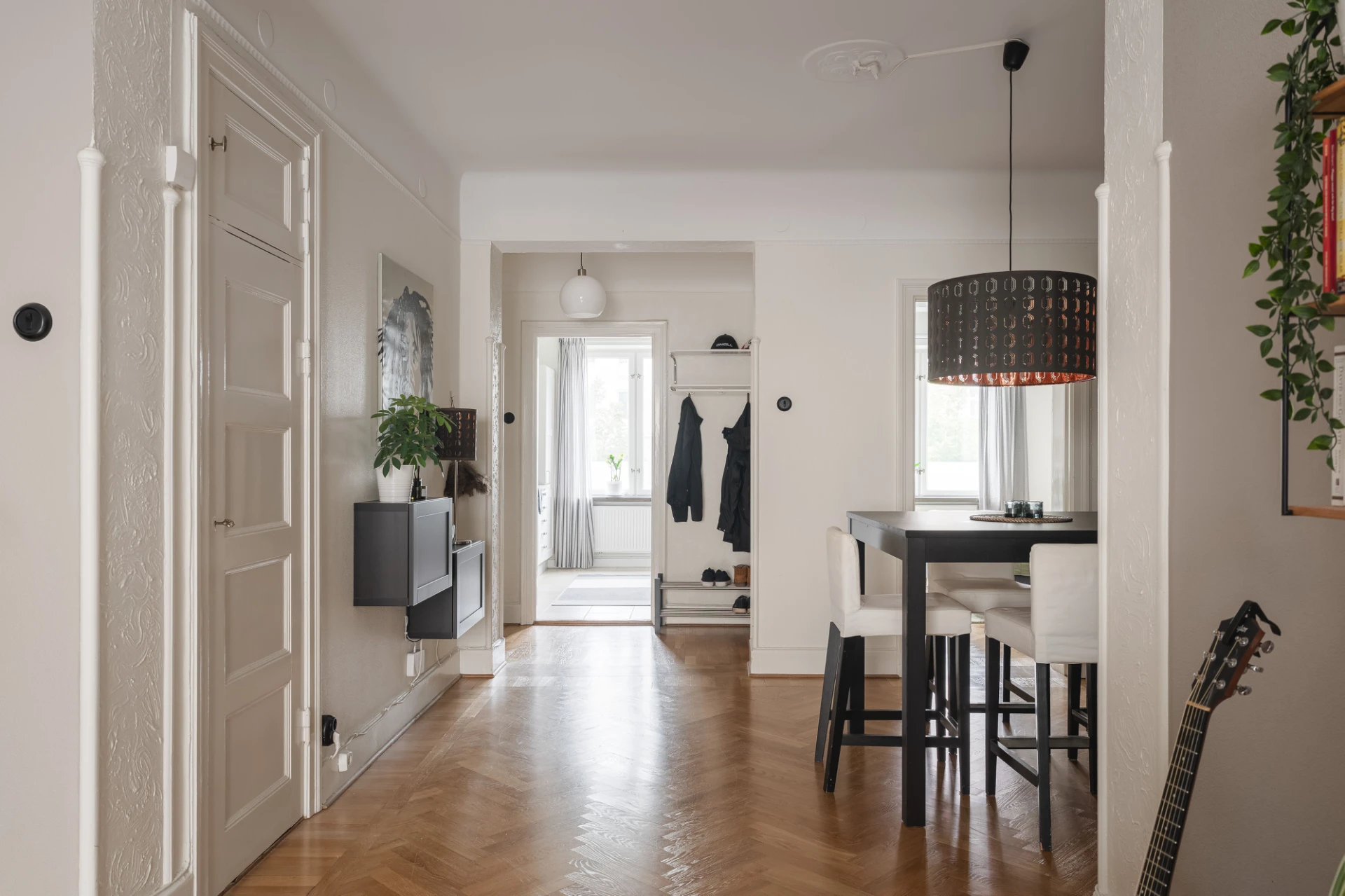 Inbjudande entré med parkettgolv och vita, tapetserade väggar. Plats för avhängning.