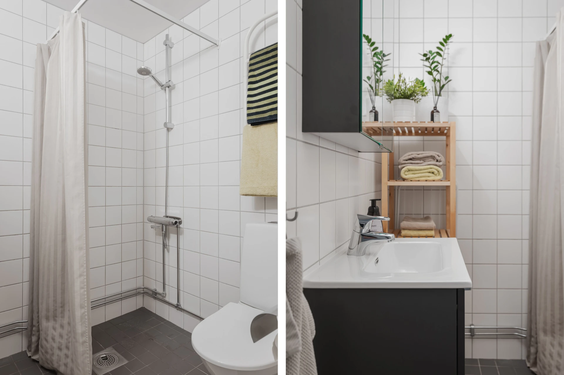 Mörkgrått klinker på golvet och vitt kakel på väggarna. Badrummet är utrustat med handdukstork, dusch och 2025 installerades följande ny utrustning; WC stol, kommod/tvättställ, spegelskåp, dusch-/badkarsblandare. Badkar finns (i källarförrådet).