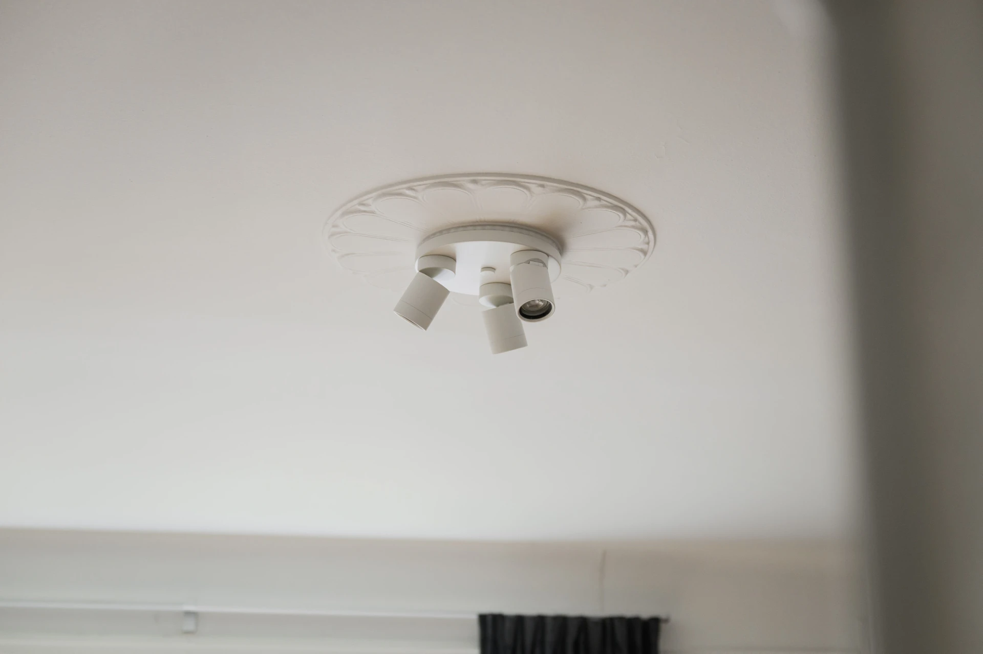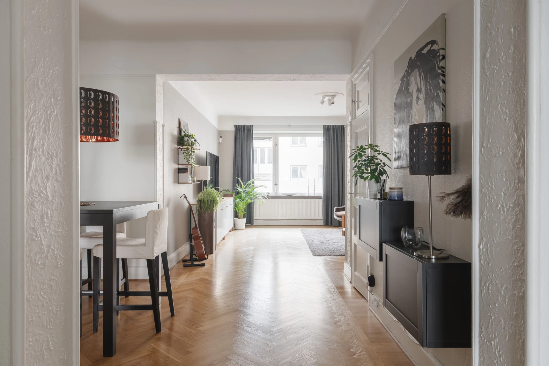 Fiskbensmönstrad ekparkett och beigemålade, tapetserade väggar. Tidstypisk takrosett.
