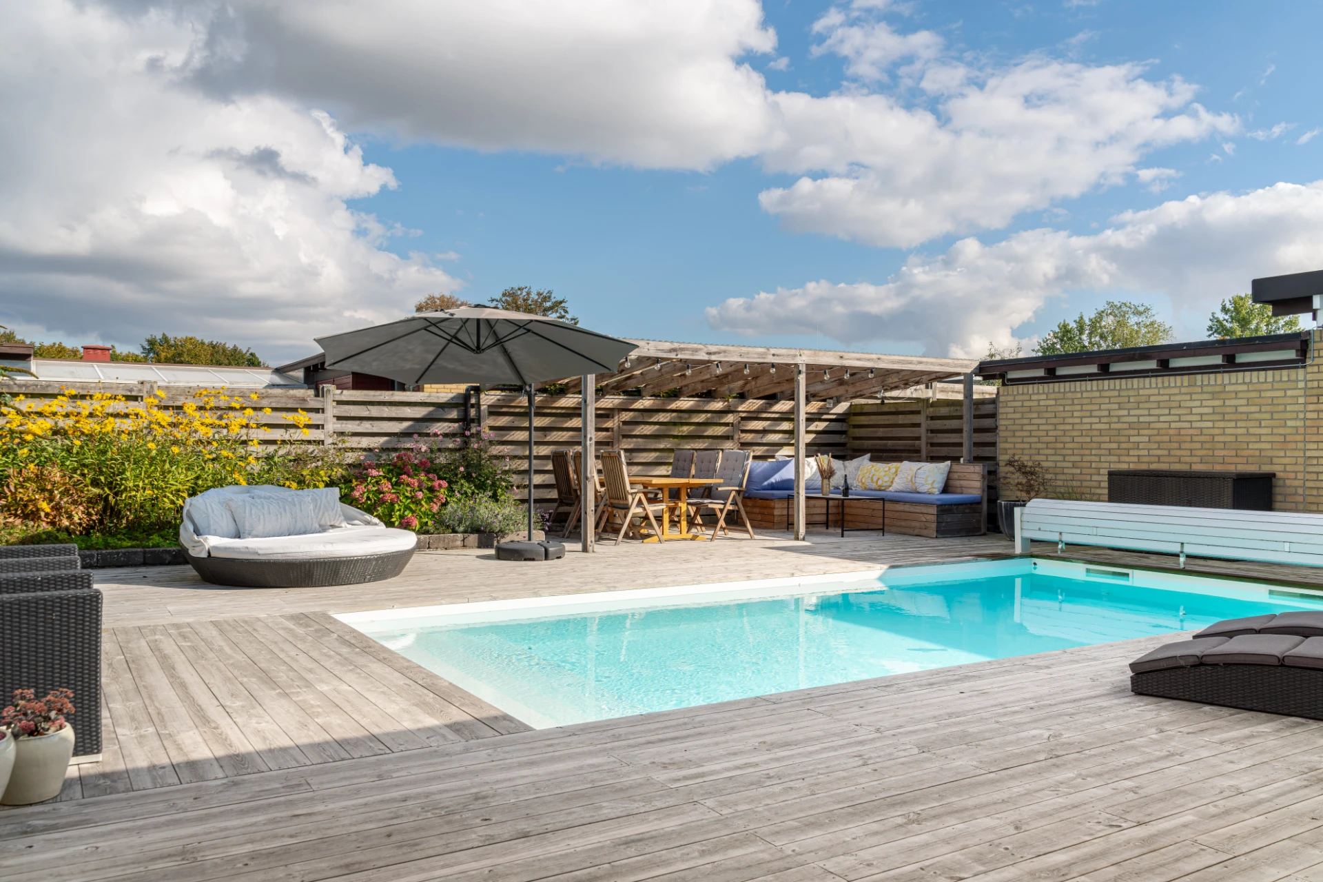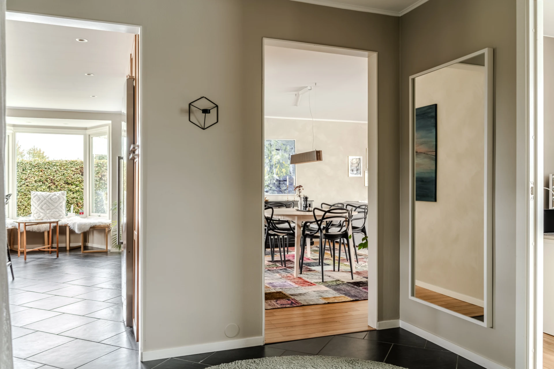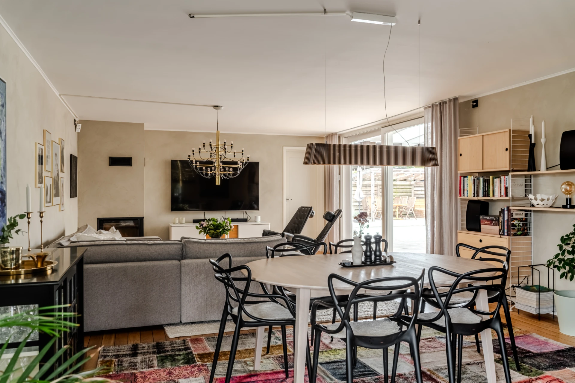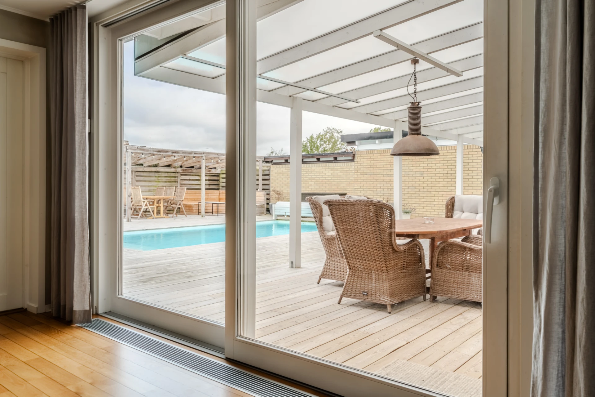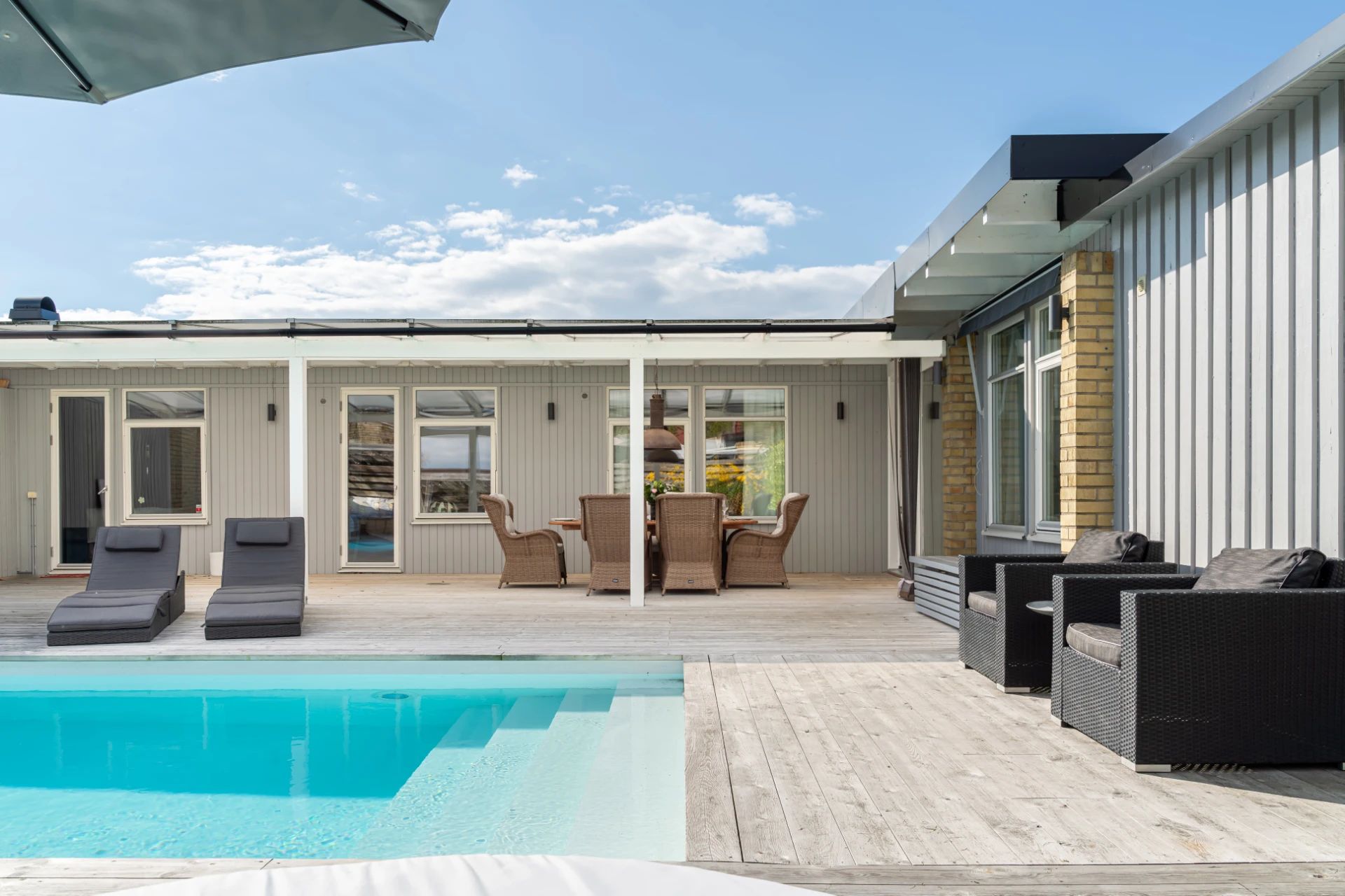 Parkettgolv och väggar målade i kalkfärg från Jotun i ljust beige. Utgång via skjutdörrsparti till trädäck och poolområde. Belysning med dimmer.