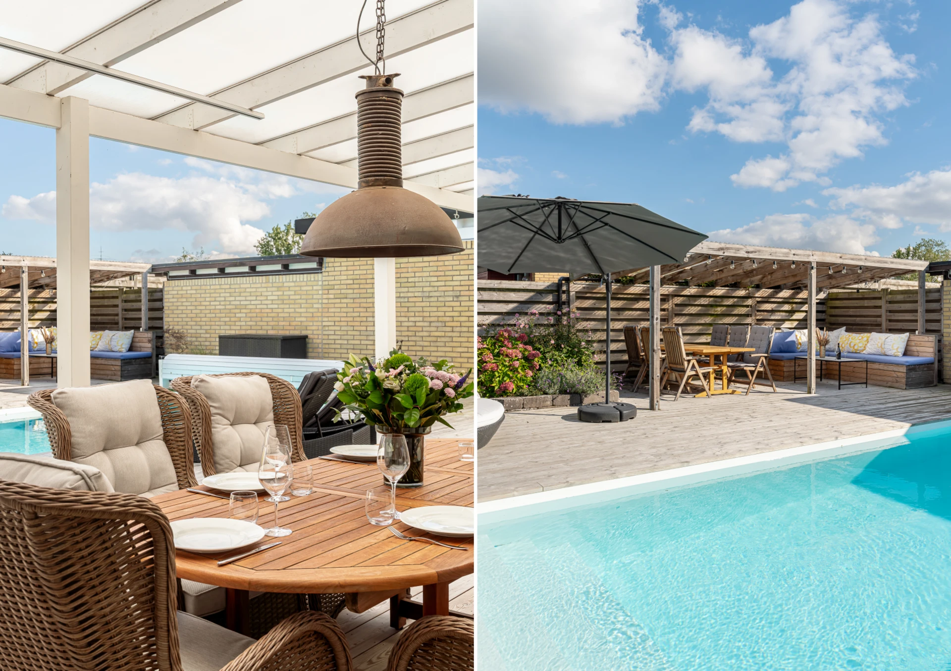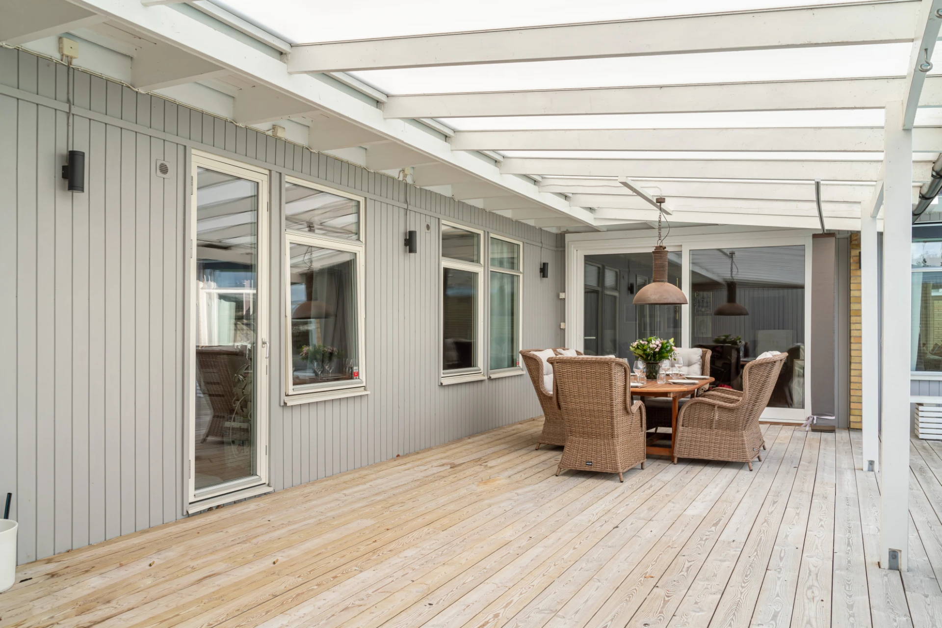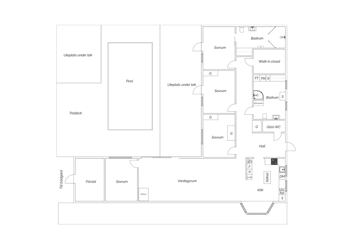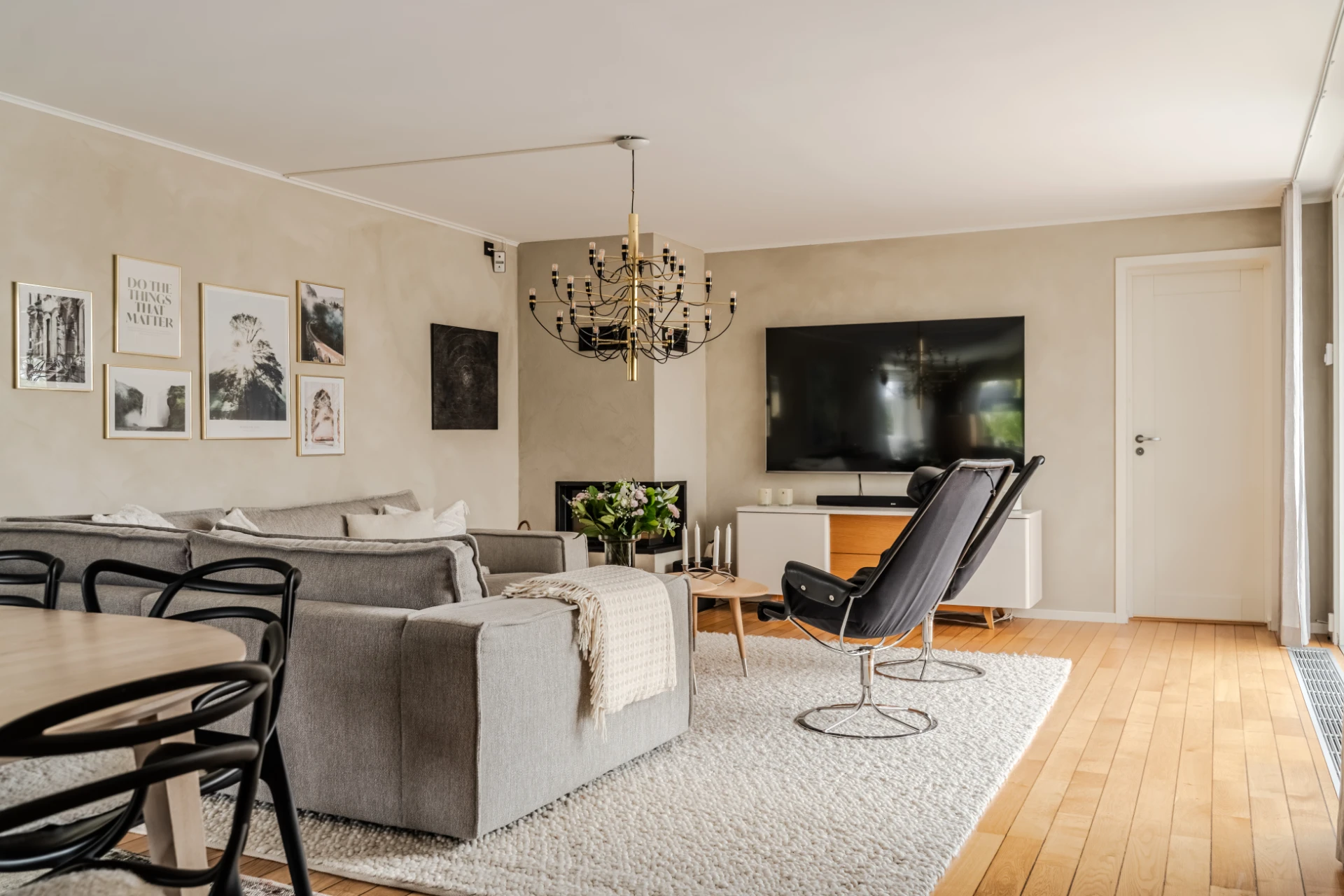 Parkettgolv och väggar målade i kalkfärg från Jotun i ljust beige. Utgång via skjutdörrsparti till trädäck och poolområde. Belysning med dimmer.