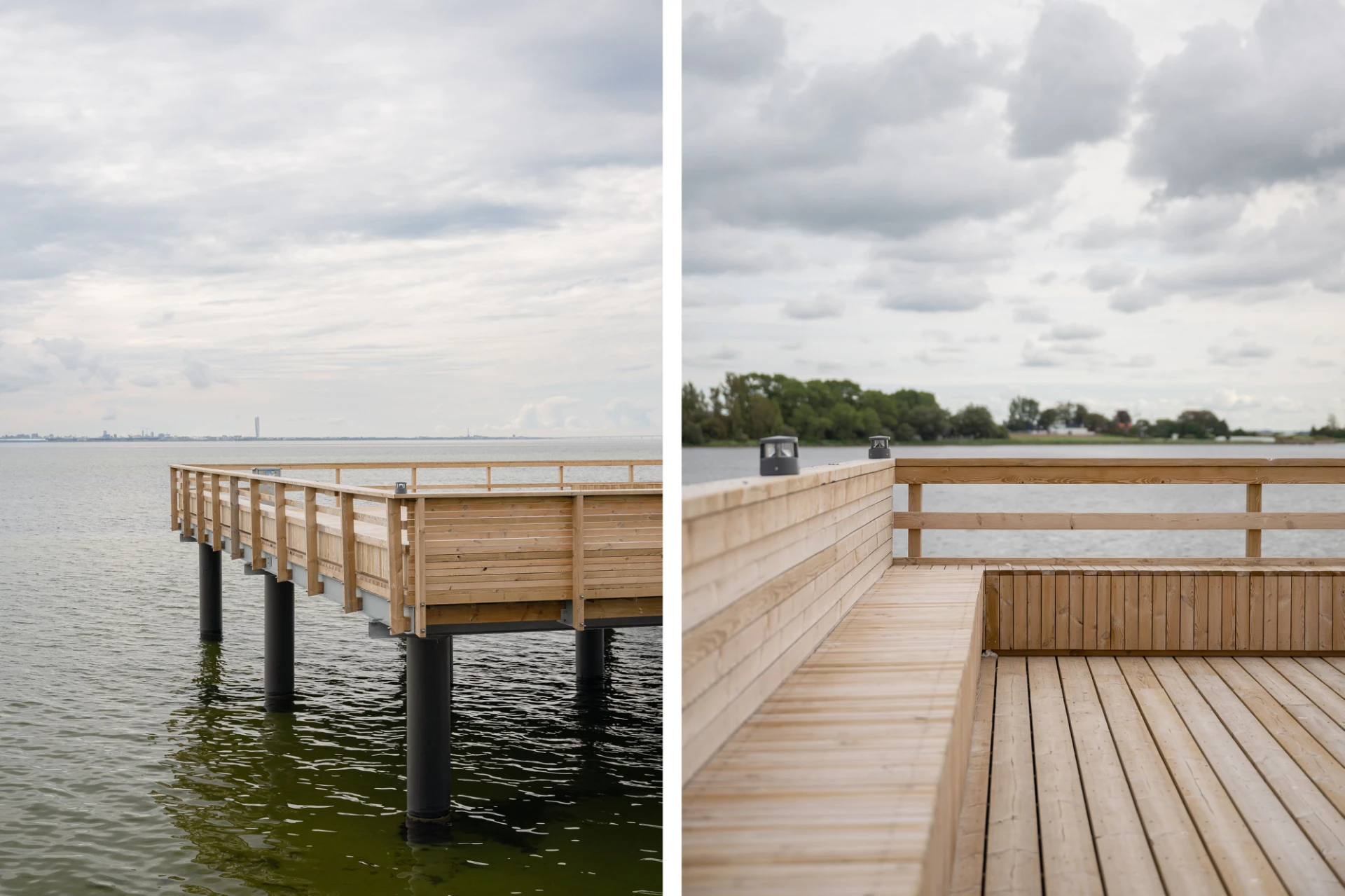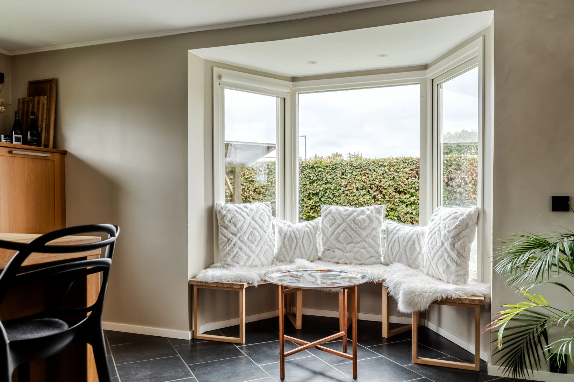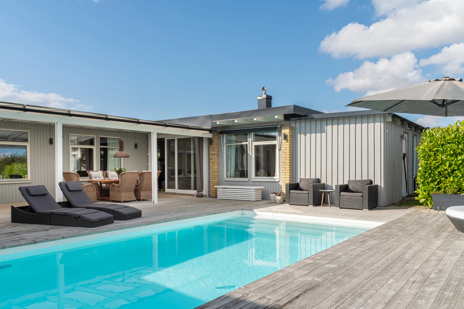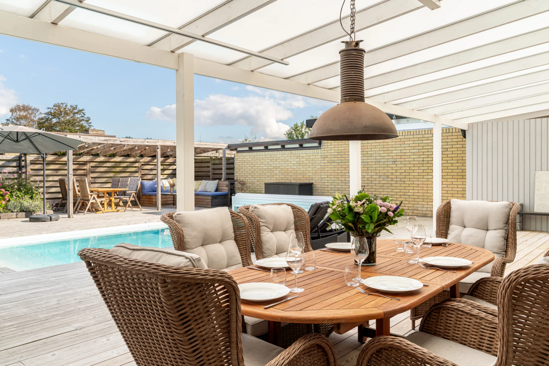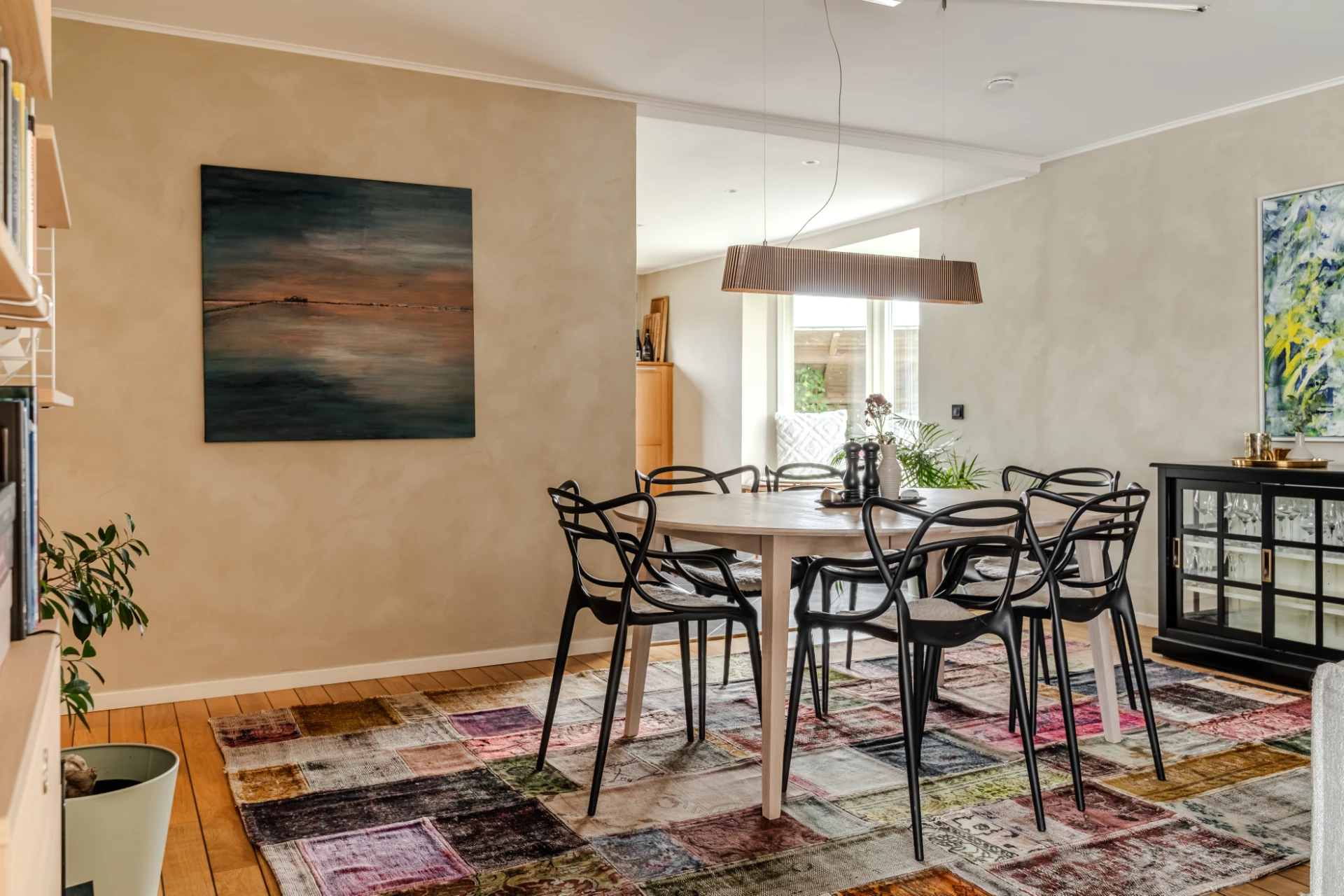 Parkettgolv och väggar målade i kalkfärg från Jotun i ljust beige. Utgång via skjutdörrsparti till trädäck och poolområde. Belysning med dimmer.