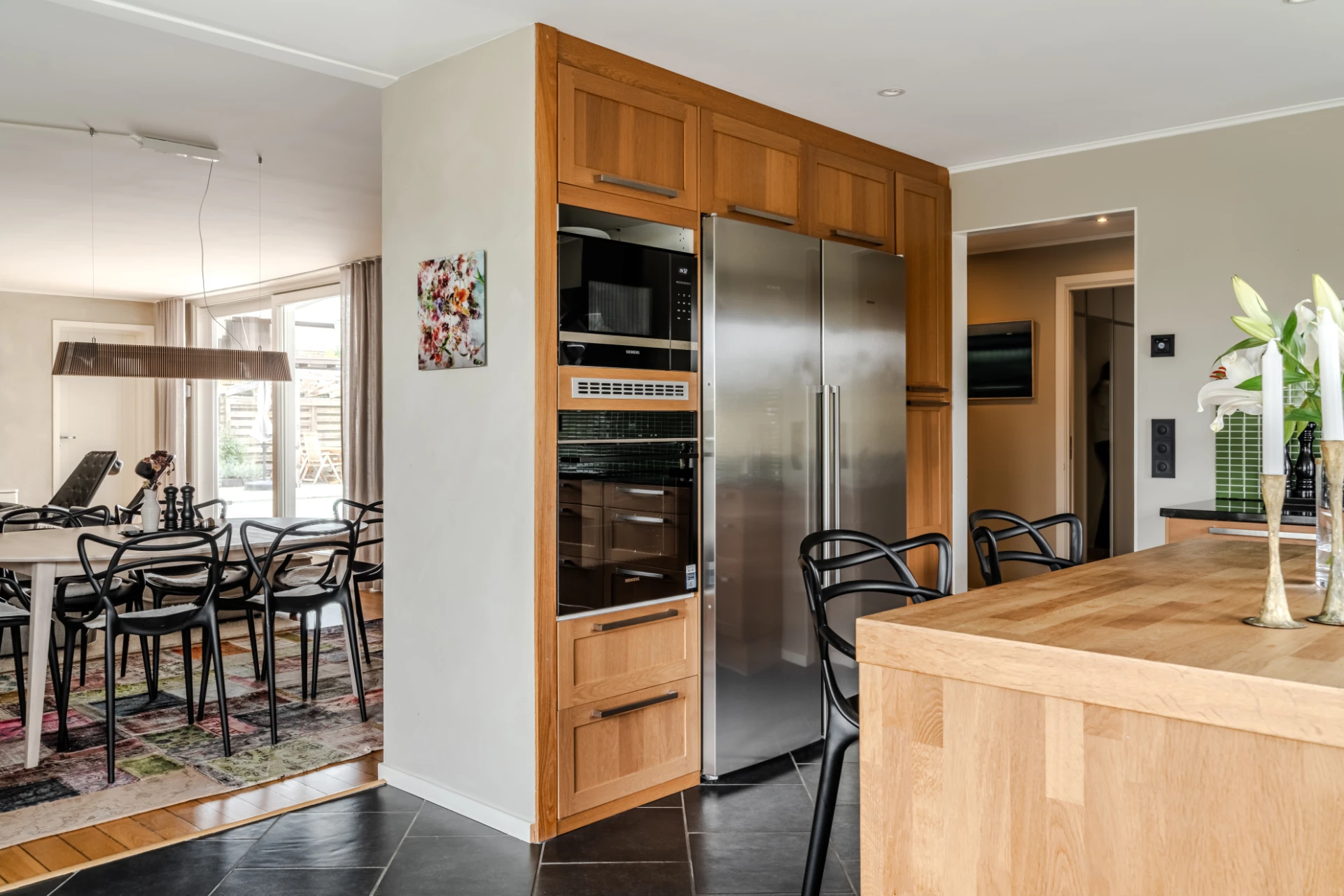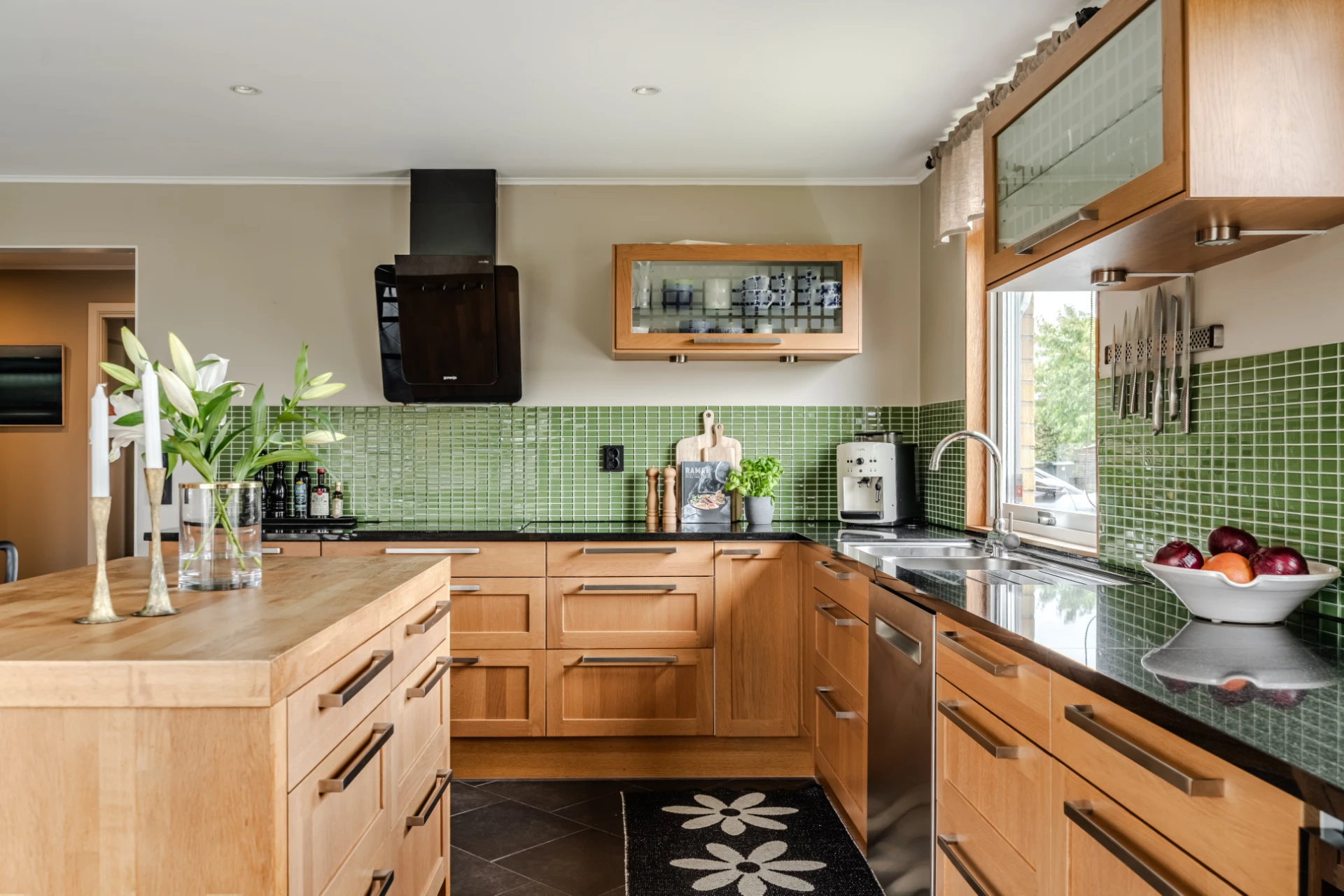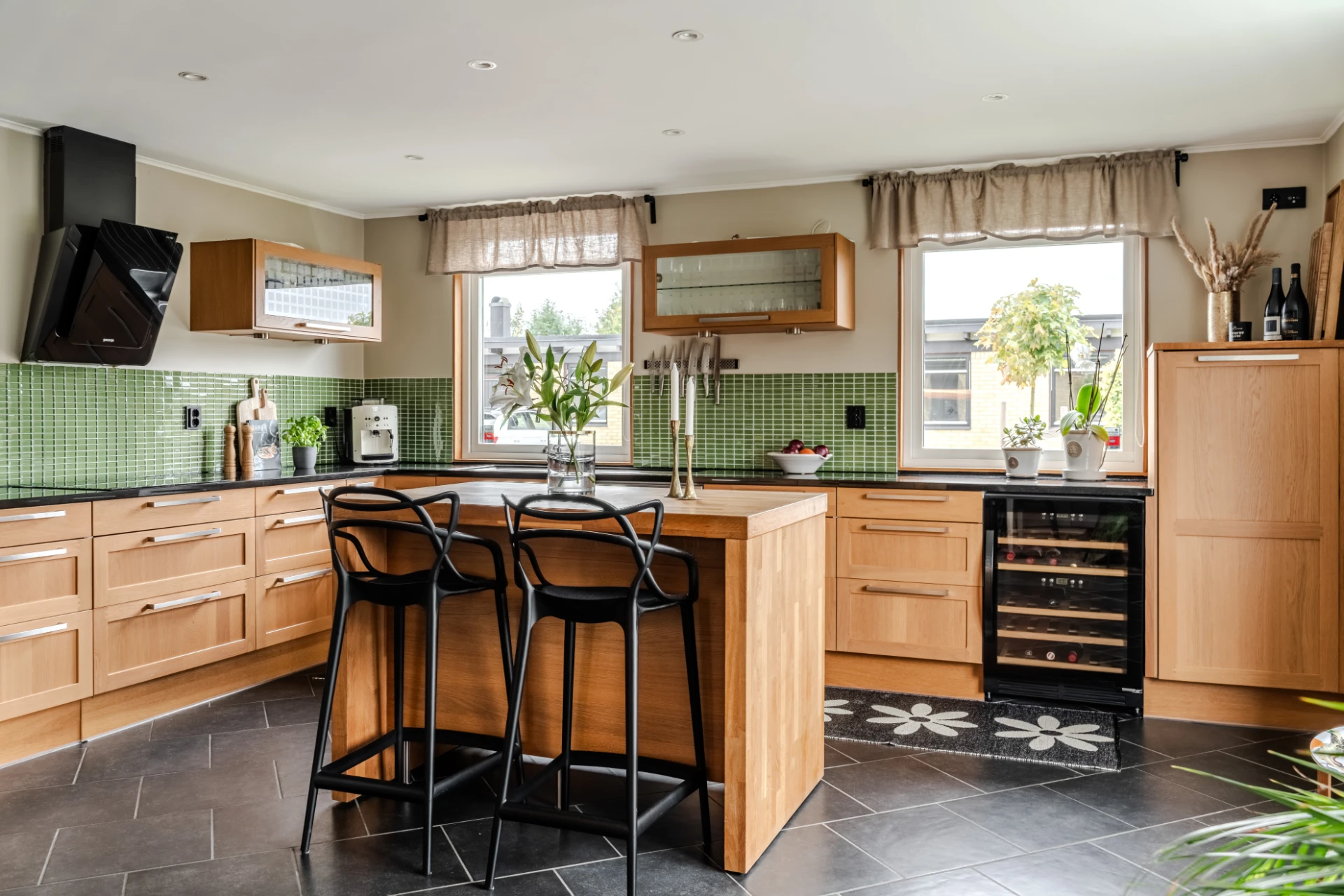 Mörkgrå klinker och väggar målade i ljust beige. Köksinredning i ek från IKEA, köksbänk i granit och stänkskydd i ljusgrönt kakel. Köket är utrustat med kyl och frys (Siemens), induktionshäll (Smeg), inbyggd ugn, inbyggd mikro (Siemens, 2024), fläkt, vinkyl och diskmaskin (Bosch). Förvaring i städskåp och skafferi. Spotlights med dimmer över arbetsbänk och i tak.