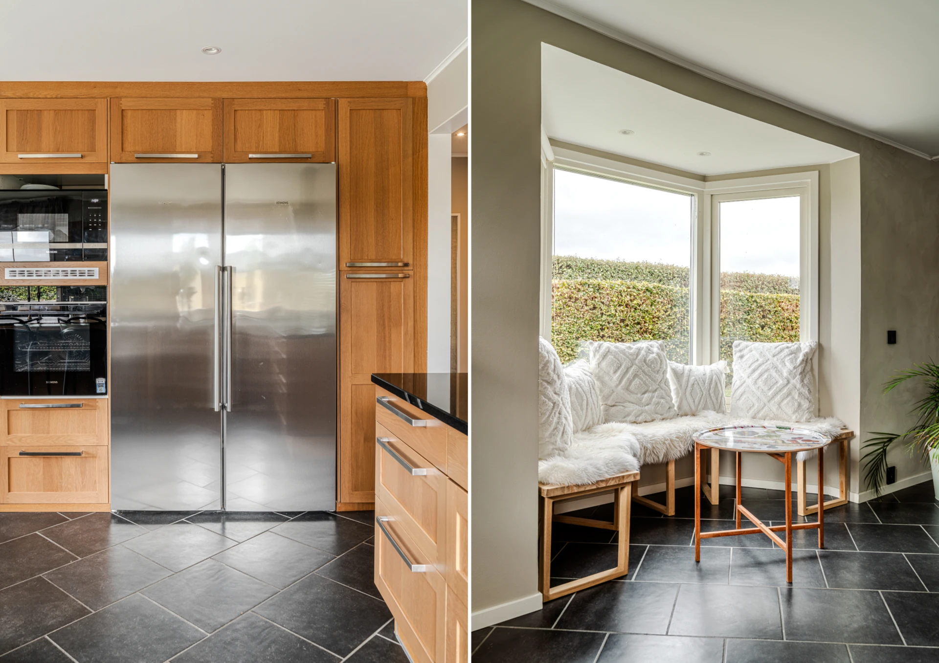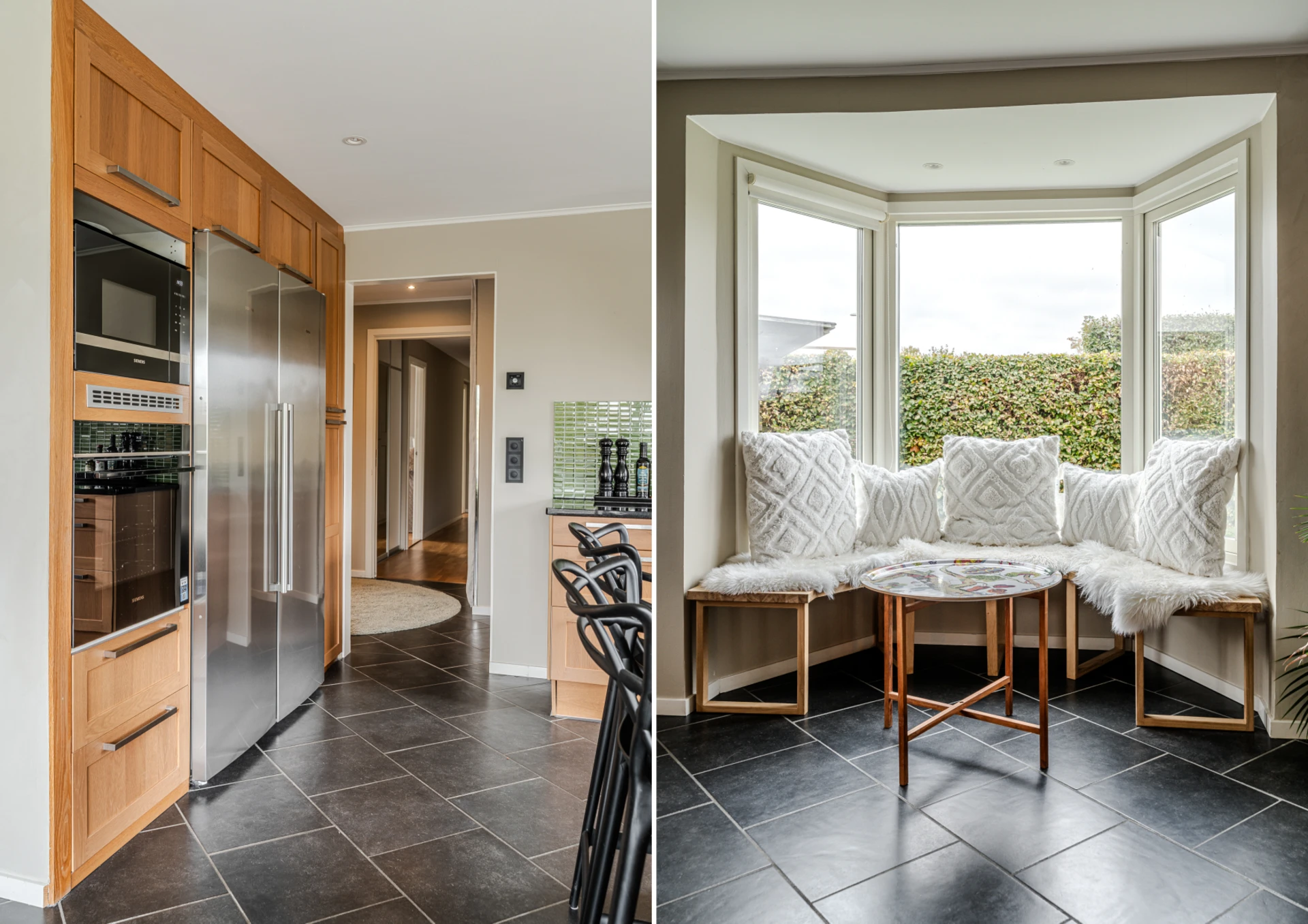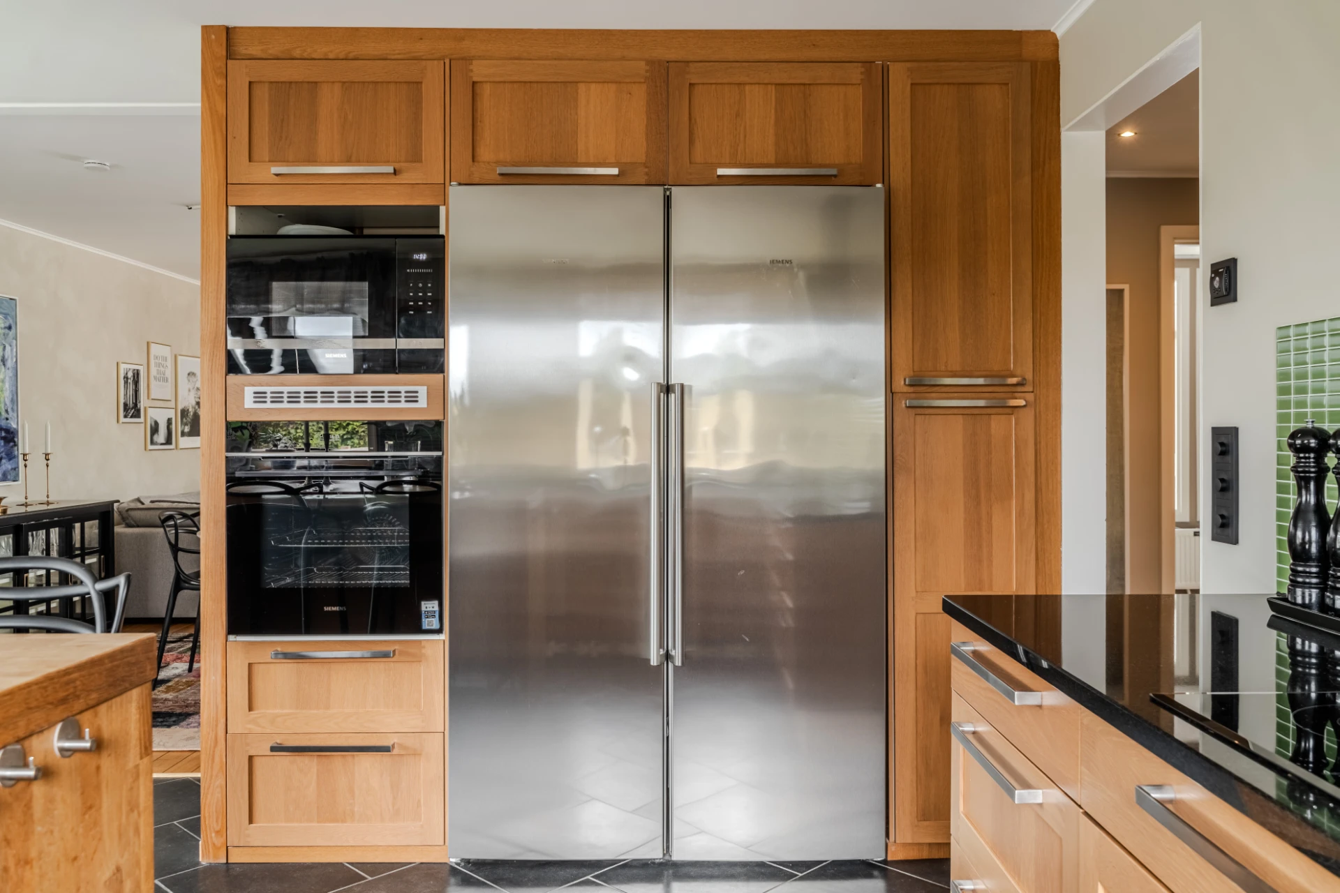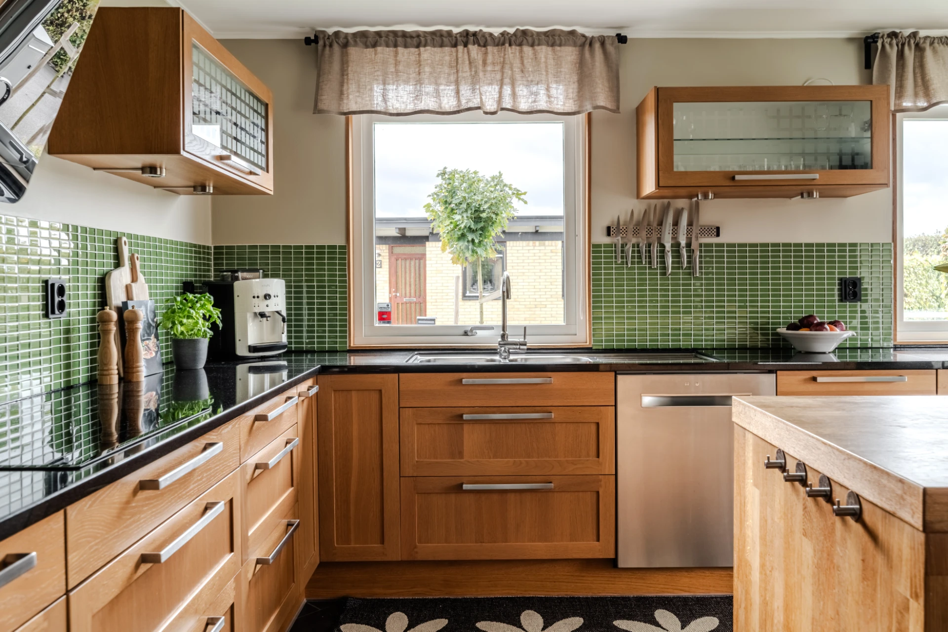 Mörkgrå klinker och väggar målade i ljust beige. Köksinredning i ek från IKEA, köksbänk i granit och stänkskydd i ljusgrönt kakel. Köket är utrustat med kyl och frys (Siemens), induktionshäll (Smeg), inbyggd ugn, inbyggd mikro (Siemens, 2024), fläkt, vinkyl och diskmaskin (Bosch). Förvaring i städskåp och skafferi. Spotlights med dimmer över arbetsbänk och i tak.