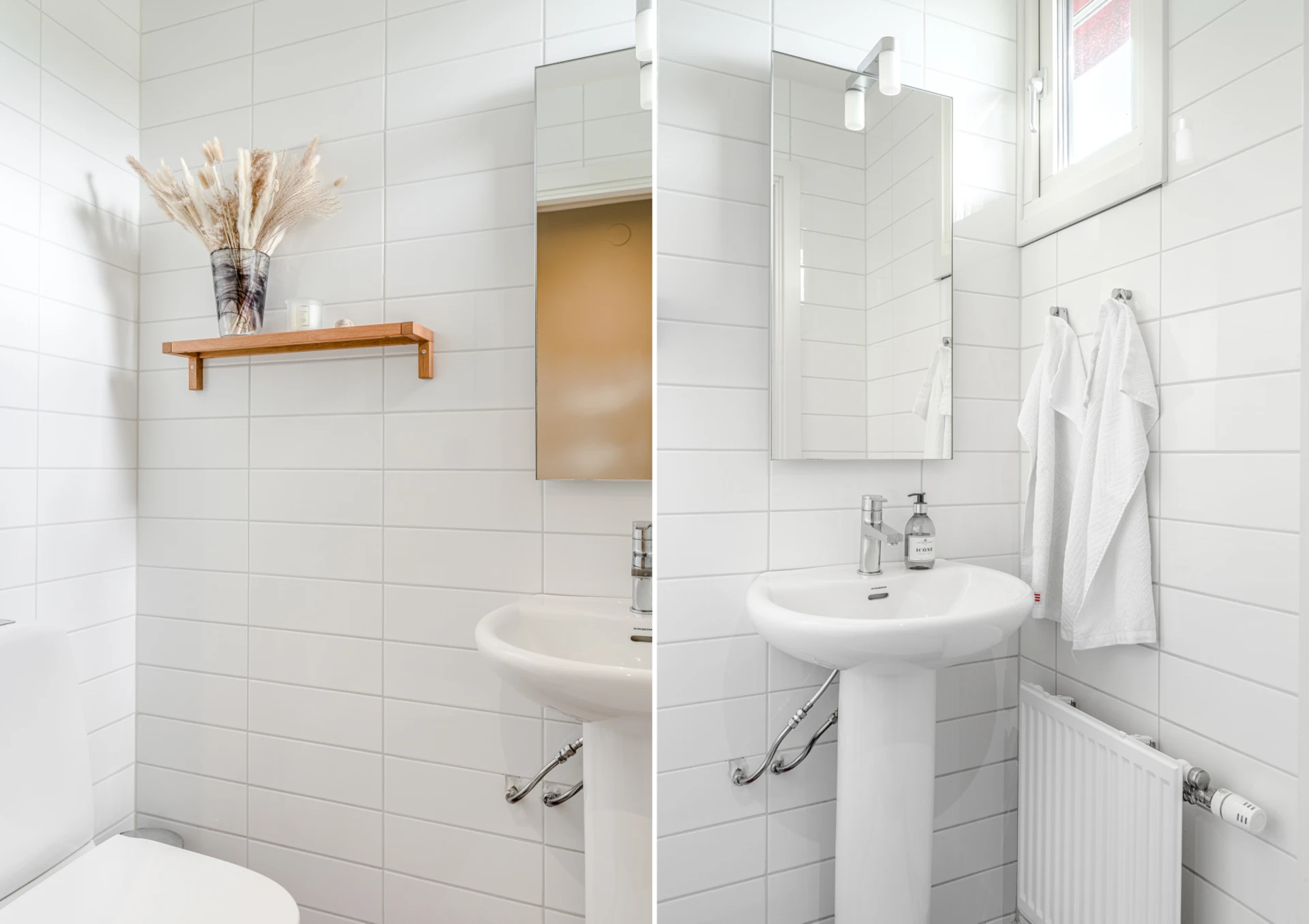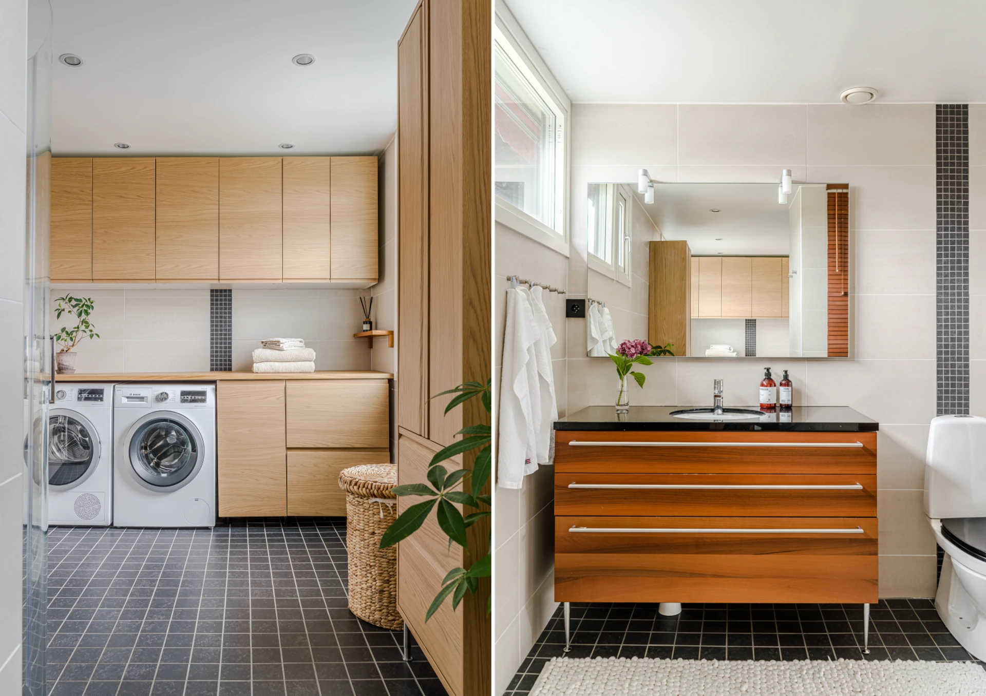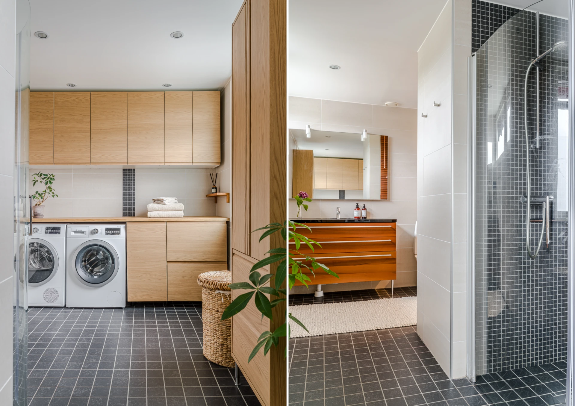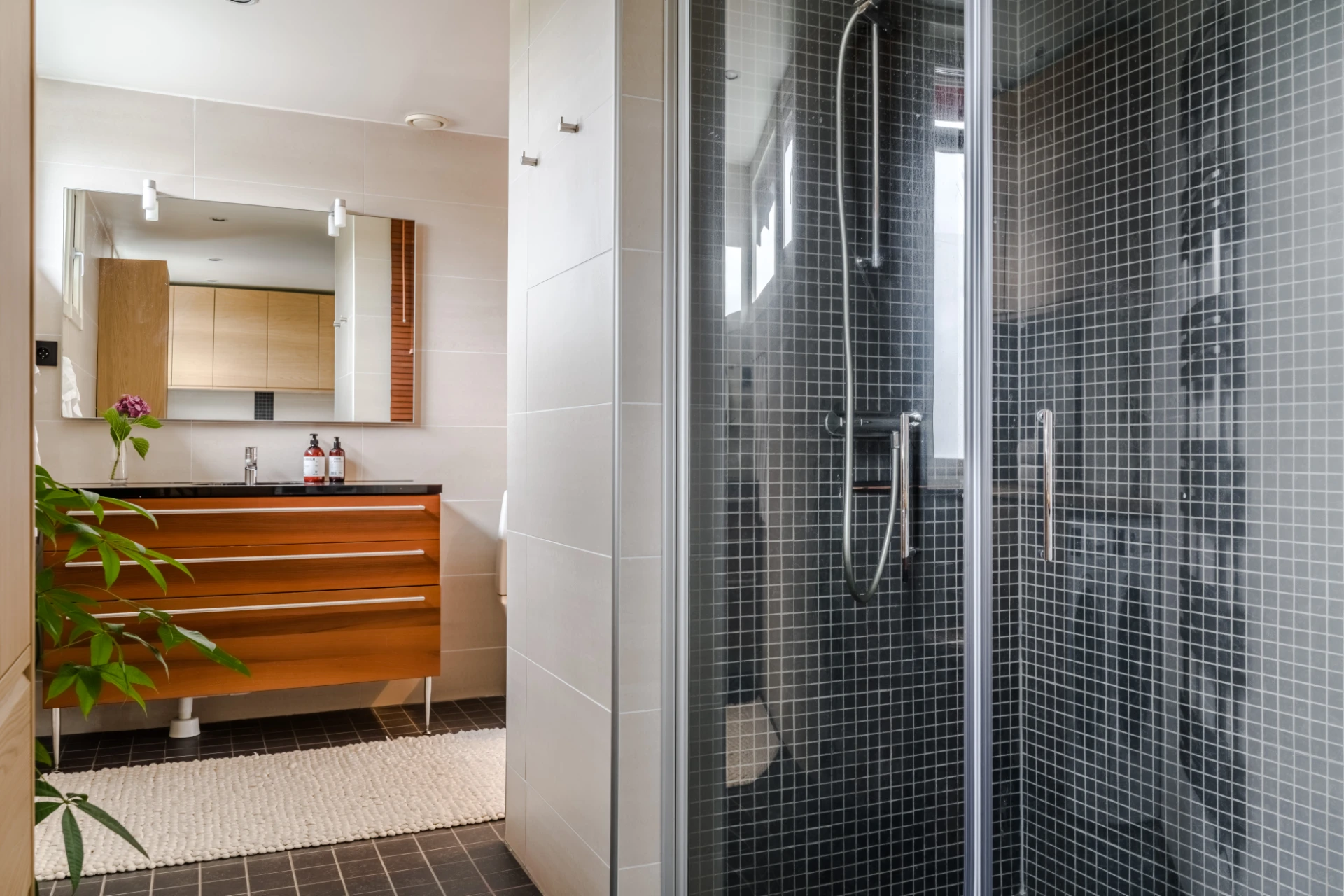 Mörkt grå klinker och ljusbeige kakel. Badrummet är utrustat med WC, handfat med kommod, spegel, dusch och handdukstork. Badrummet är även utrustat med en tvättmaskin och torktumlare (Bosch), arbetsbänk och gott om plats för förvaring i kommod, högskåp, lådor och överskåp. Golvvärme och spotlights med dimmer.