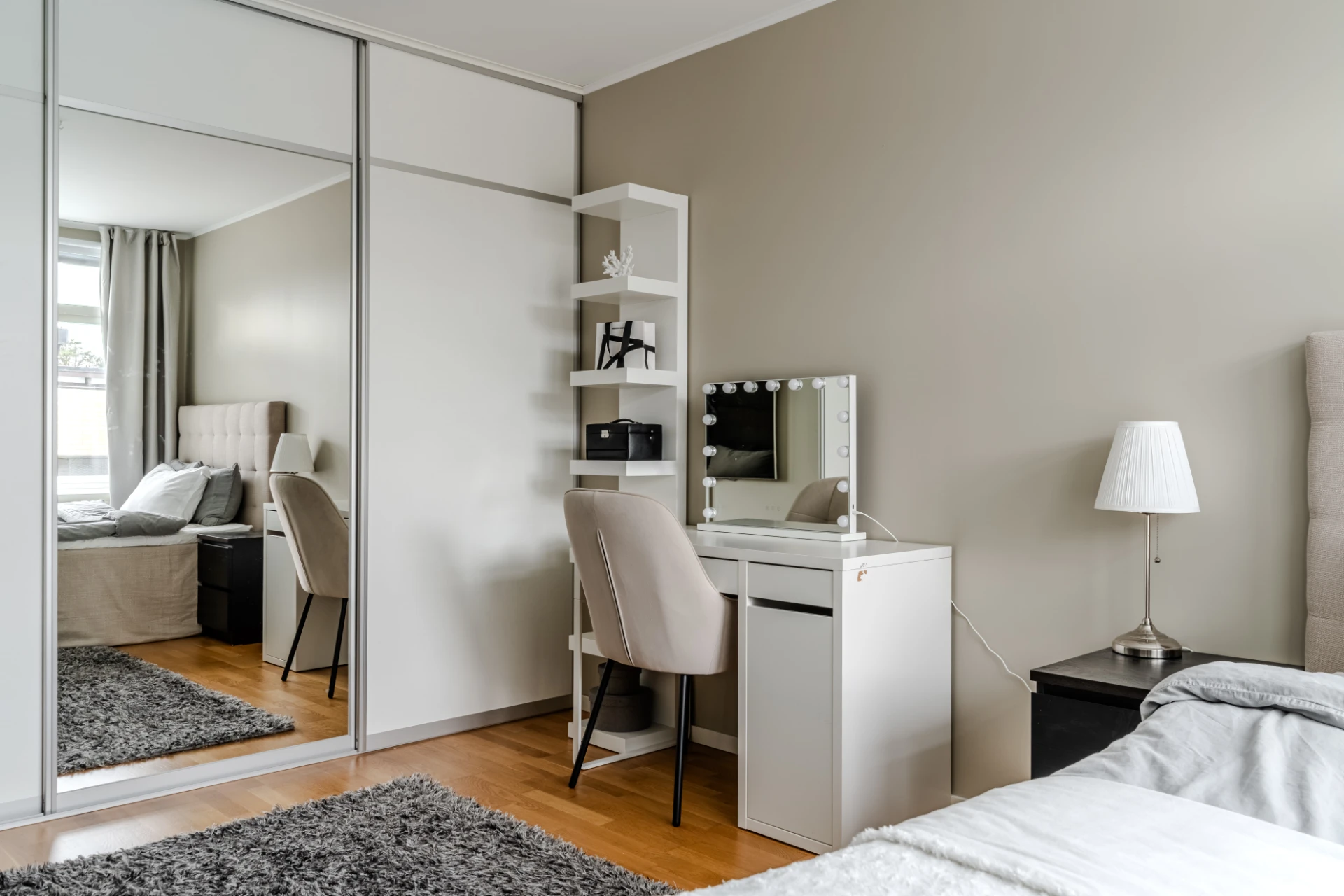 Parkettgolv och väggar målade i ljust beige. Förvaring i skjutdörrsgarderob.