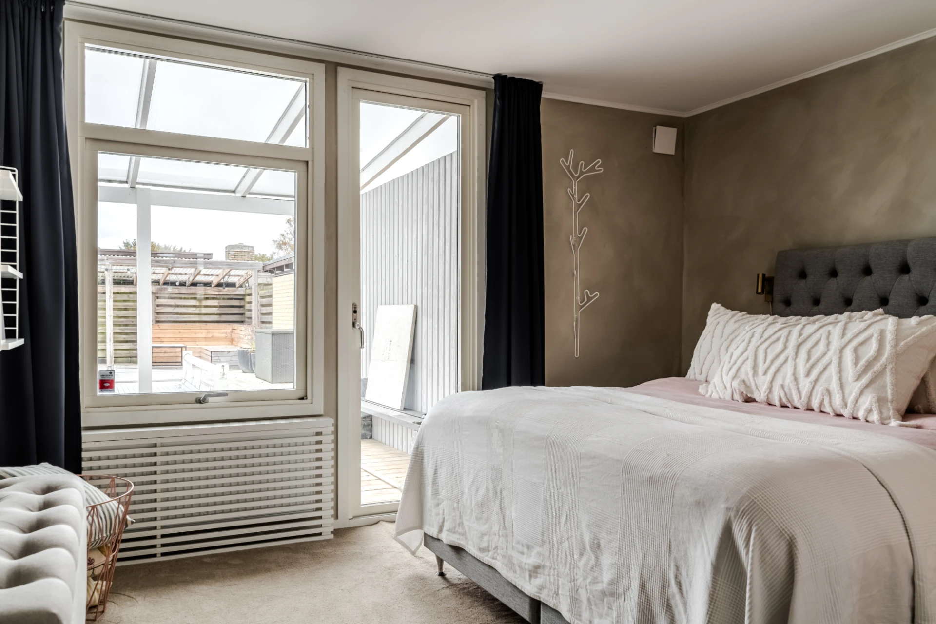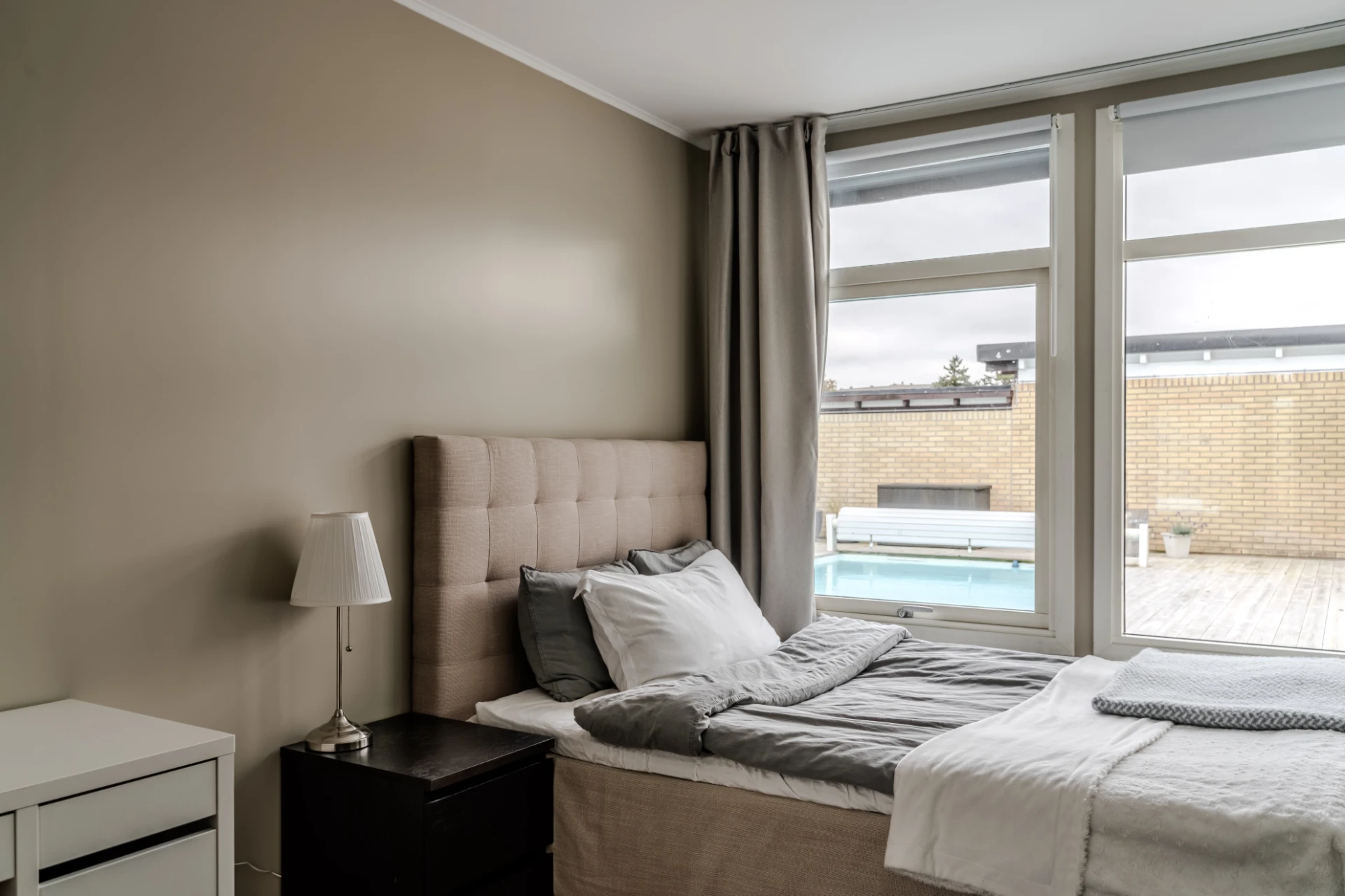 Parkettgolv med heltäckningsmatta ovanpå, väggar målade i kalkfärg från Jotun i ljust beige. Förvaring i klädkammar. Utgång till trädäck och poolområde.