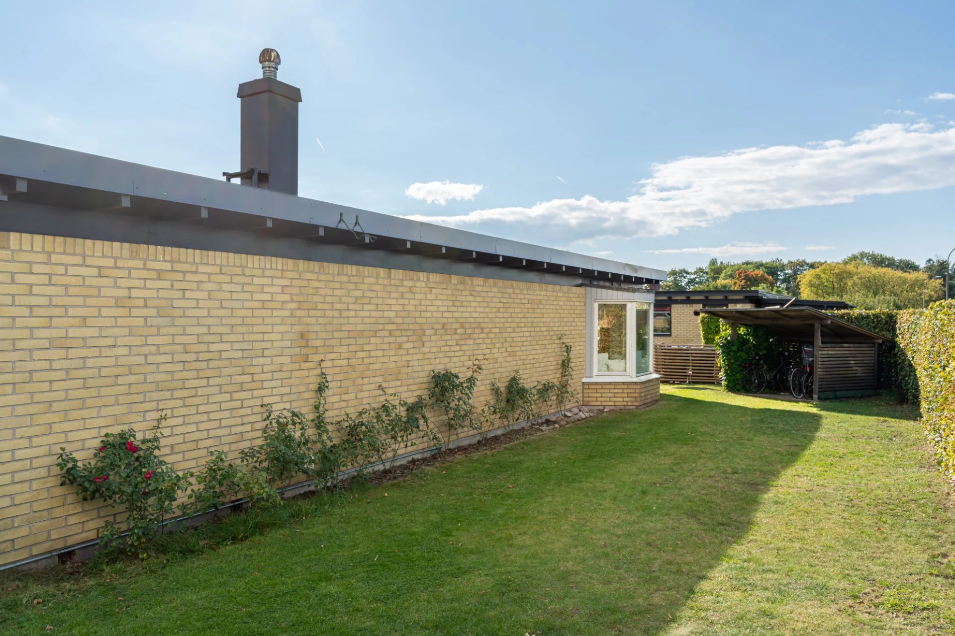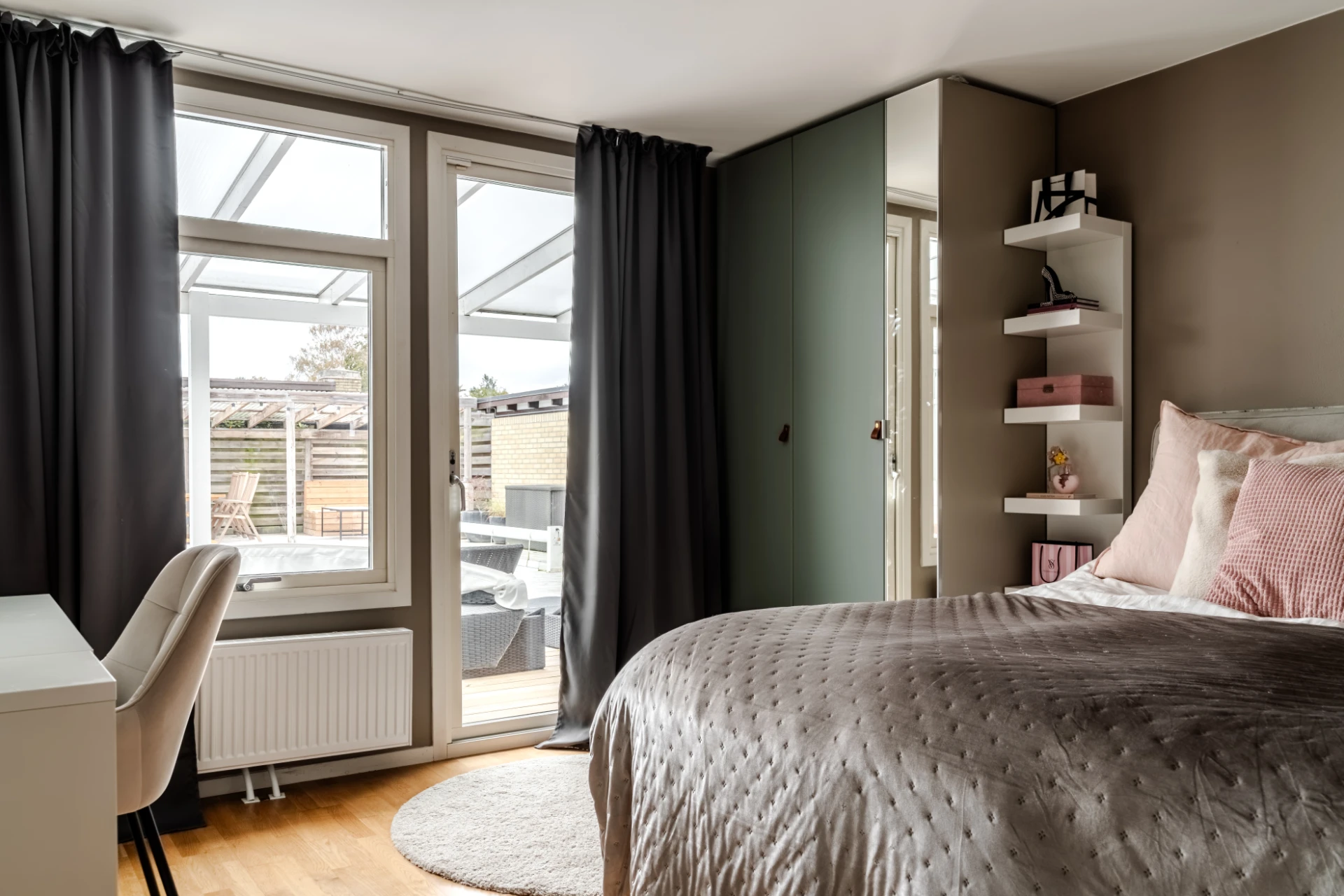 Parkettgolv och väggar målade i mörkare beige, Jotun "Marrakech". Förvaring i två garderober. Utgång till trädäck och poolområde.