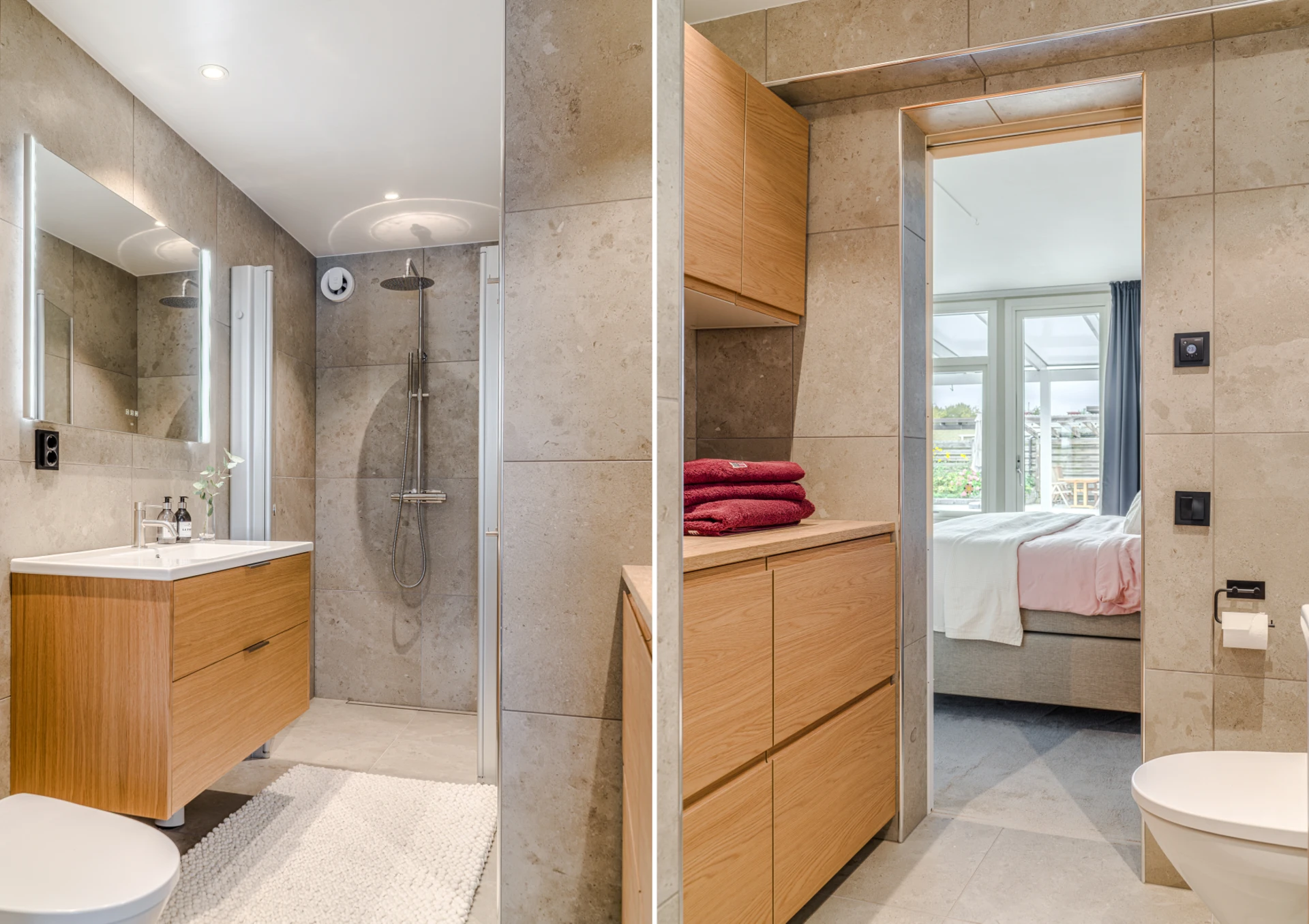 En suite till master bedroom. Beige 60x60 klinker och kakel. Badrummet är utrustat med inredning från INR. Här finns WC, handfat med kommod, spegel, dusch och handdukstork. Förberett för tvättmaskin. Golvvärme och spotlights med dimmer.