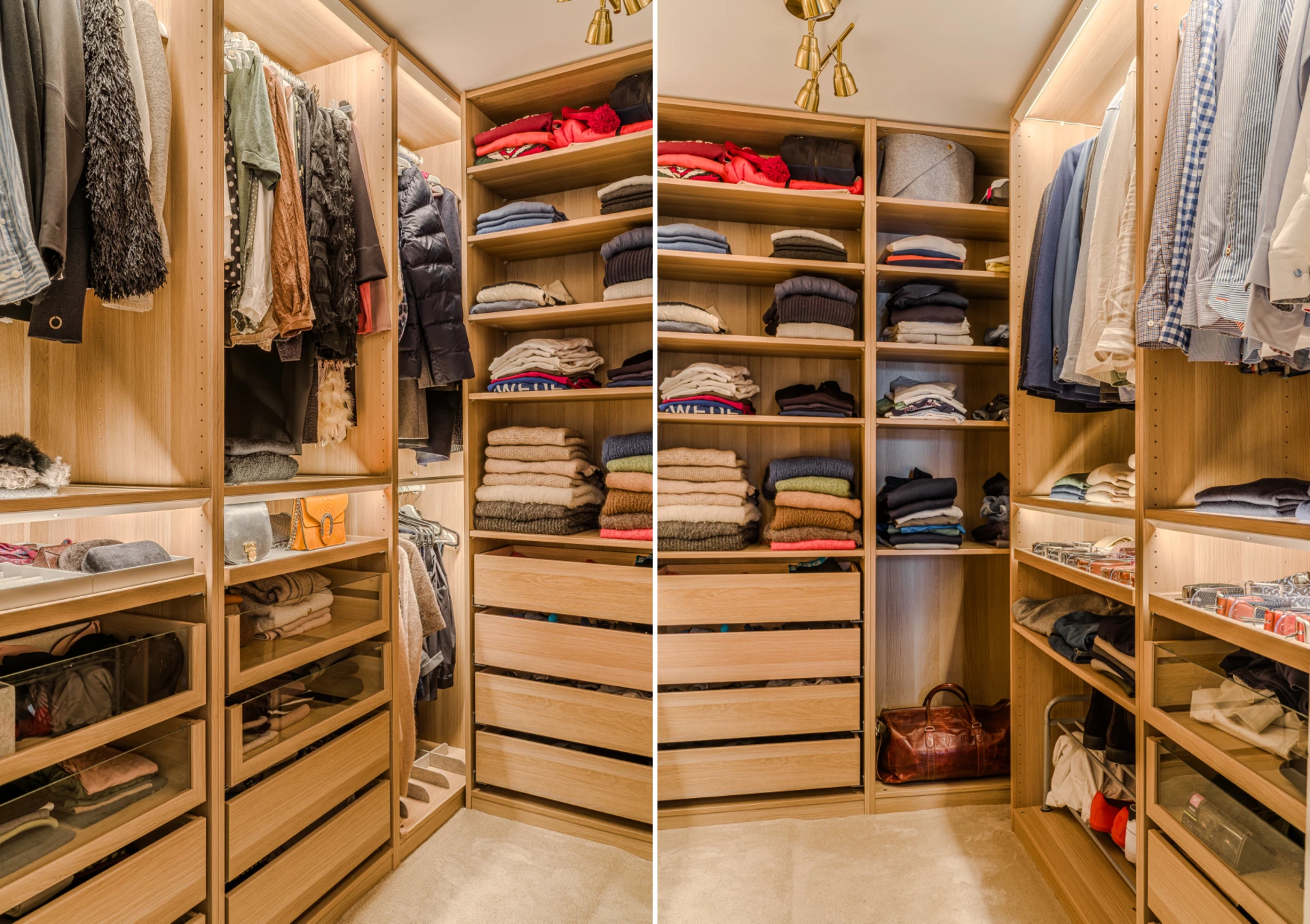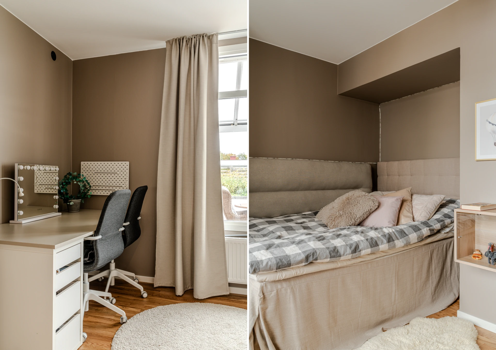 Parkettgolv och väggar målade i mörkare beige, Jotun "Marrakech". Förvaring i garderob.
