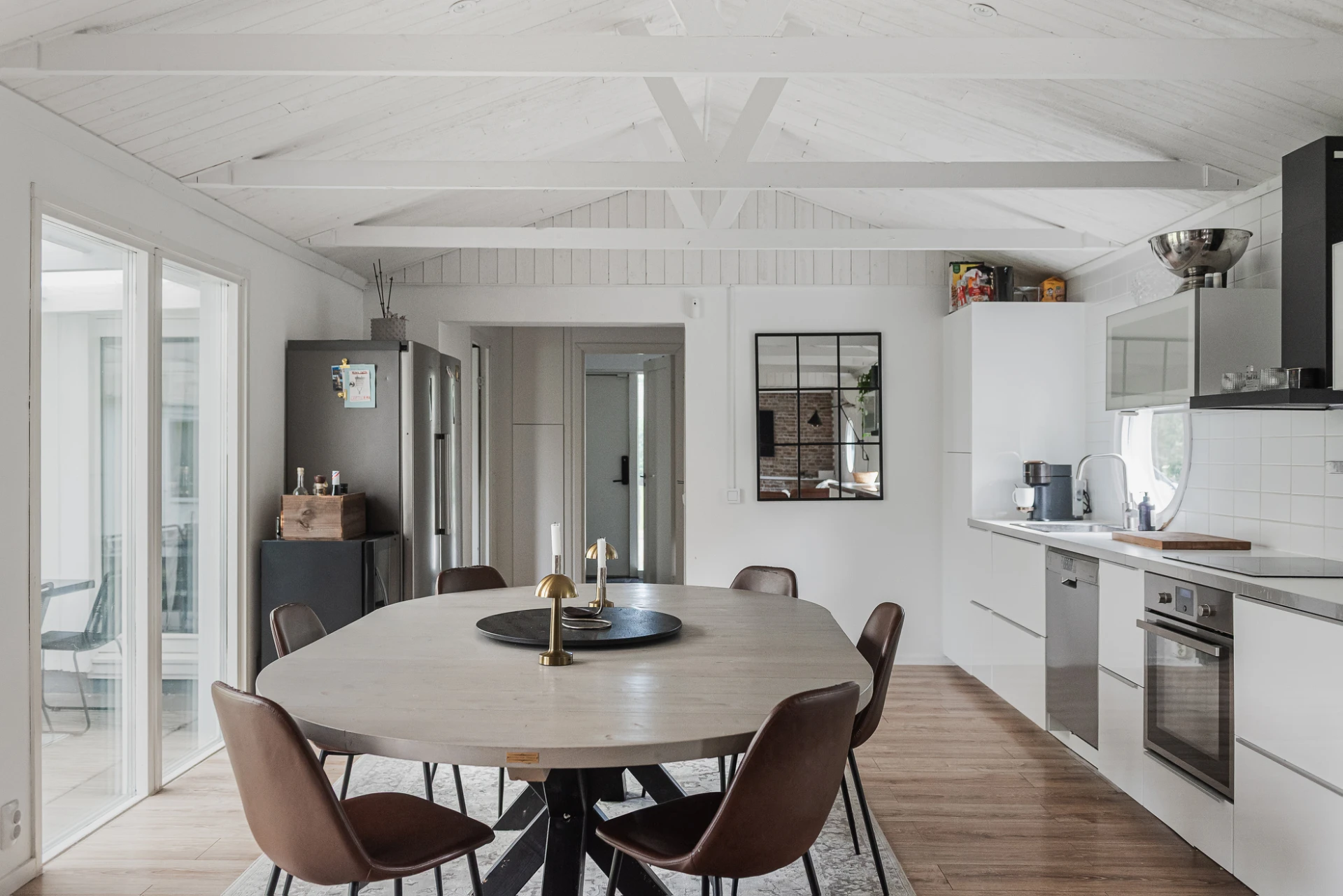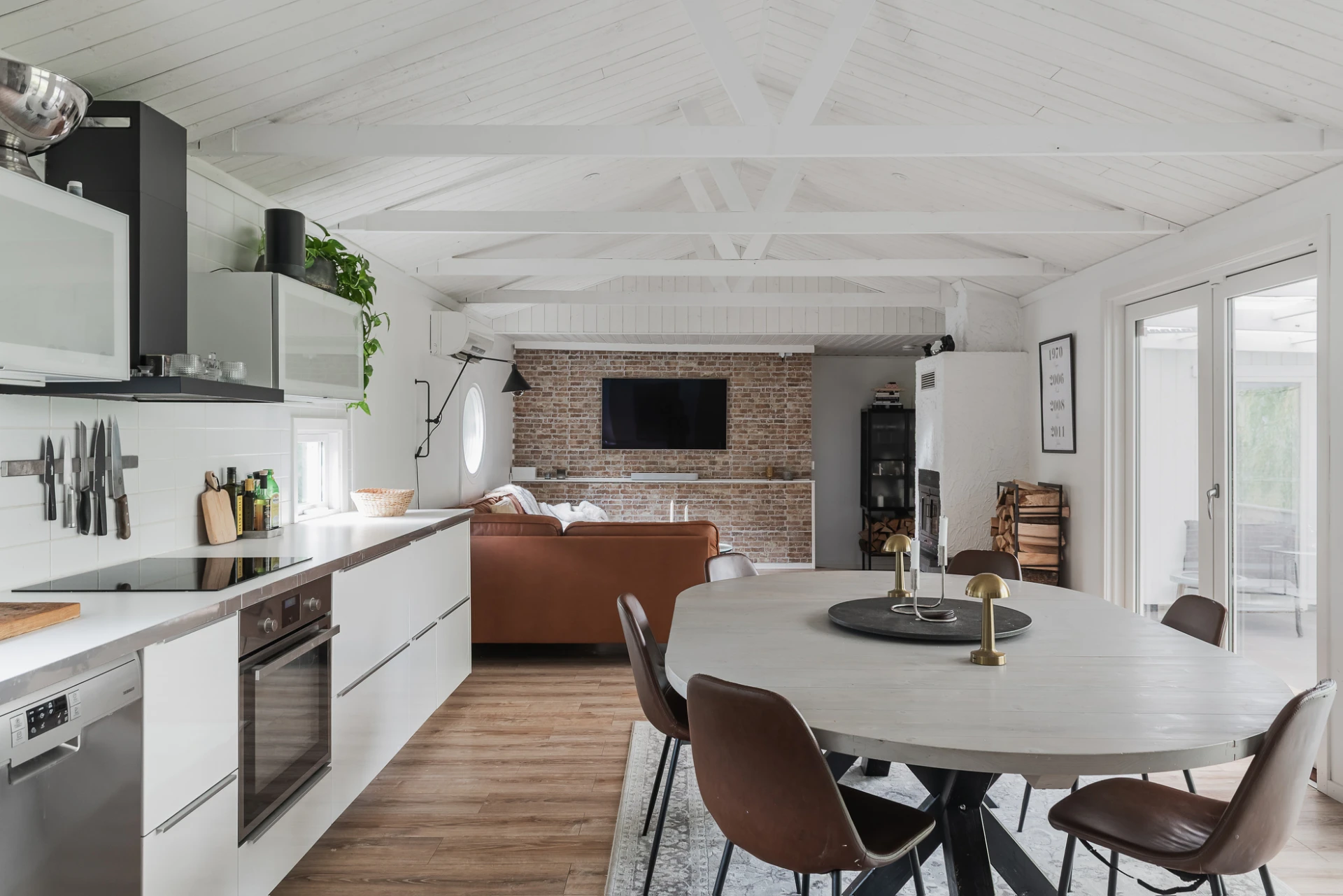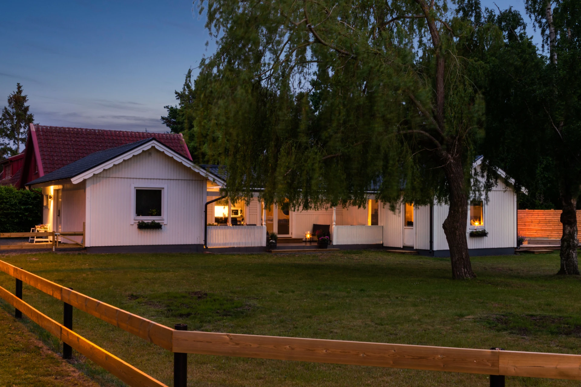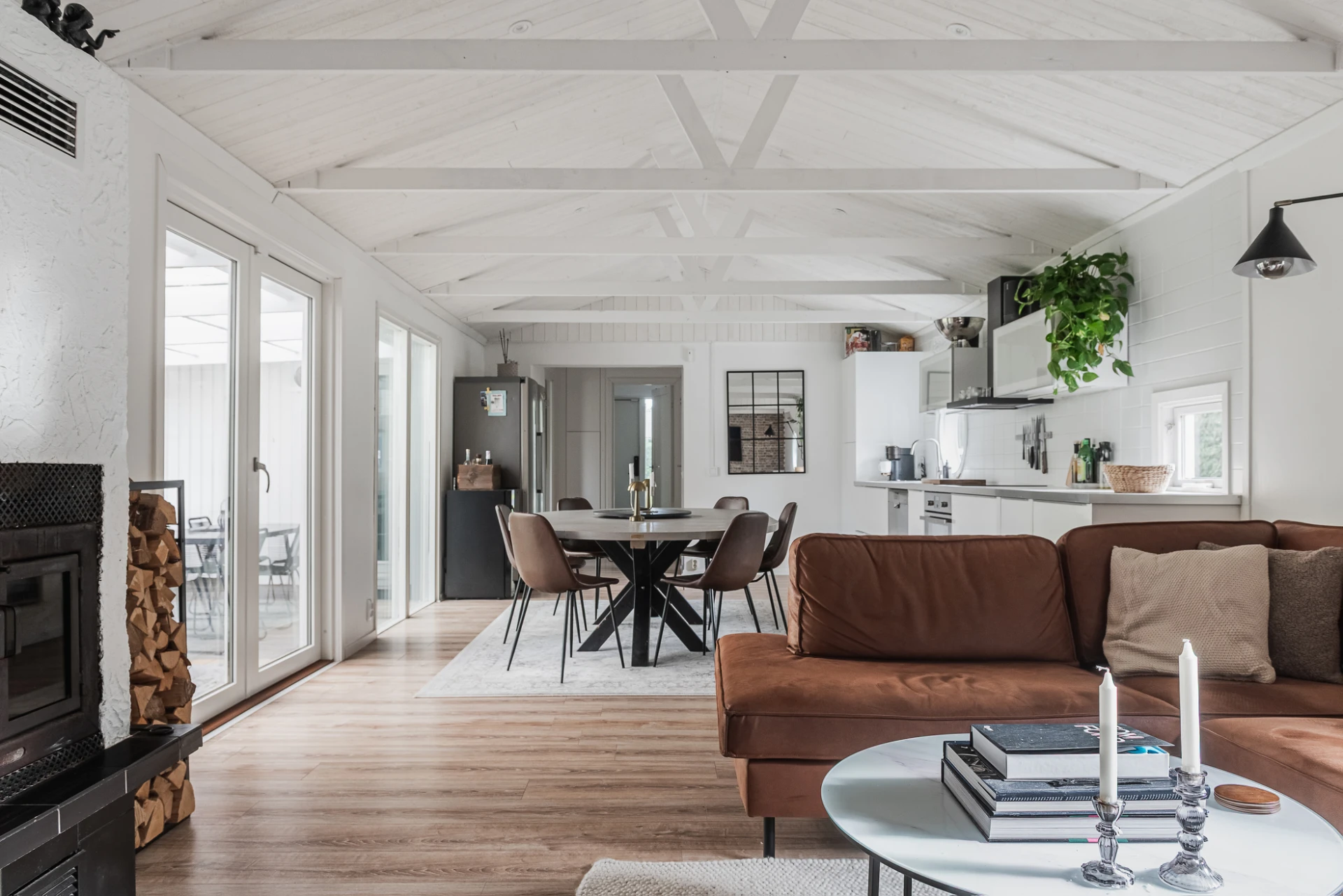 Huset erbjuder fyra väl tilltagna sovrum, gott om smarta förvaringslösningar och generösa fönsterpartier som låter ljuset flöda fritt genom rummen. I vardagsrummet möts du av en inbjudande eldstad som sprider värme och skapar extra trivsel under årets kallare dagar. De vackra synliga takbjälkarna tillsammans med den öppna planlösningen mellan kök och vardagsrum ger en härlig rymd och en varm atmosfär, en naturlig samlingsplats för både familj och vänner.