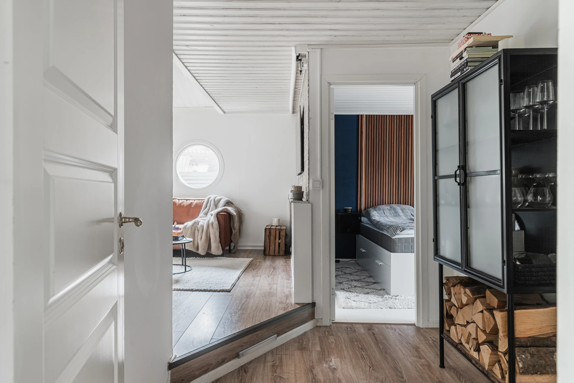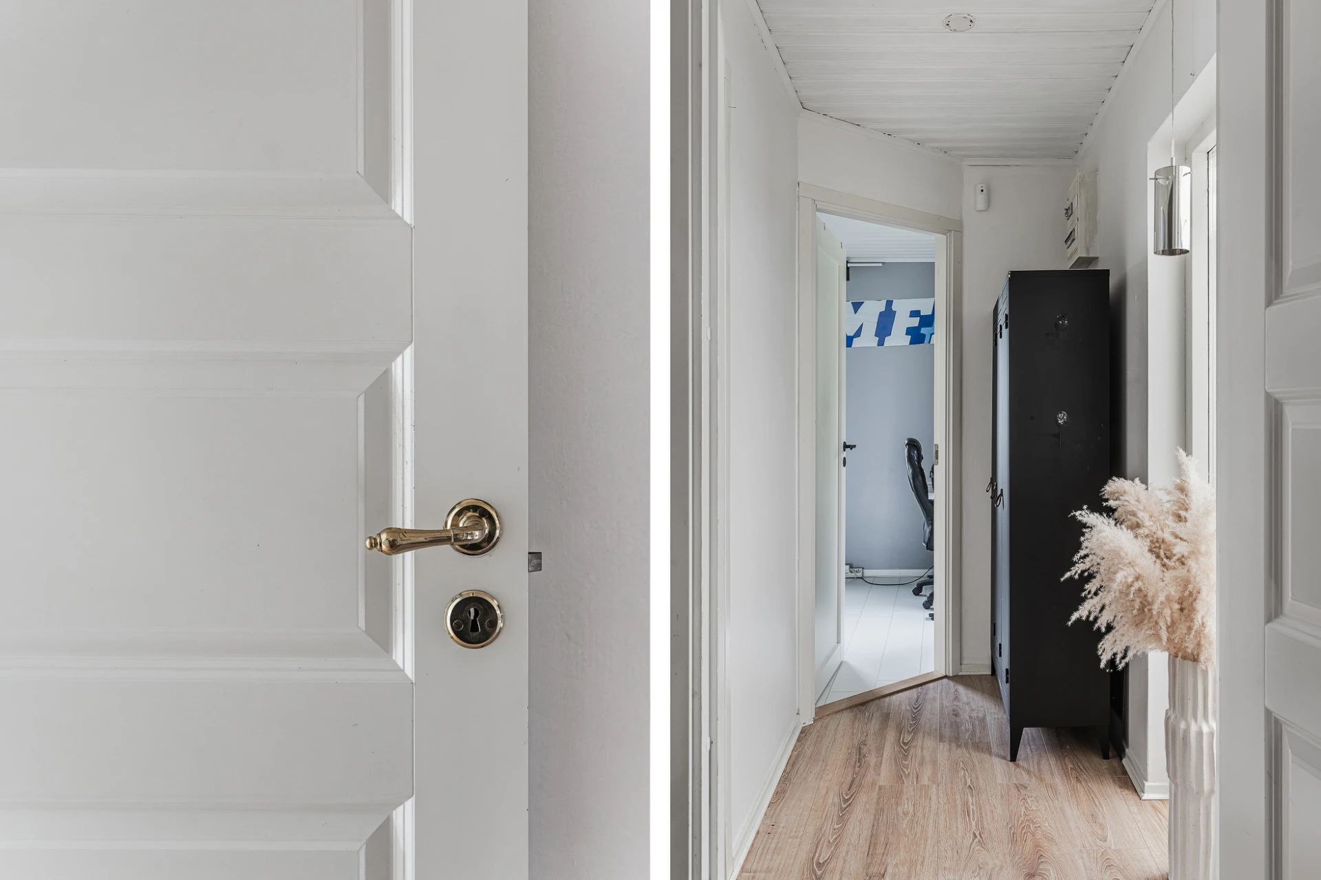 Ljust laminatgolv och väggar målade i vitt och ljust grå.