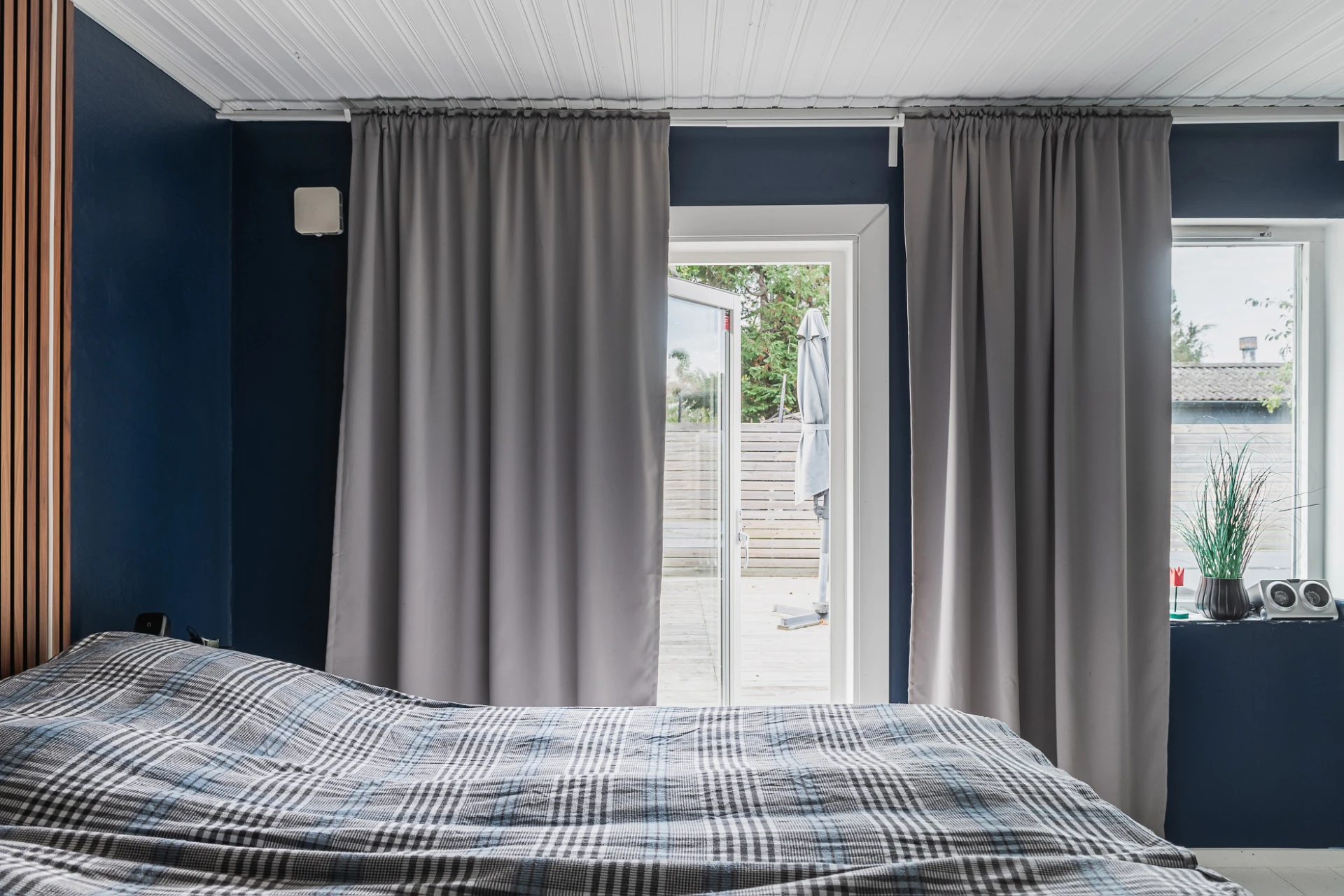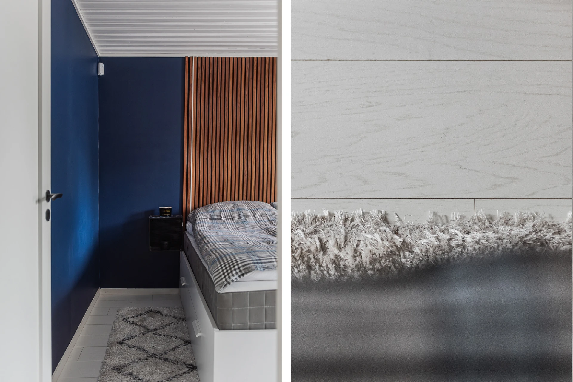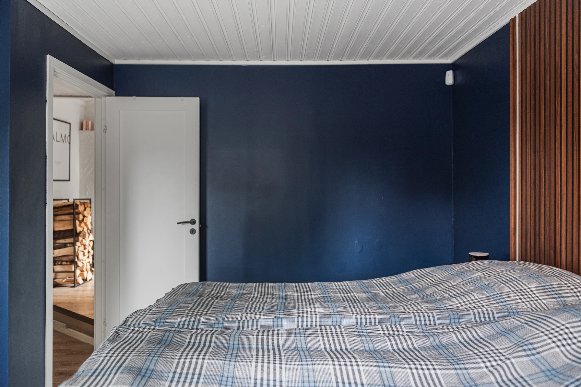 Ljust laminatgolv och väggar målade i mörkblått. Ingång till klädkammare och utgång till trädäck med pool och spabad i sydöstläge.