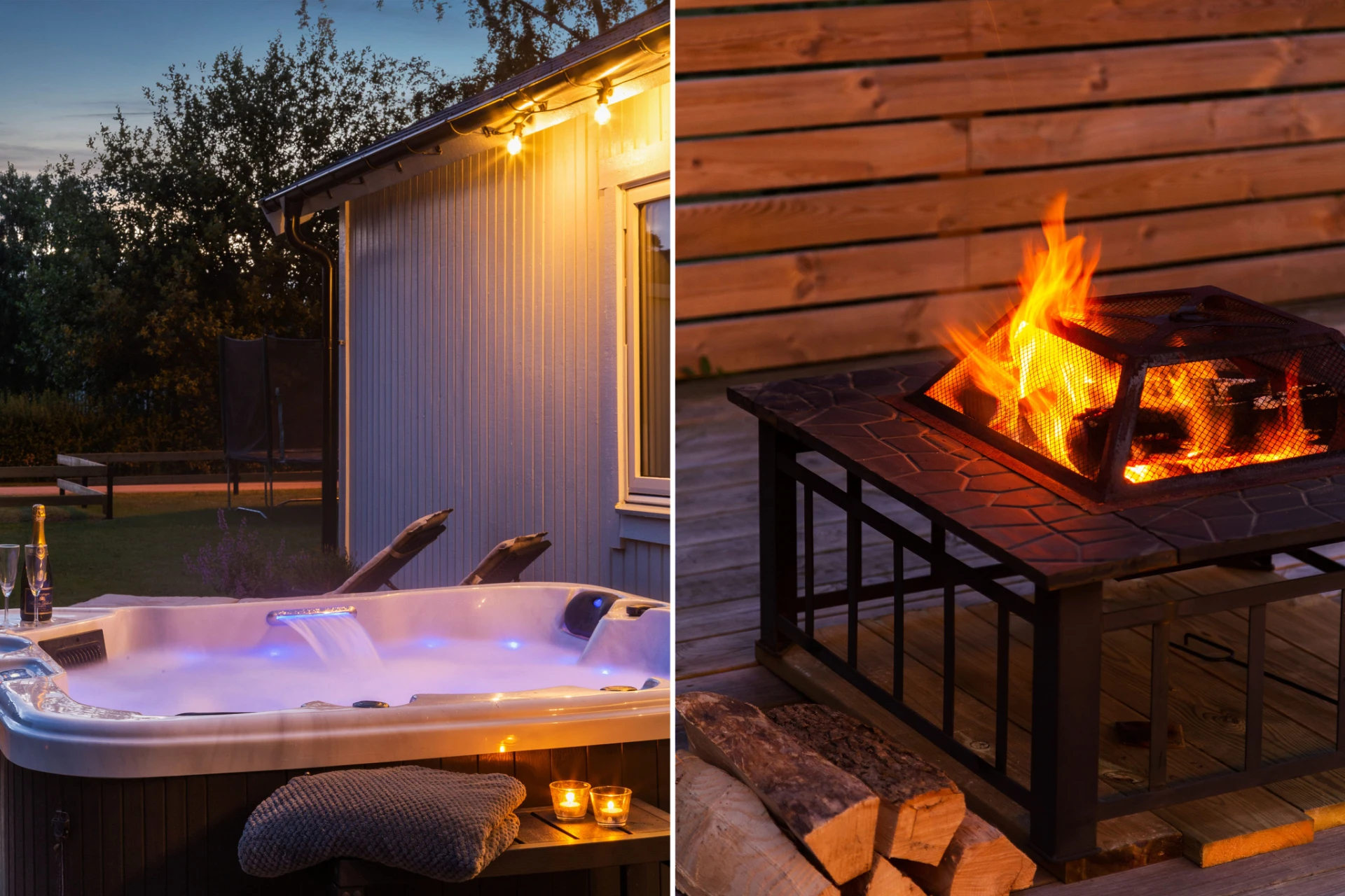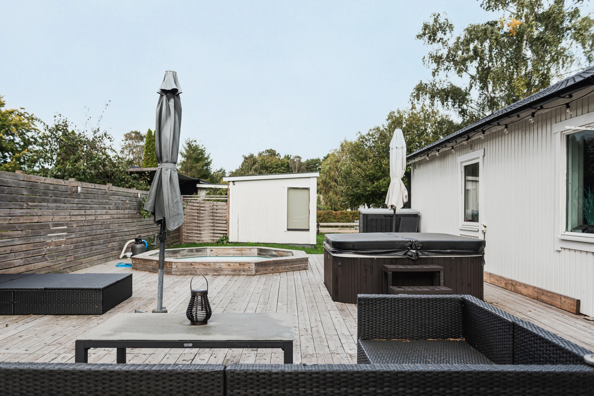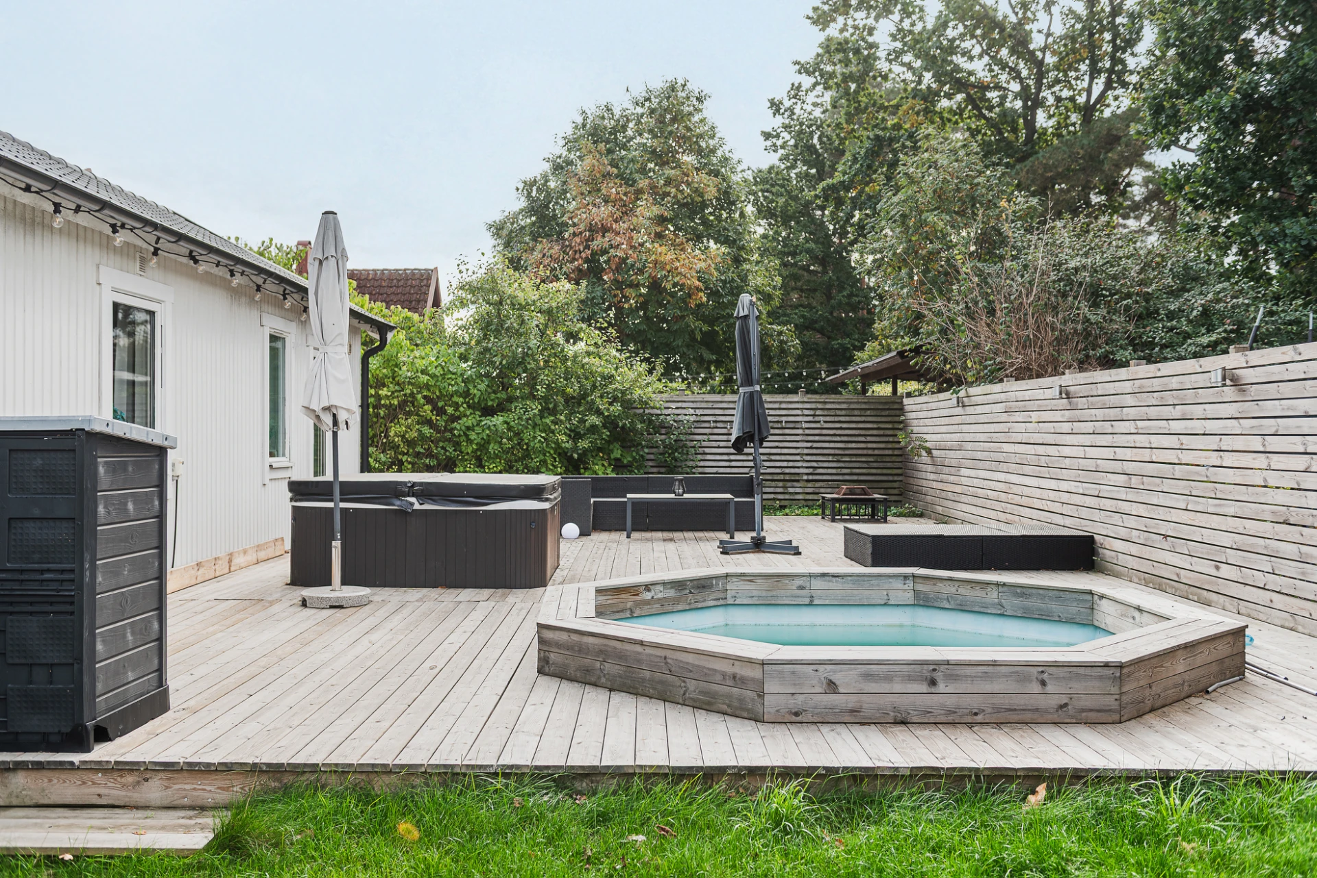 Trädgården är en liten oas som bjuder in till avkoppling och umgänge. Här finns ett stort trädäck, altan, spabad och en mindre pool som gör sommardagarna till något alldeles extra. Perfekt för både lugna stunder med familjen som för festliga tillställningar.