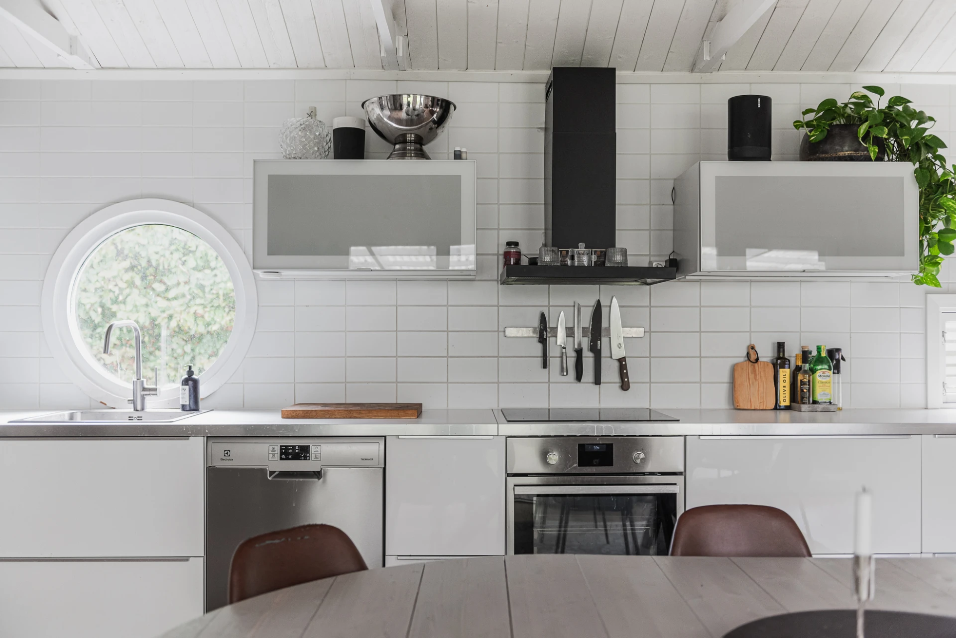 Laminatgolv och vita väggar. Köket är utrustat med kyl, frys, diskmaskin, induktionshäll, ugn och fläkt. Eldstad och utgång till uteplats i sydvästläge.