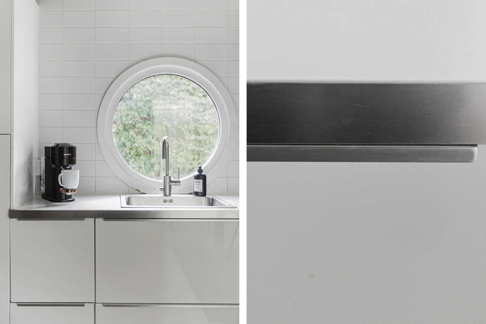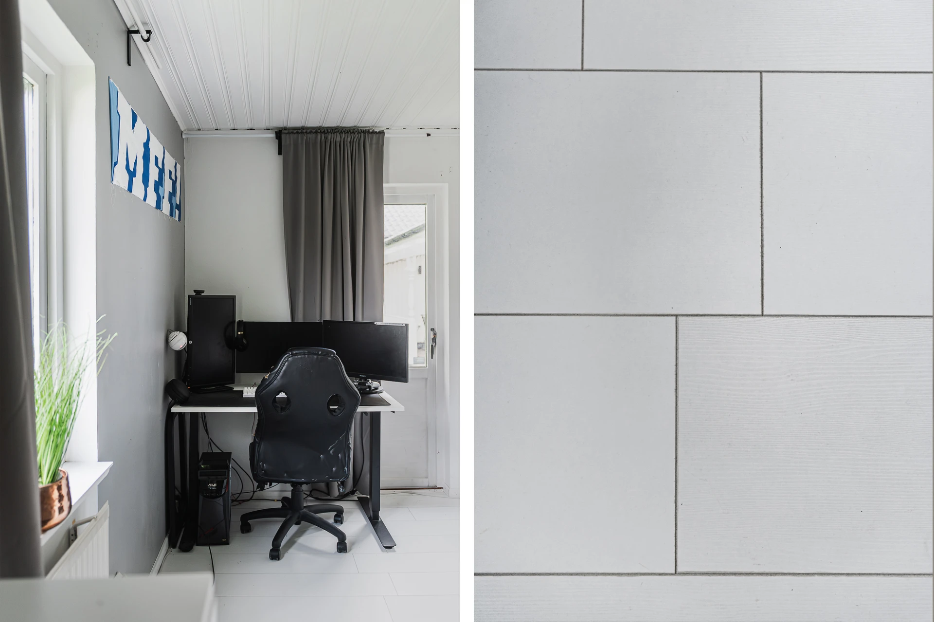 Ljust laminatgolv, väggar målade i vitt och grått.