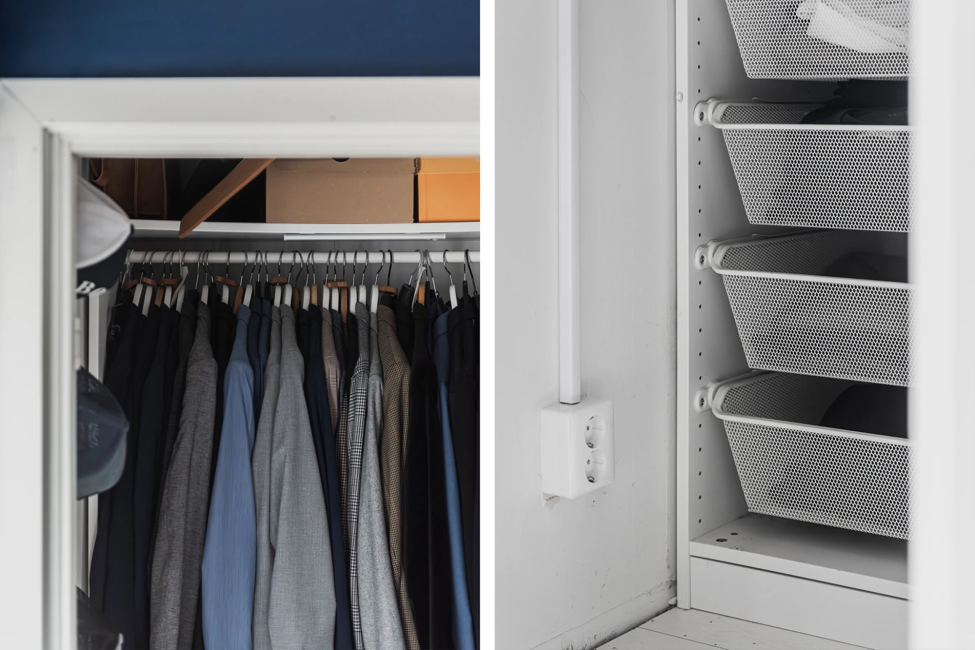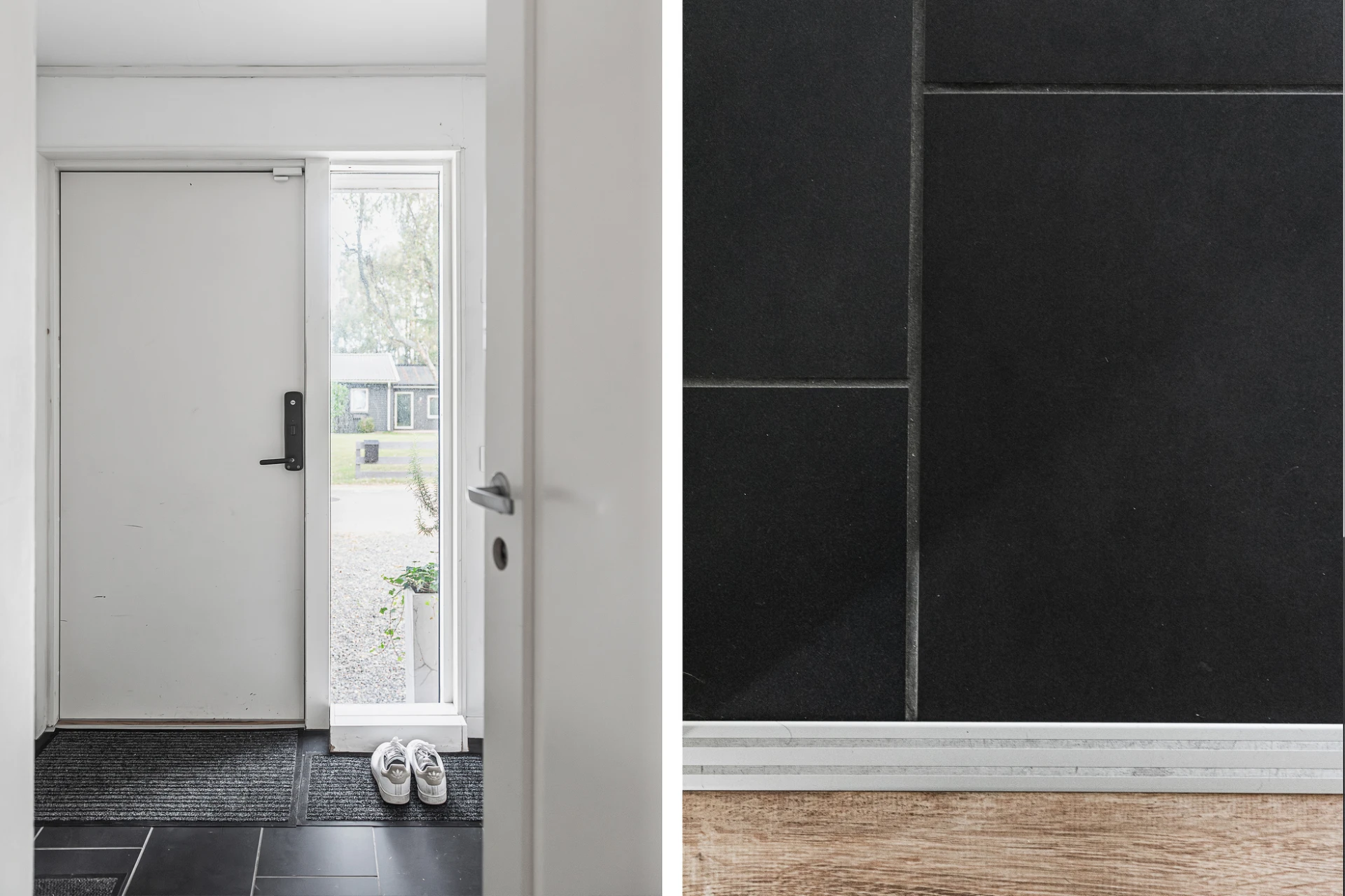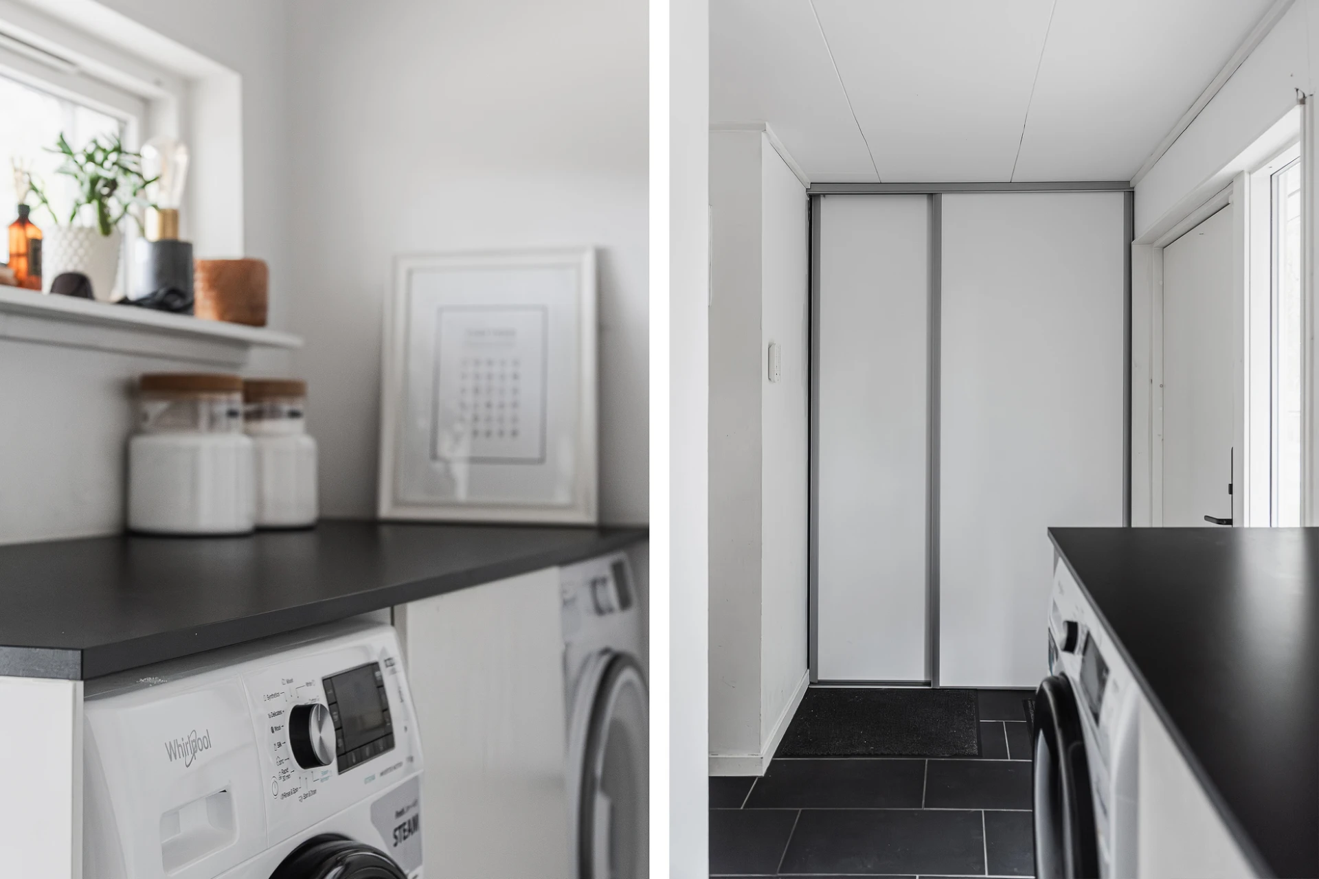 Mörk klinker och vita väggar. Plats för avhängning, förvaring i två garderober, städskåp, tvättmaskin och torktumlare.